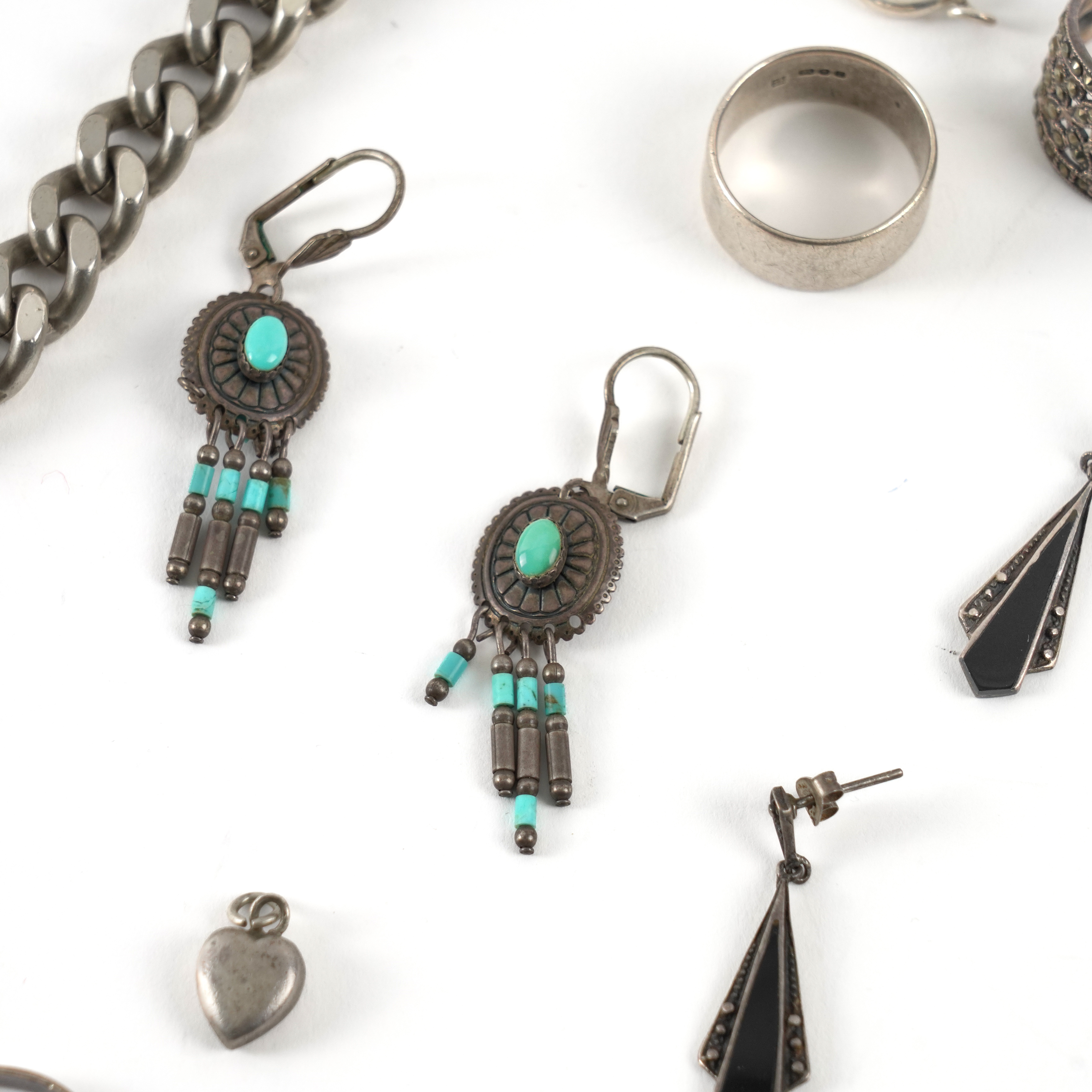 Comprising; a rectangular cigarette case, Birmingham 1936, a New Zealand paua shell spoon, a faceted curb link bracelet, three rings, two pairs of earrings, two pendants and a neckchain, combined gross weight 250 grams