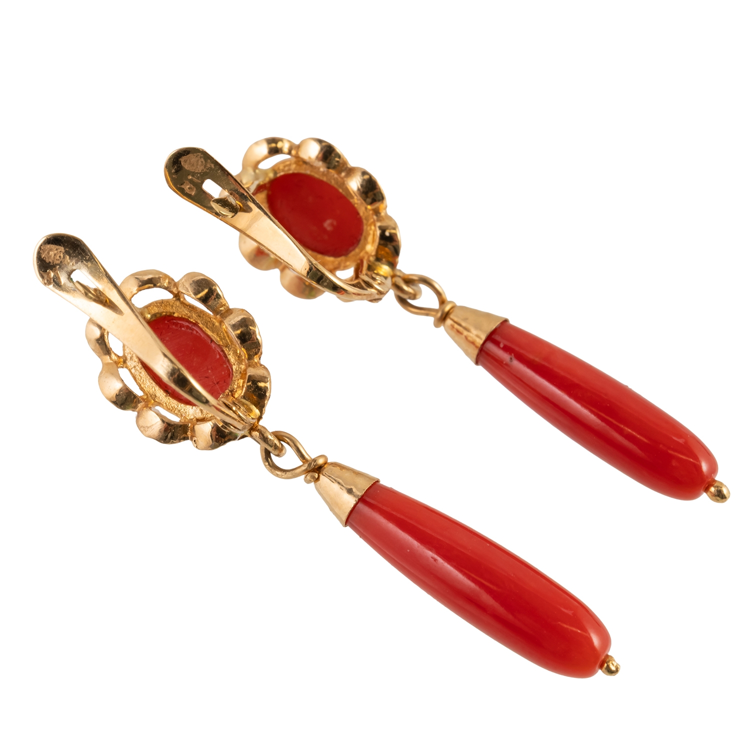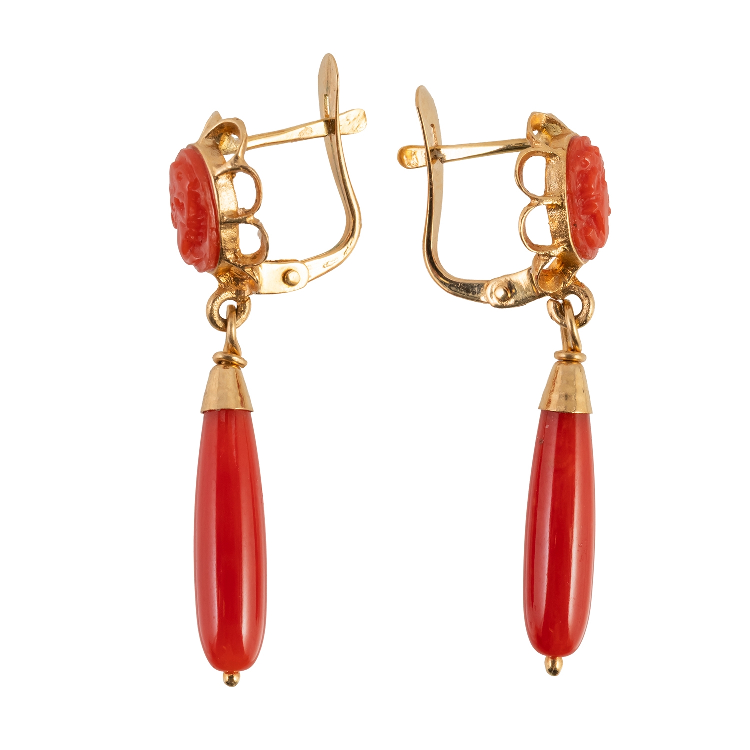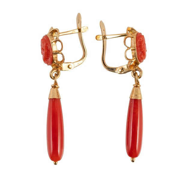 A PAIR OF GOLD AND CORAL PENDANT EARRINGS