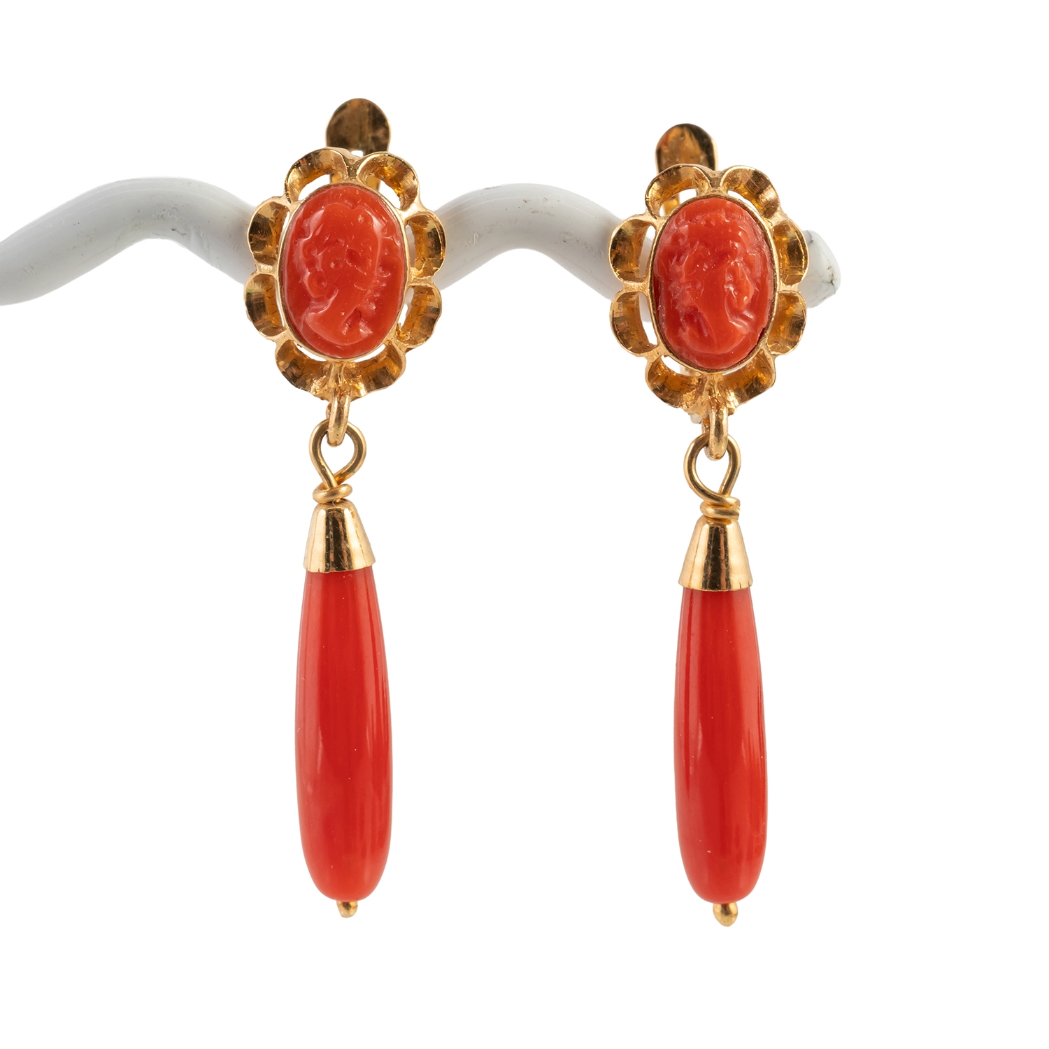 Each with a portrait cameo mounted at the top, within a lobed surround and with coral drops, the backs of post and folding clip fittings detailed 750, measuring 3cm, gross weight 2.8 grams