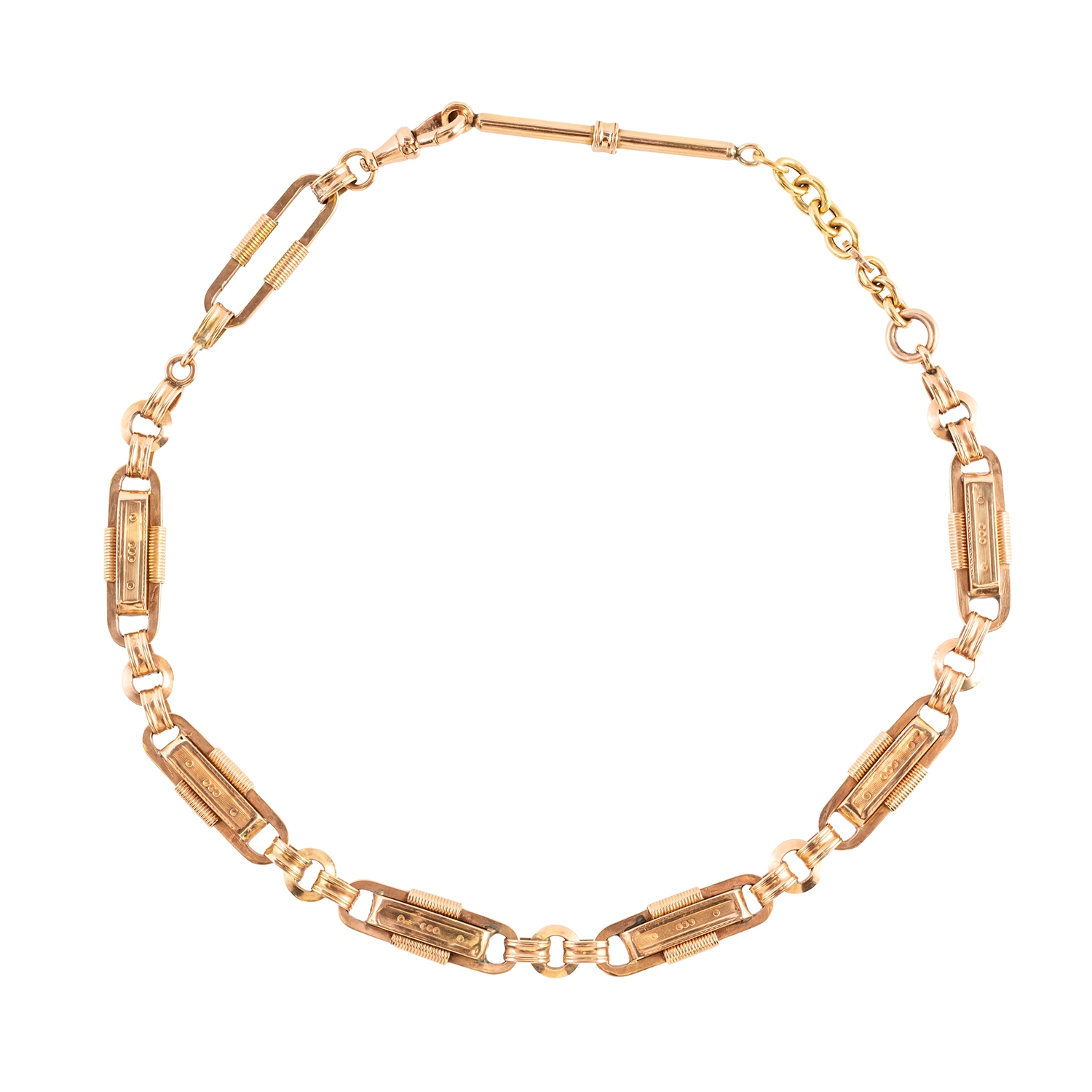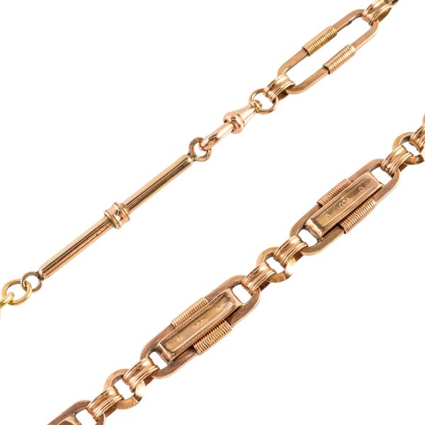 In a fancy paperclip design with additional links added, in unmarked gold, measuring 43cm, with swivel clasp, gross weight 27.6 grams