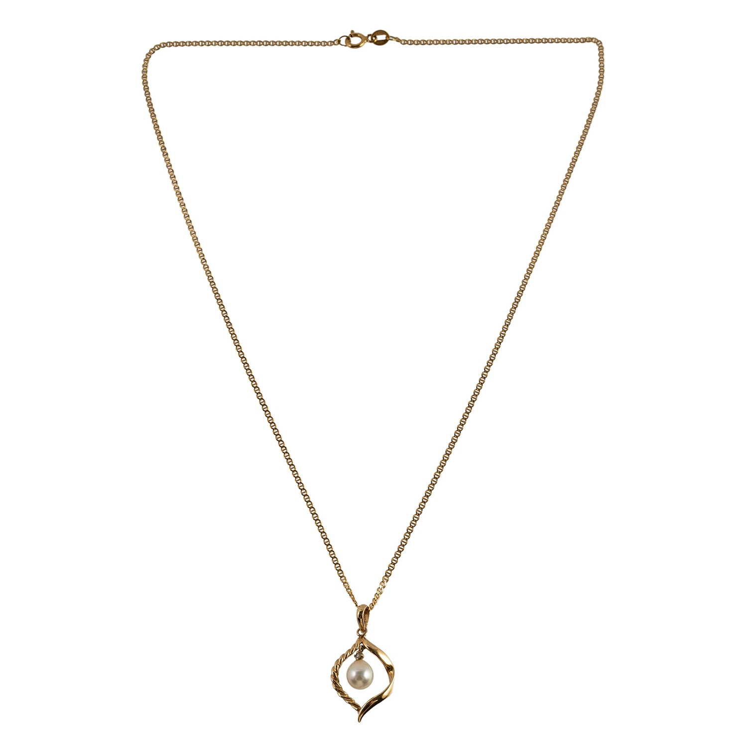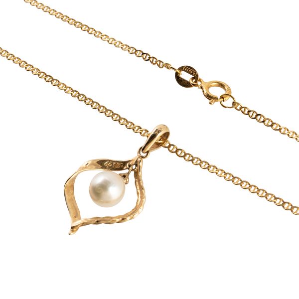 The pendant mounted with a single cultured pearl to the centre and with a small round brilliant cut diamond above, detailed 585, with a gold neckchain detailed 18KT Italy, on a bolt ring clasp detailed 750, gross weight 3.7 grams
