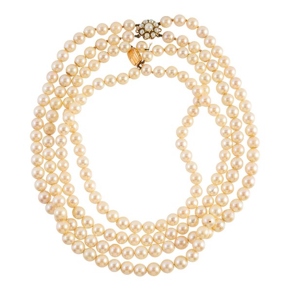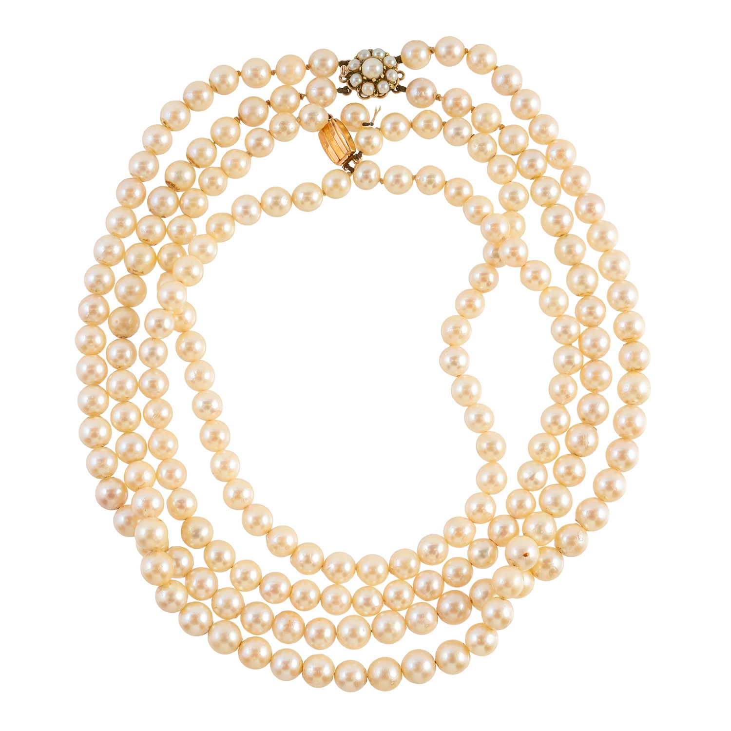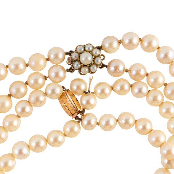 The first with 3.6mm pearls, strung with knots by the clasp, with a pearl set 9ct clasp, the shortest string measuring 42cm, together with a two row necklace, one of the rows broken, on a 9ct clasp