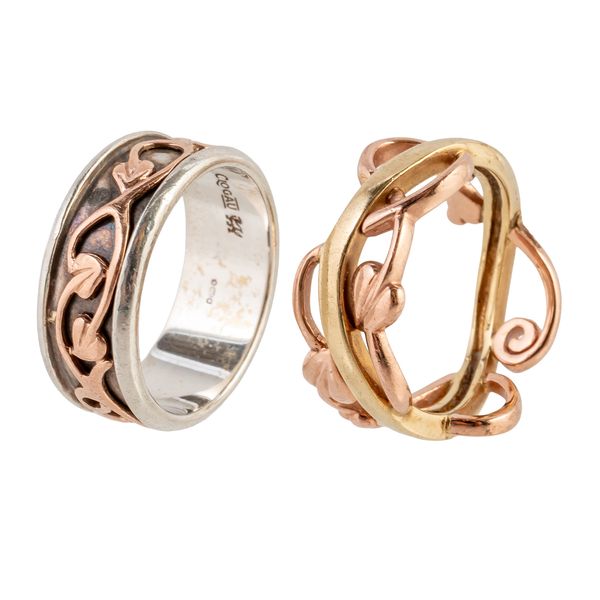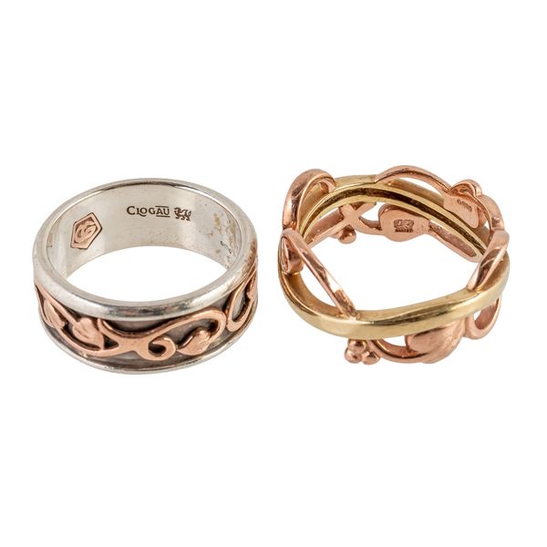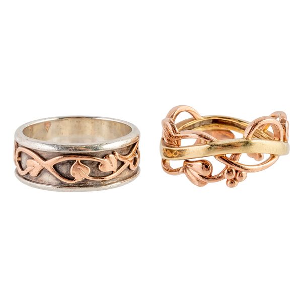 Comprising; a 9ct two colour gold ring, pierced with foliate and scroll motifs, size M½, weight 4.5 grams, and a silver and gold band ring with floral decoration, size M