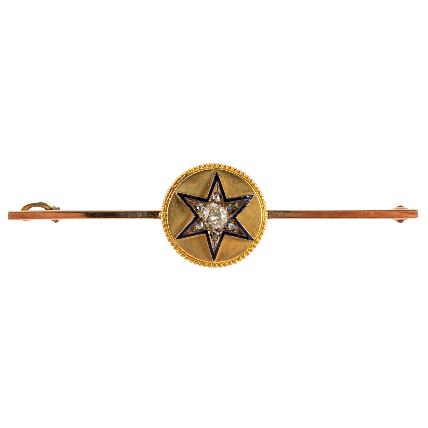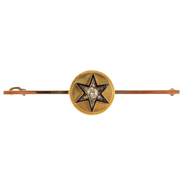 With a central circular plaque with star motif of blue enamel, old and rose cut diamonds, mounted to a bar marked 15ct, gross weight 6.2 grams