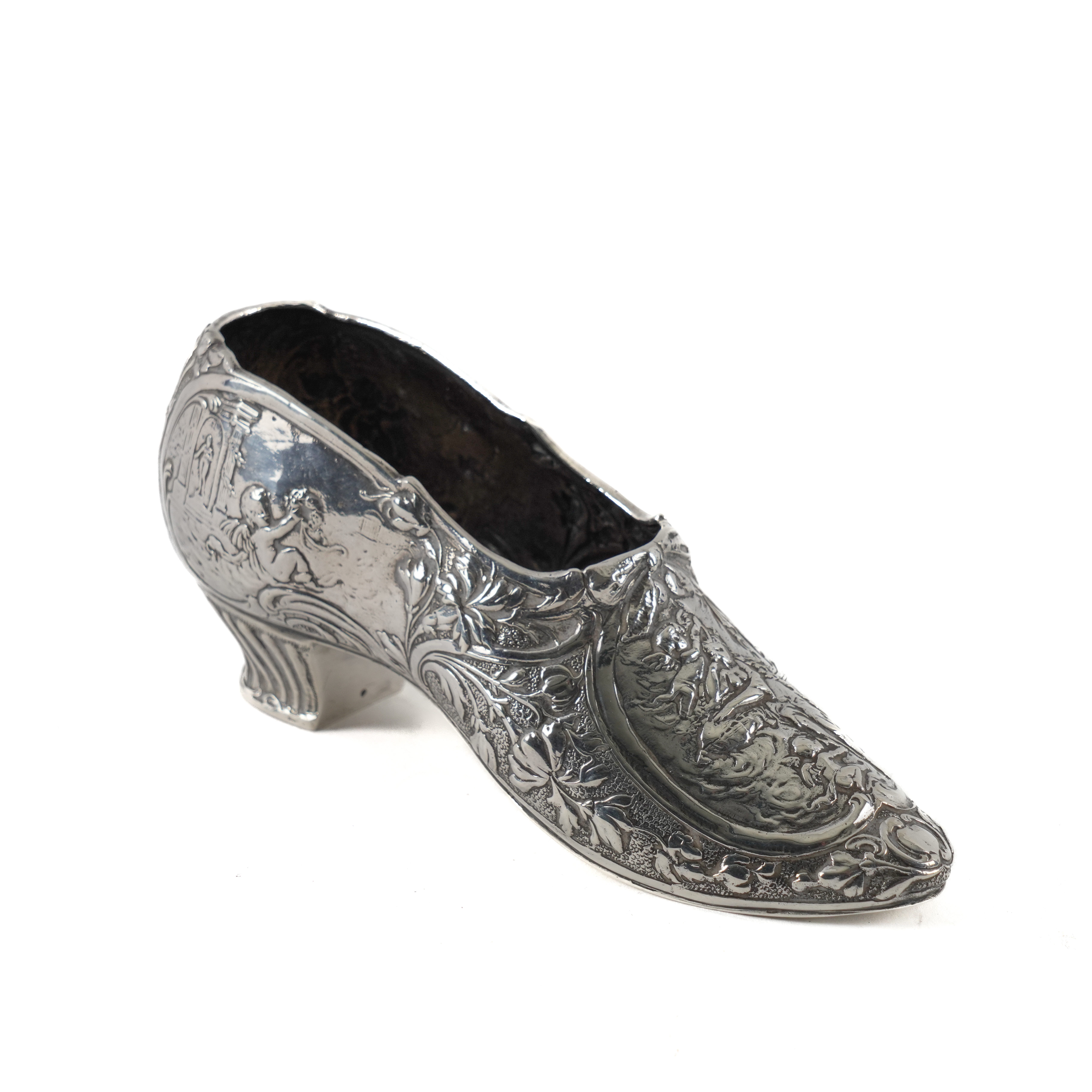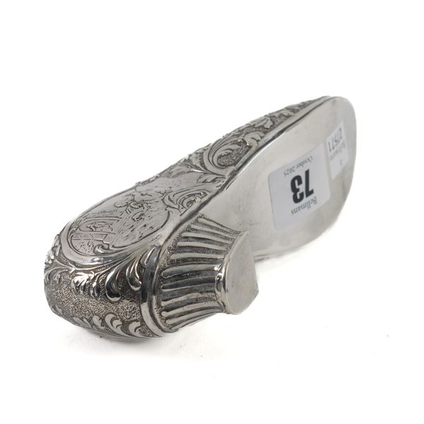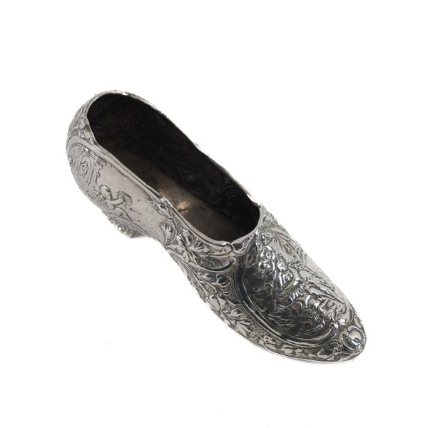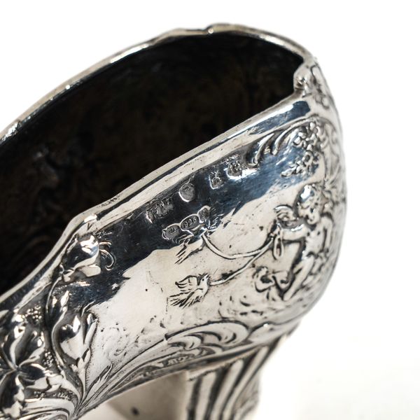 Embossed with floral scrolls and putto, import mark Chester1909, length 15cm, weight 132 grams