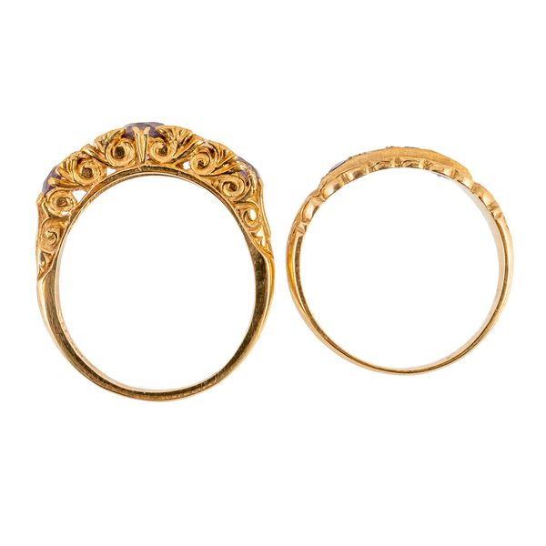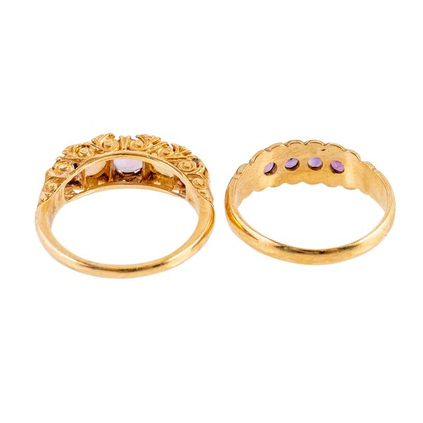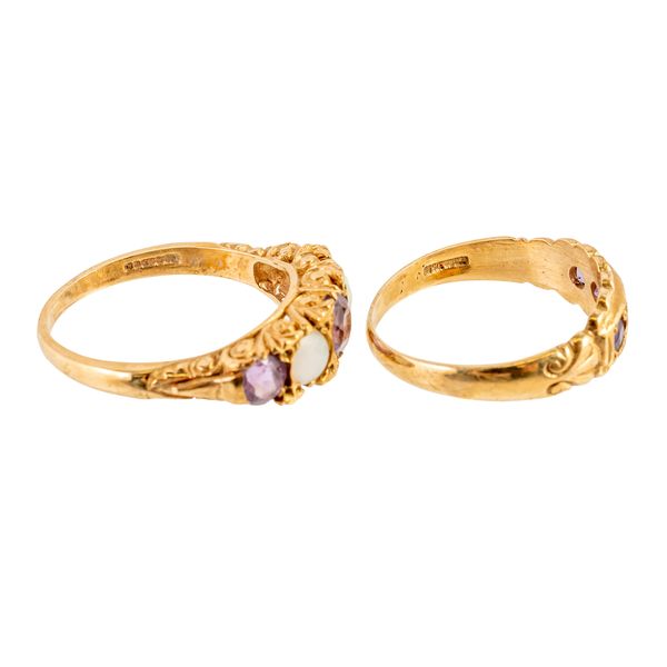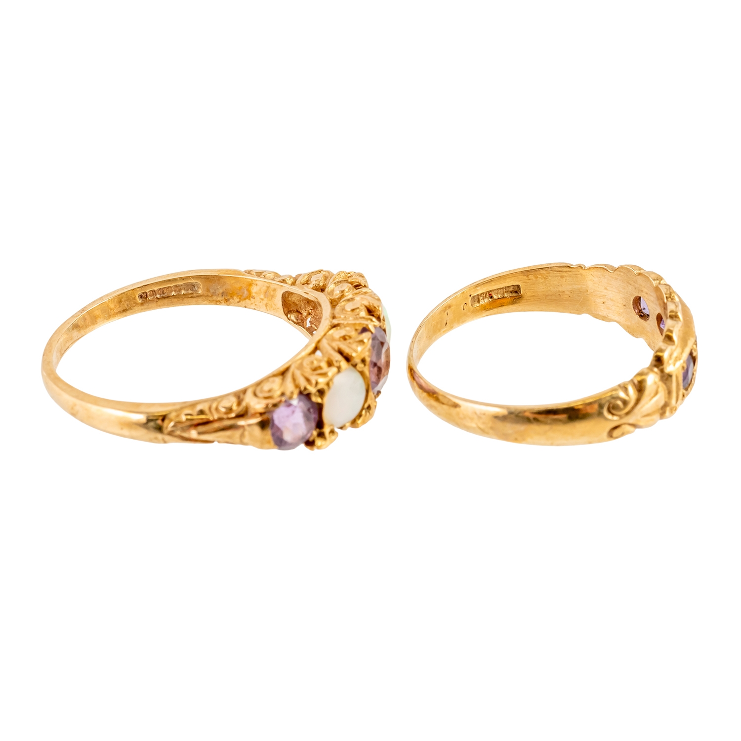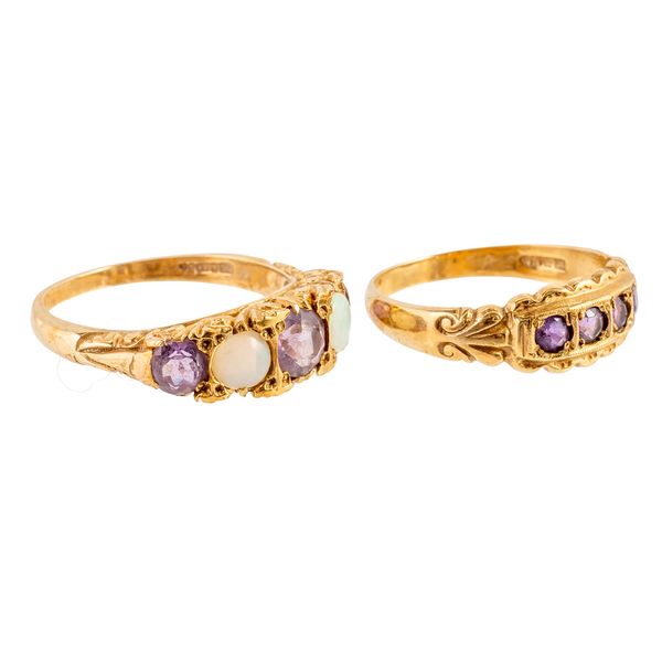 Comprising; a 9ct gold and amethyst four stone ring mounted with a row of circular cut amethysts between scrolled shoulders, size O½ and a 9ct gold amethyst and opal five stone ring mounted with three amethysts and two opals at intervals, size N½, combined gross weight 6 grams, with a box