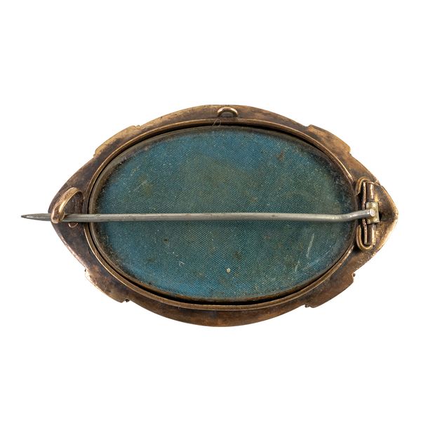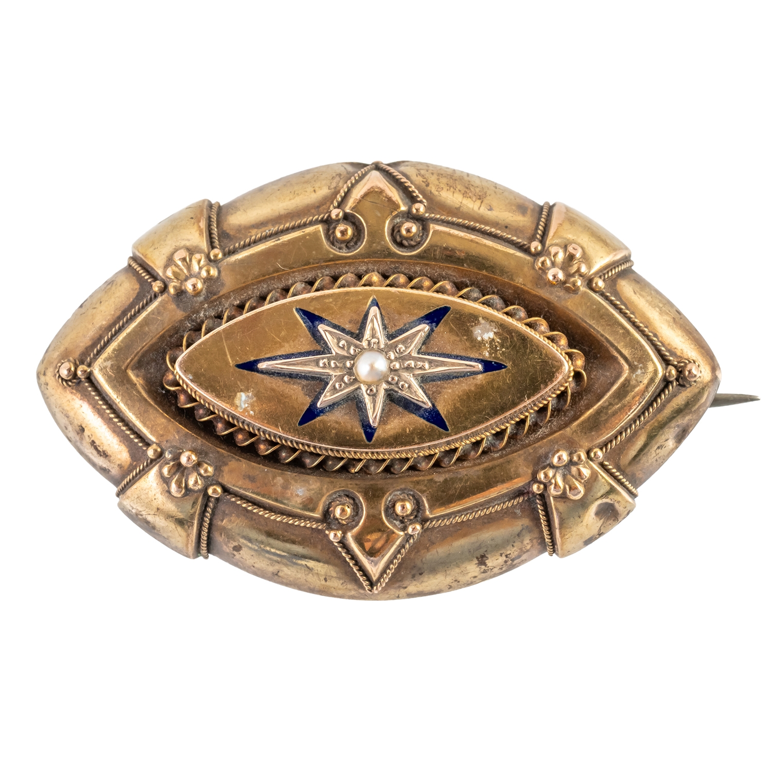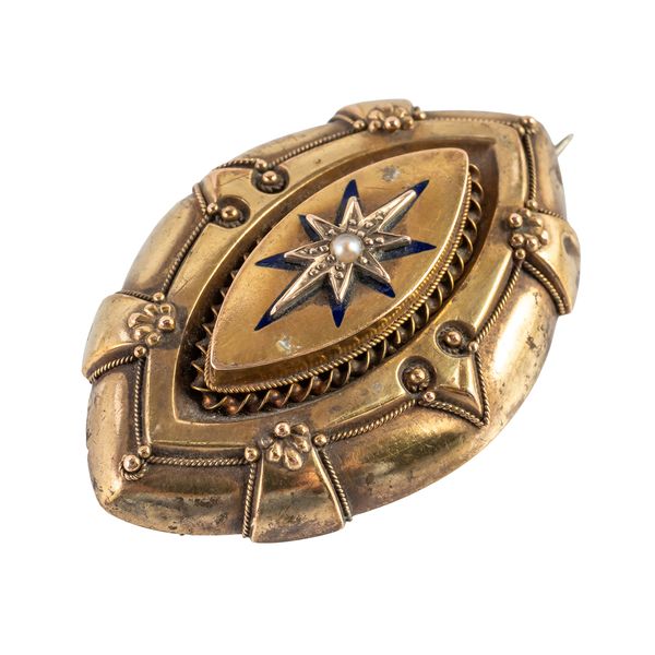 Of oval form, the centre applied with a half pearl set starburst motif, on an enamelled ground, otherwise with applied bead and wirework decoration, the back glazed with a locket compartment, length 44.2mm, gross weight 8.9 grams