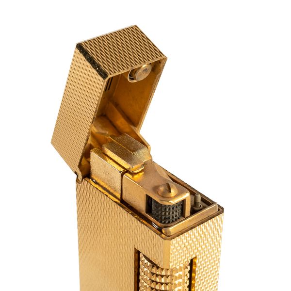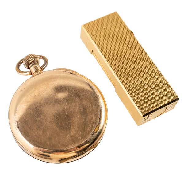 A DUNHILL GILT METAL RECTANGULAR CASED GAS LIGHTER AND A POCKET WATCH (2)