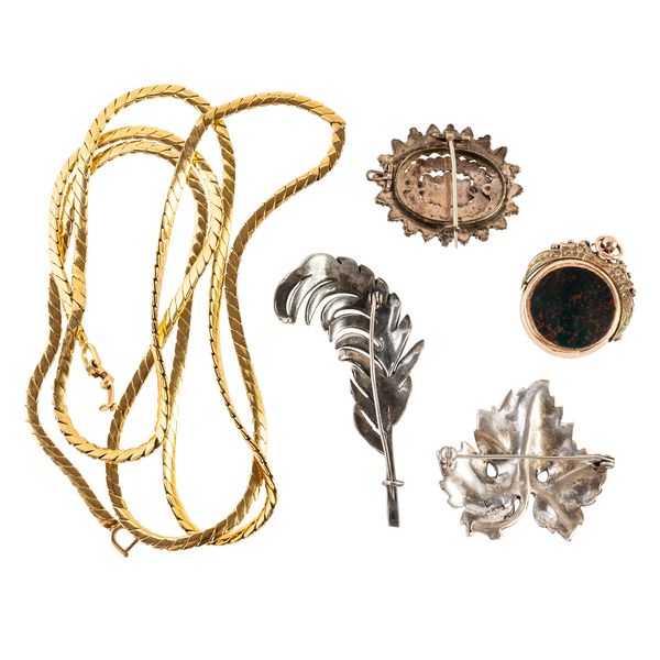 Also a late Victorian 9ct gold mounted bloodstone and cornelian rotating fob, Birmingham 1891, two further brooches and a Christian Dior gilt metal necklace, with a Christian Dior box