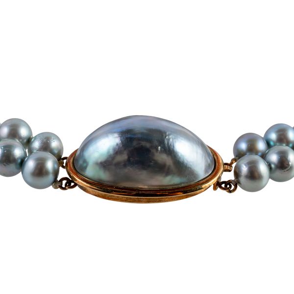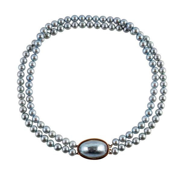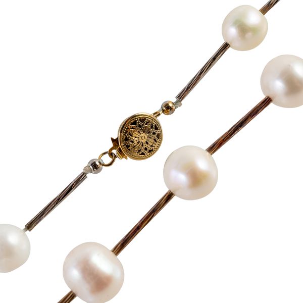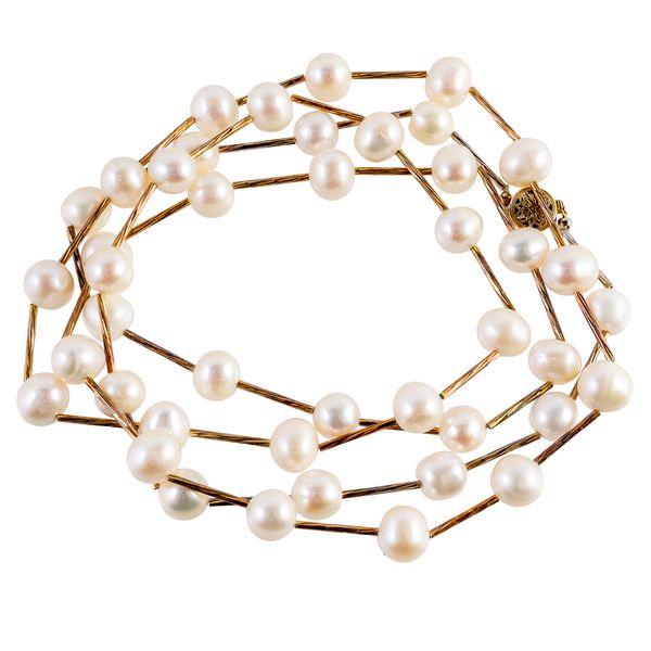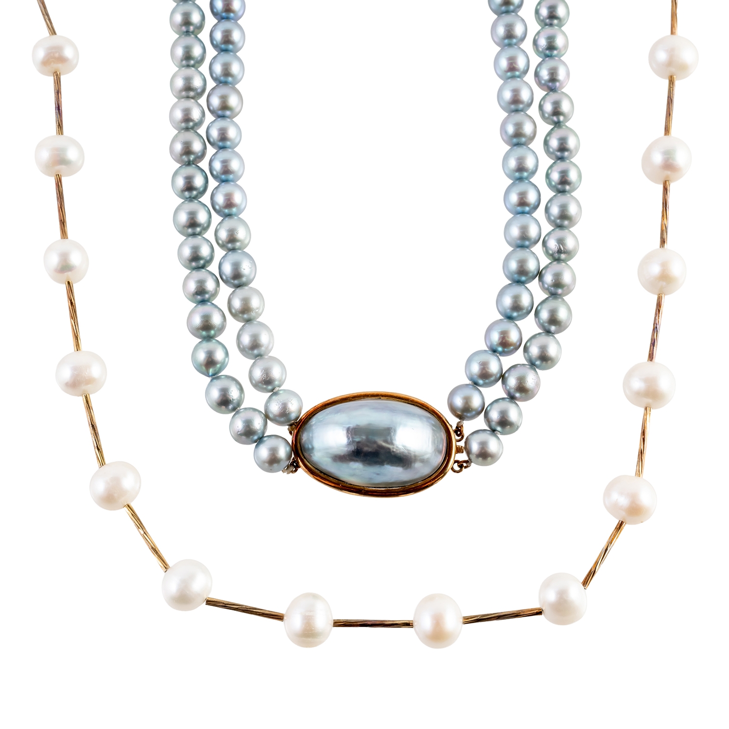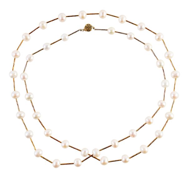 Comprising; a two row necklace of grey tinted freshwater cultured pearls, on an oval gold clasp, unmarked, length 44cm and a gilt metal necklace, in a bar link design spaced with freshwater cultured pearls at intervals, on a snap clasp, length 105cm