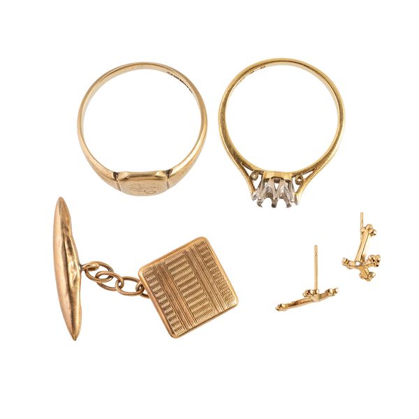 Comprising; an 18ct gold solitaire ring mount, size M, weight 2.3 grams, a 9ct gold signet ring, initial engraved, a cufflink detailed 9ct and a pair of cruciform ear studs, combined weight 3.8 grams