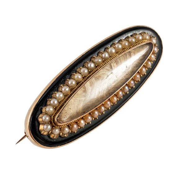 A VICTORIAN GOLD, SEED PEARL AND BLACK ONYX MOURNING BROOCH