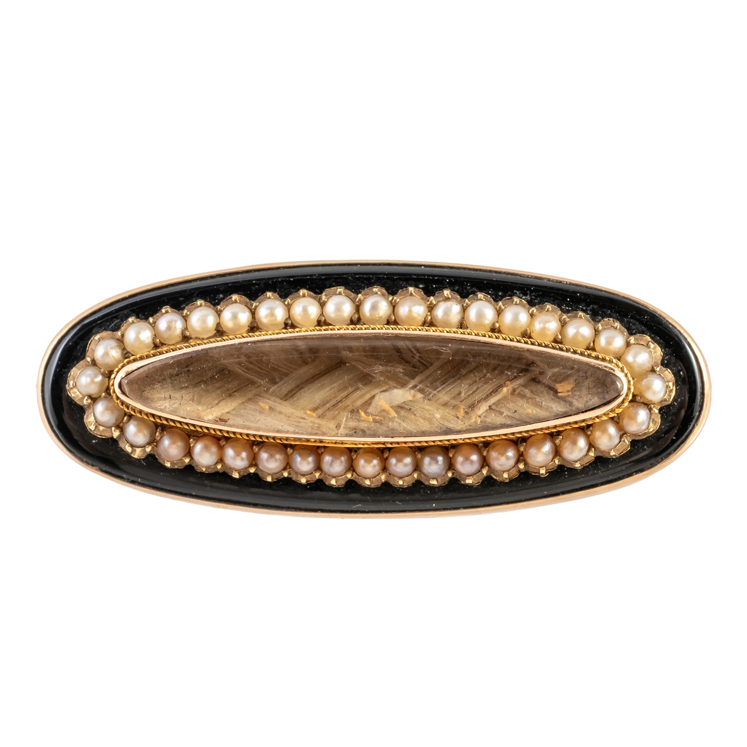 Glazed with a woven hair locket compartment to the centre, within a border of seed pearls on a black onyx ground, measuring 38mm in length, gross weight 8 grams