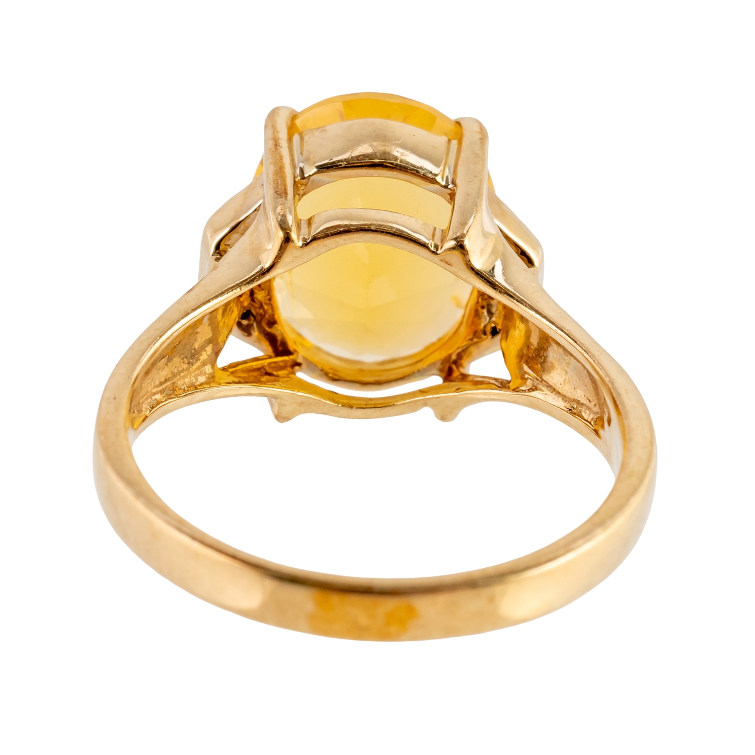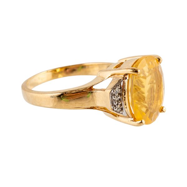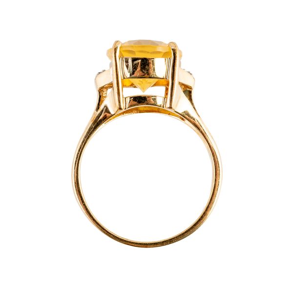 Mounted with a central yellow paste and flanked either side by, in 9ct gold, size N, gross weight 4.1 grams