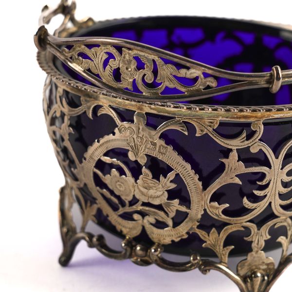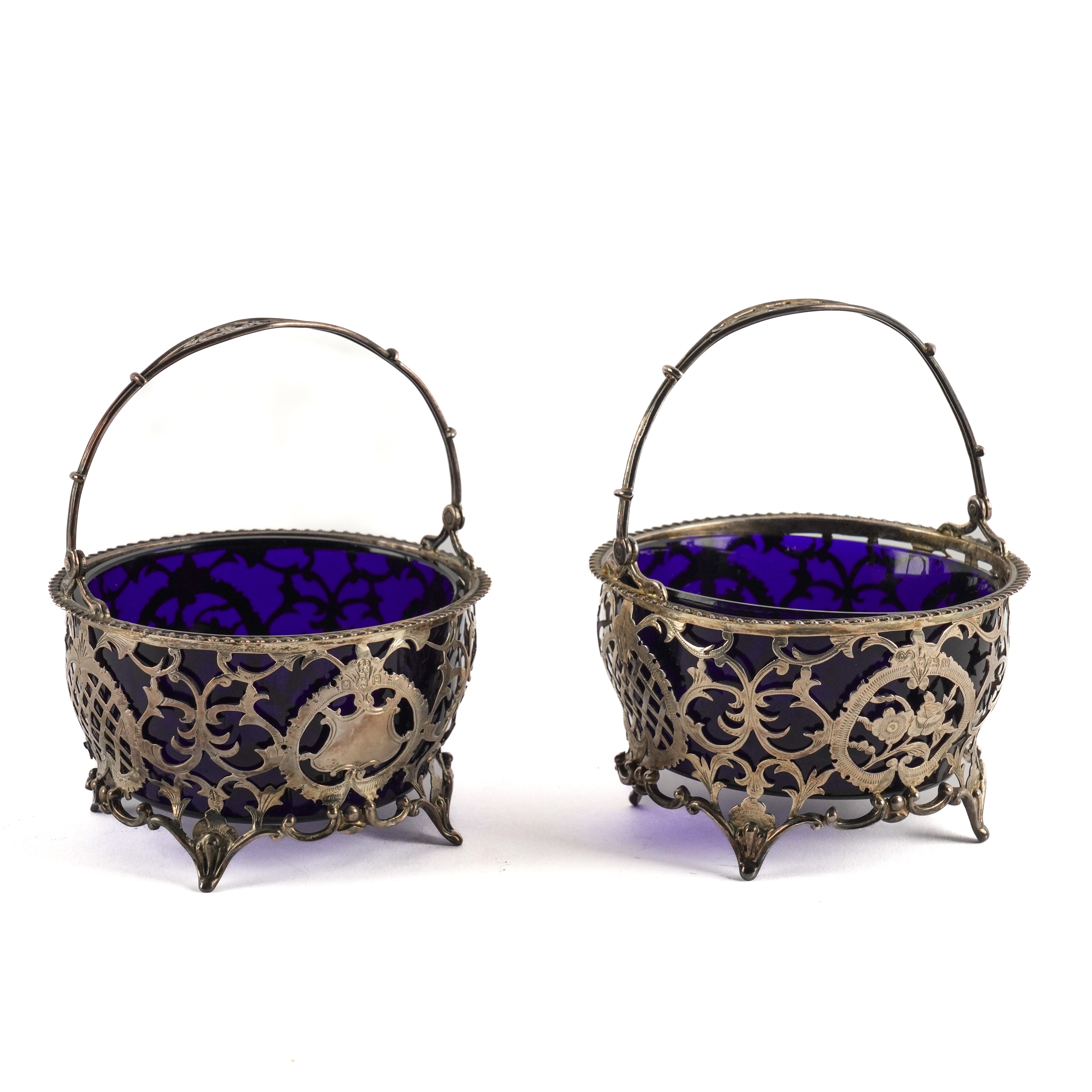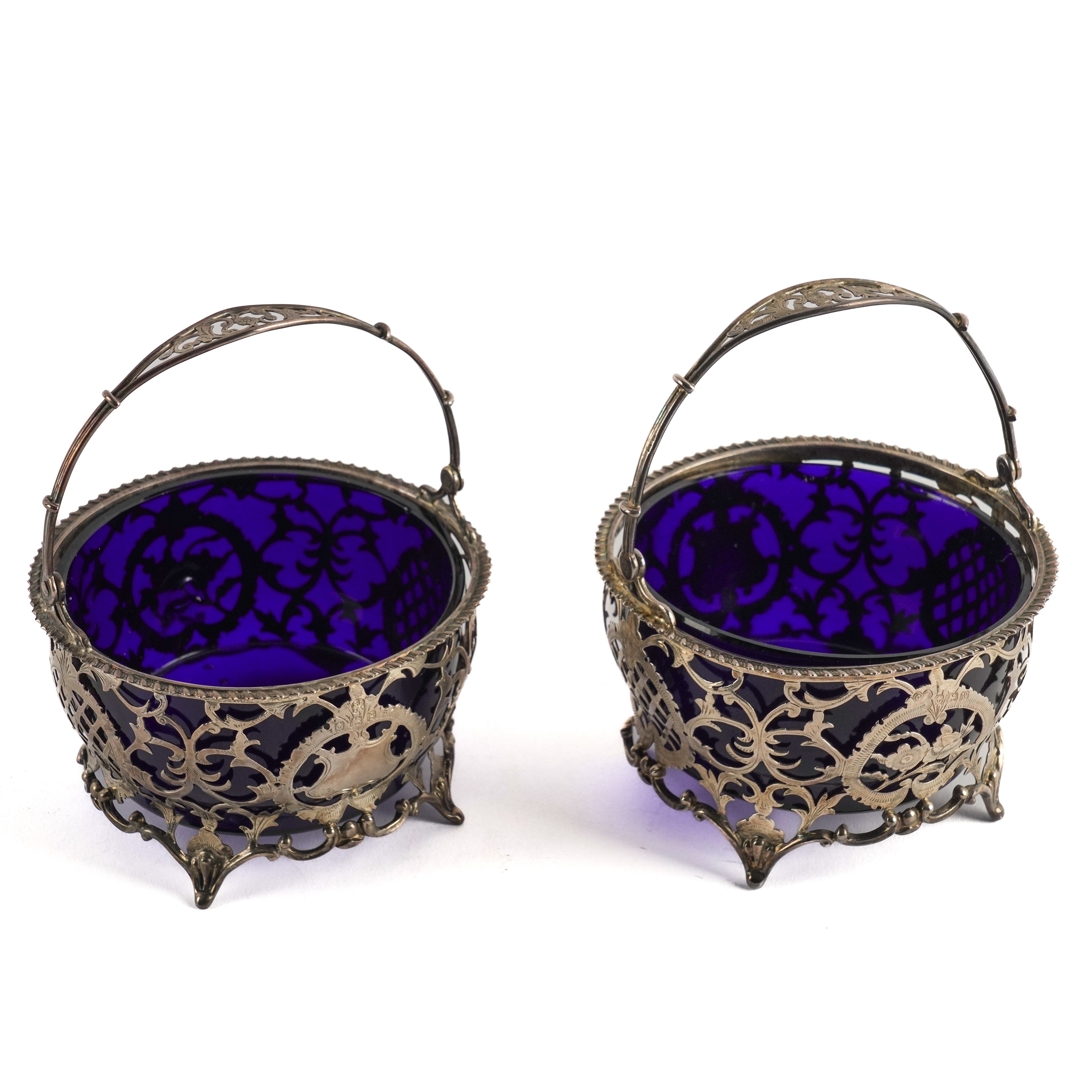 Each with pierced and engraved decoration, raised on four feet and with a swingover handle, above a gadrooned rim, sample diameter 11cm, Birmingham 1906 and 1921, combined weight 215 grams, with two blue glass liners