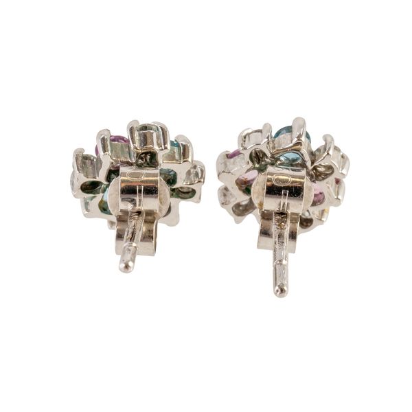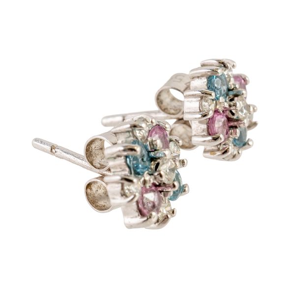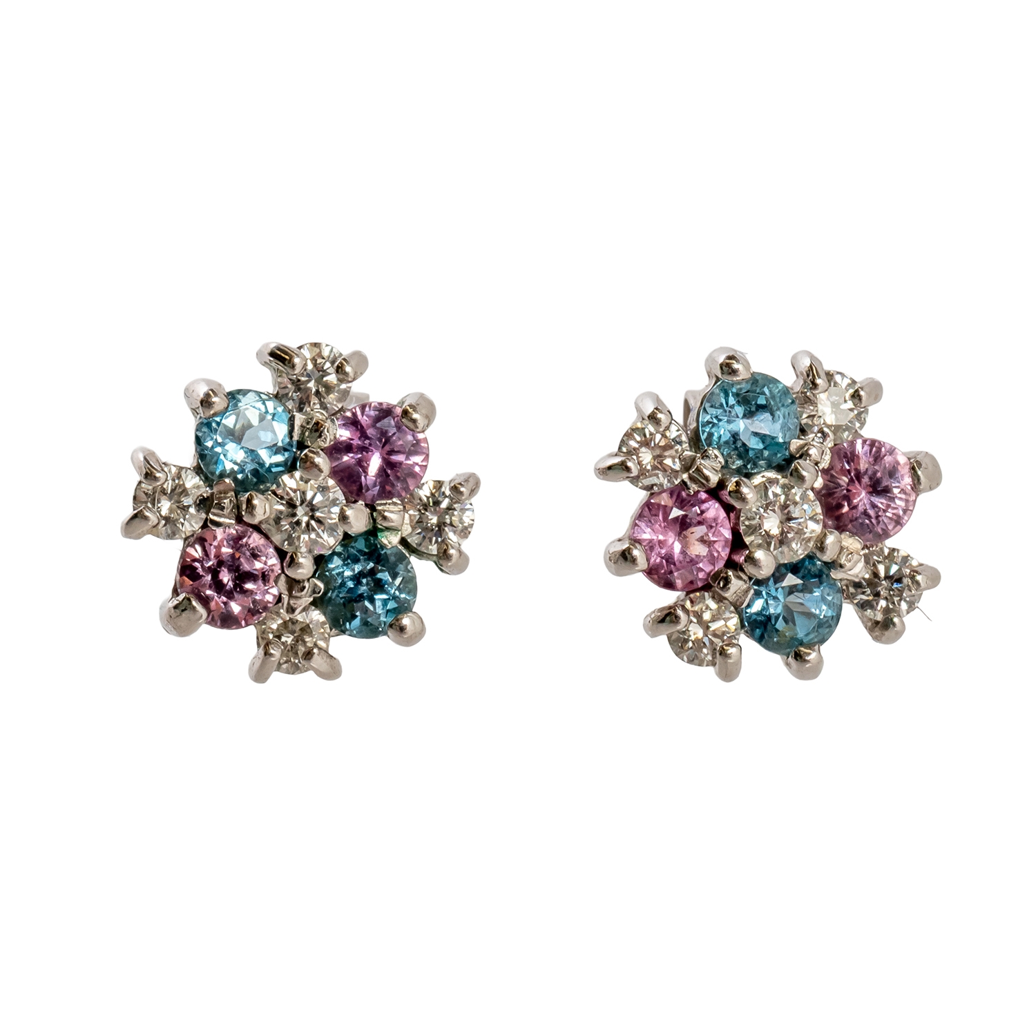 Claw set with five round brilliant cut diamonds, two pink sapphires and with two aquamarines, the backs with post and butterfly fittings detailed 750, measuring 8mm in diameter, with a case, gross weight 2.3 grams