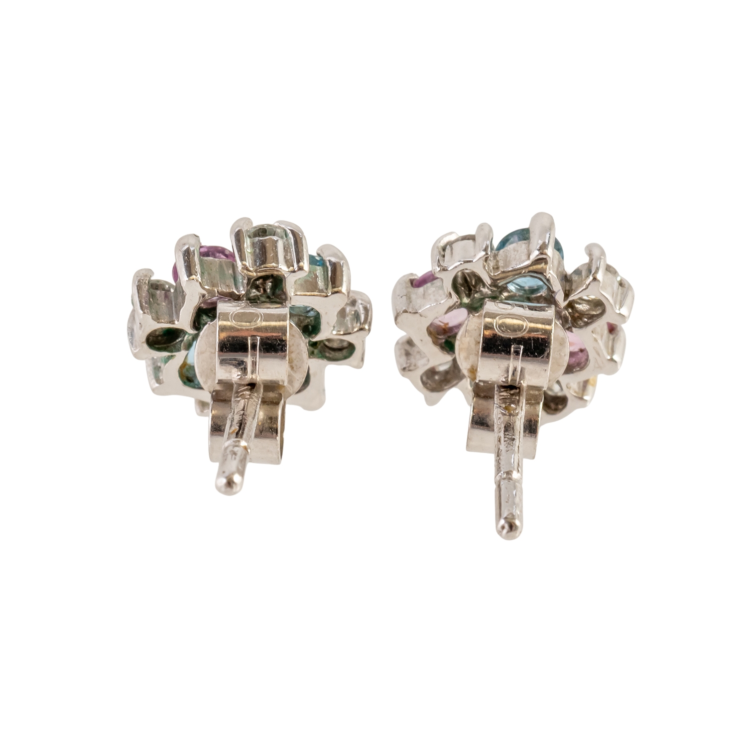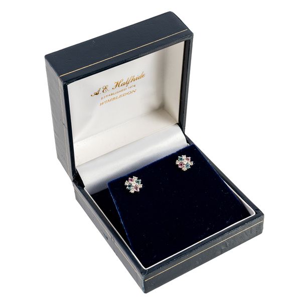 A PAIR OF 18CT WHITE GOLD AND GEM SET CLUSTER EARRINGS (3)