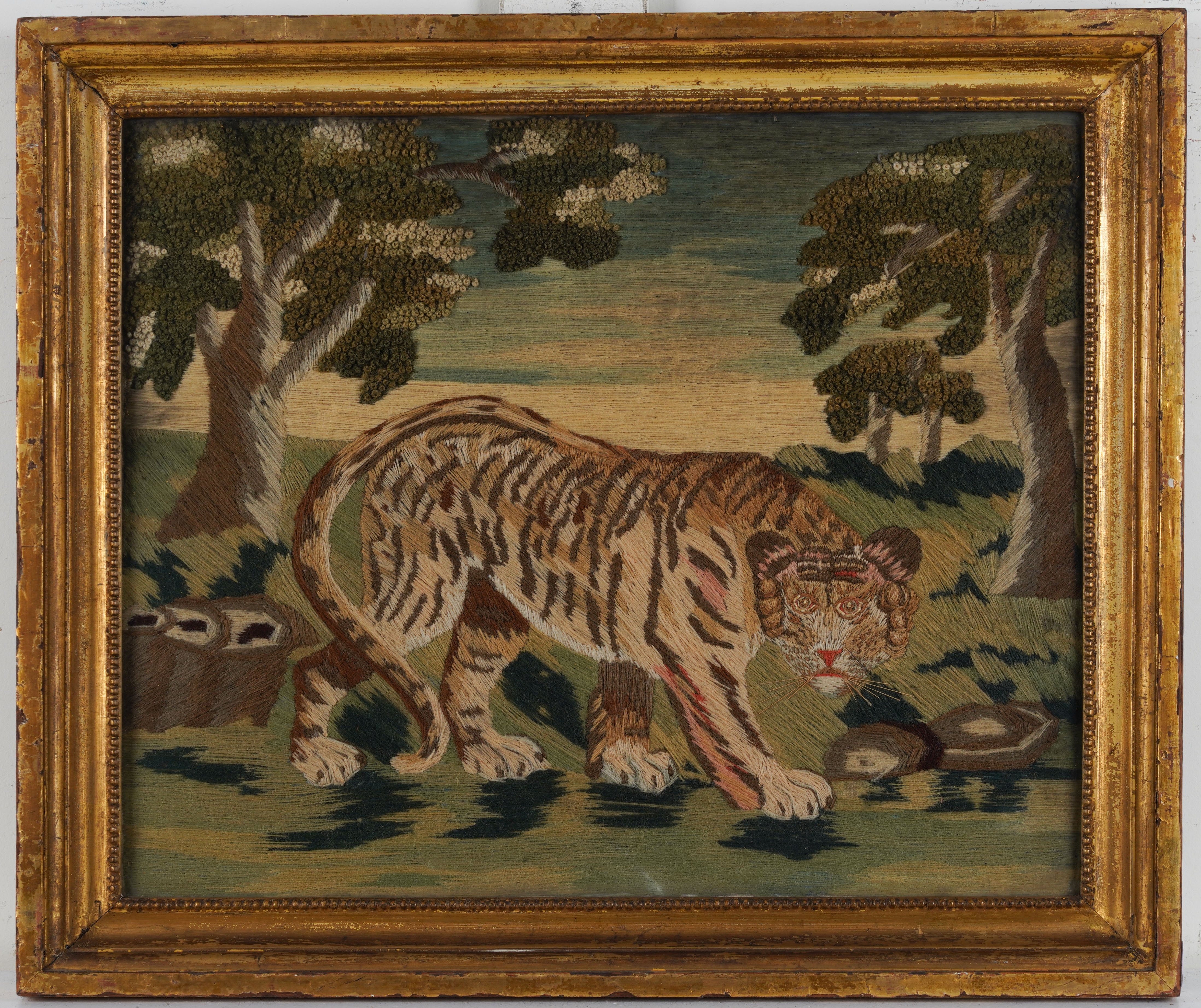 Generally in good order, the colours fairly vibrant and distinctive given the muted palette. One very small patch of loss to the right of the front foot. One loose black thread on the tiger’s face. Frame in good order, made to appear distressed and has been re-gilded, with small knocks and wear. The needlework within the frame measures 46.5cm x 36.5cm