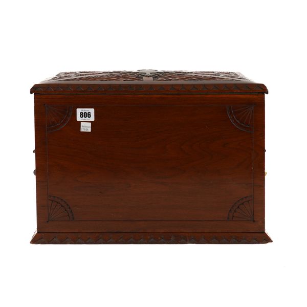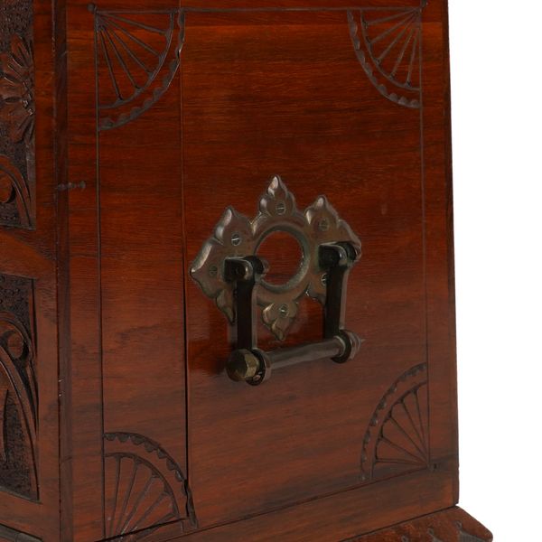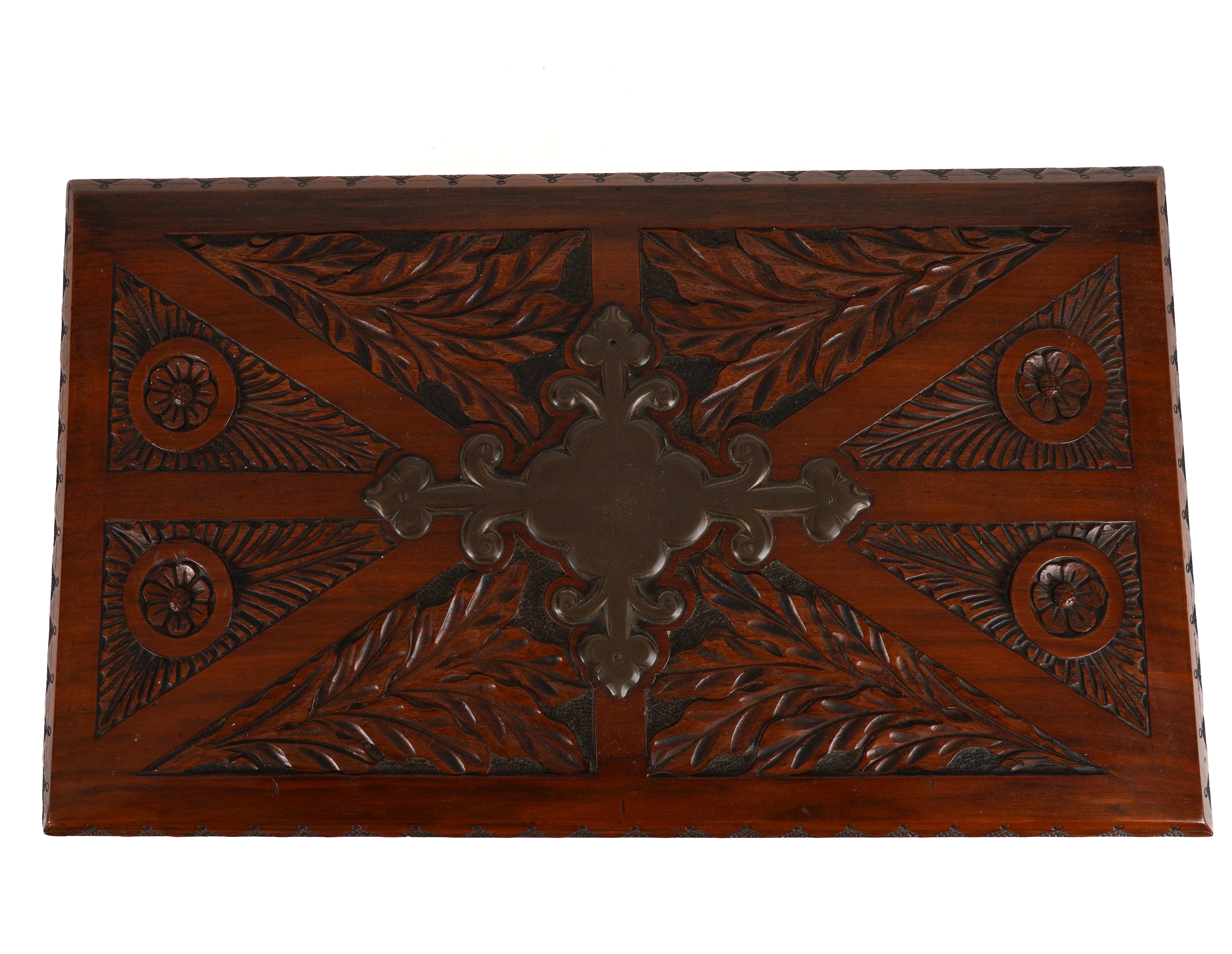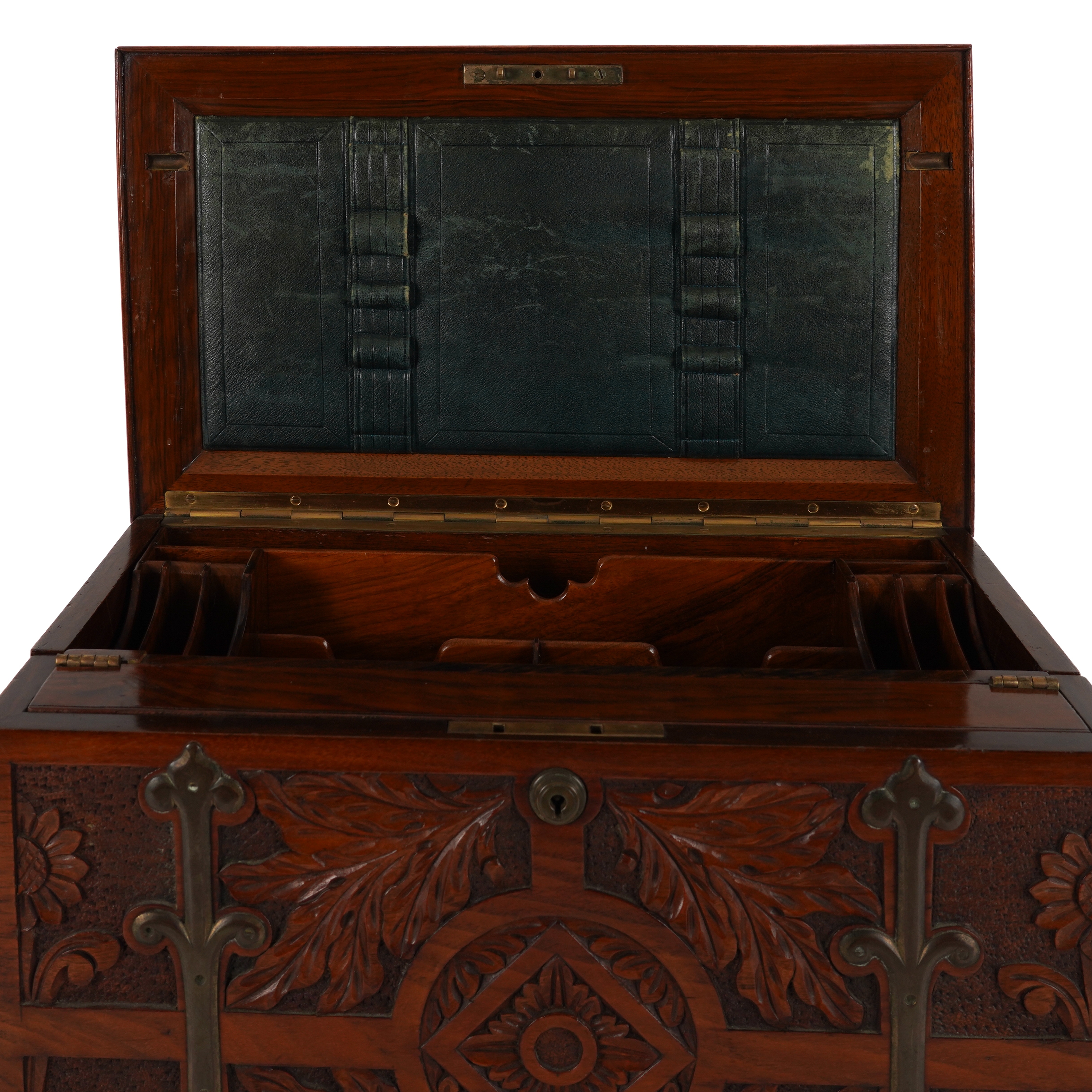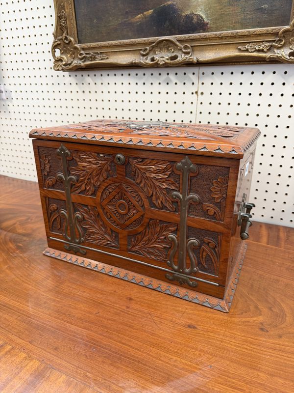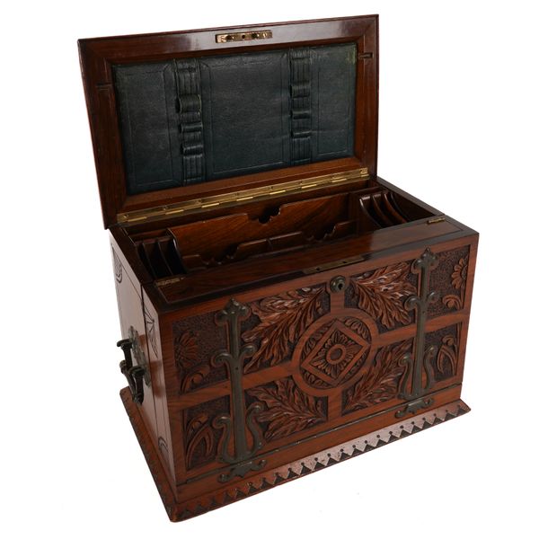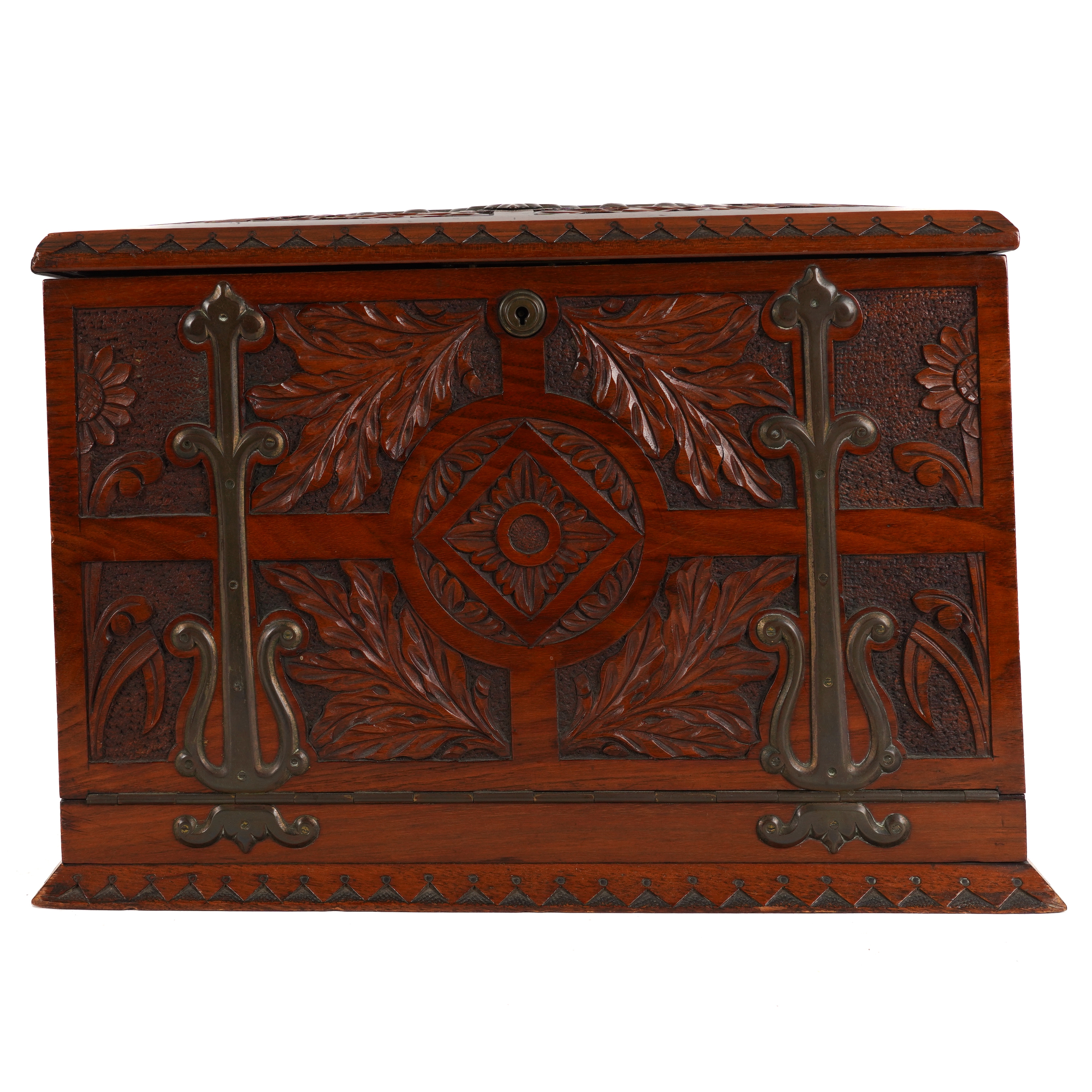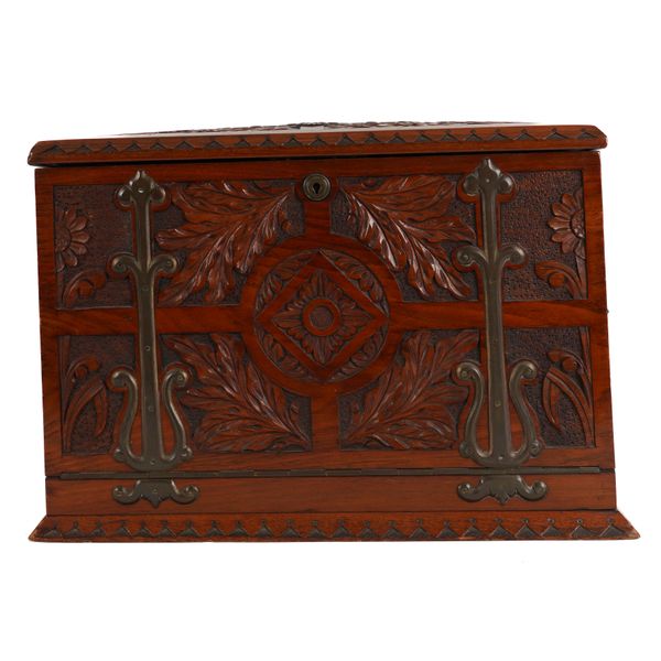 AN ARTS & CRAFTS BRASS MOUNTED CARVED WALNUT WRITING BOX