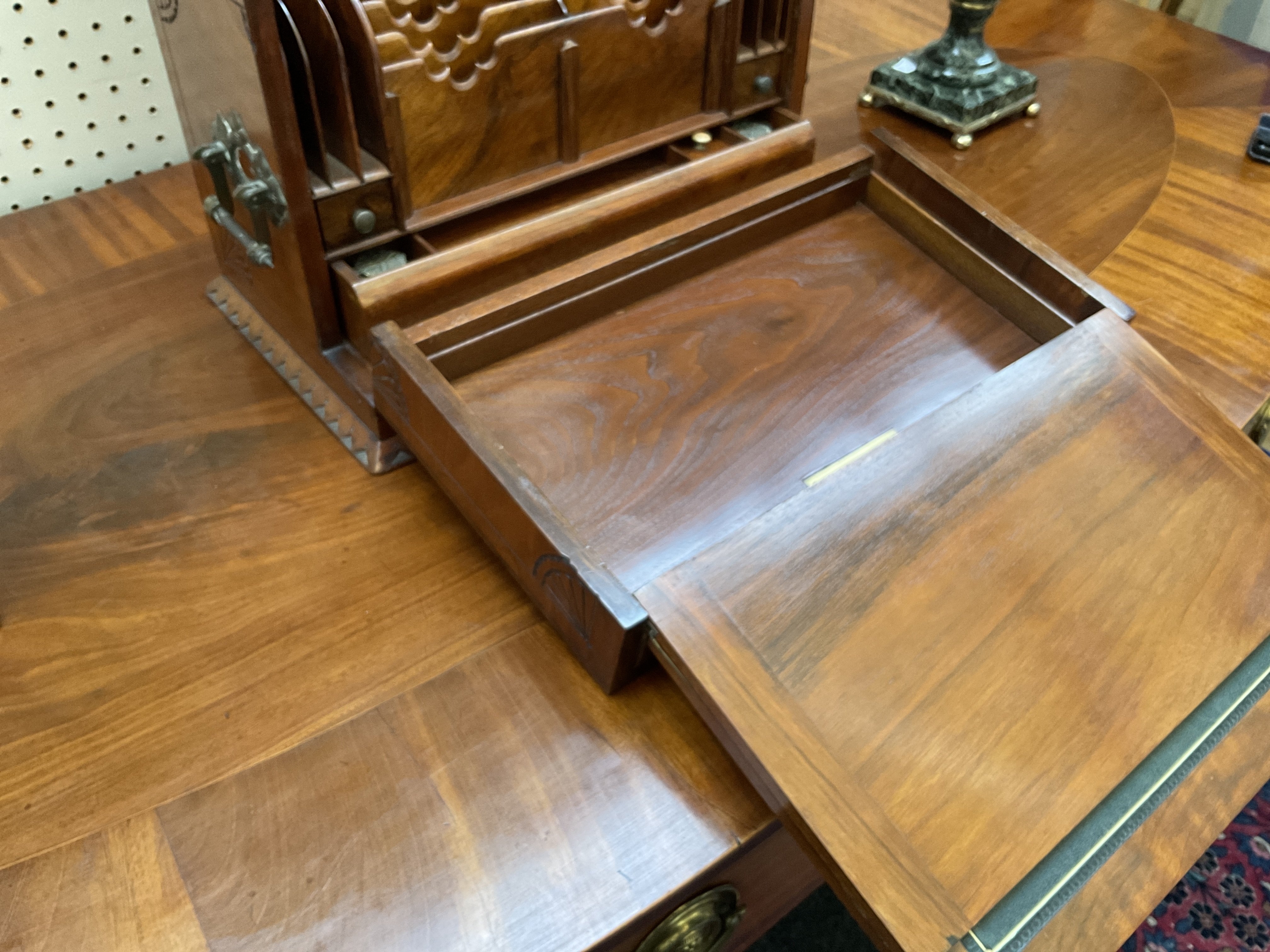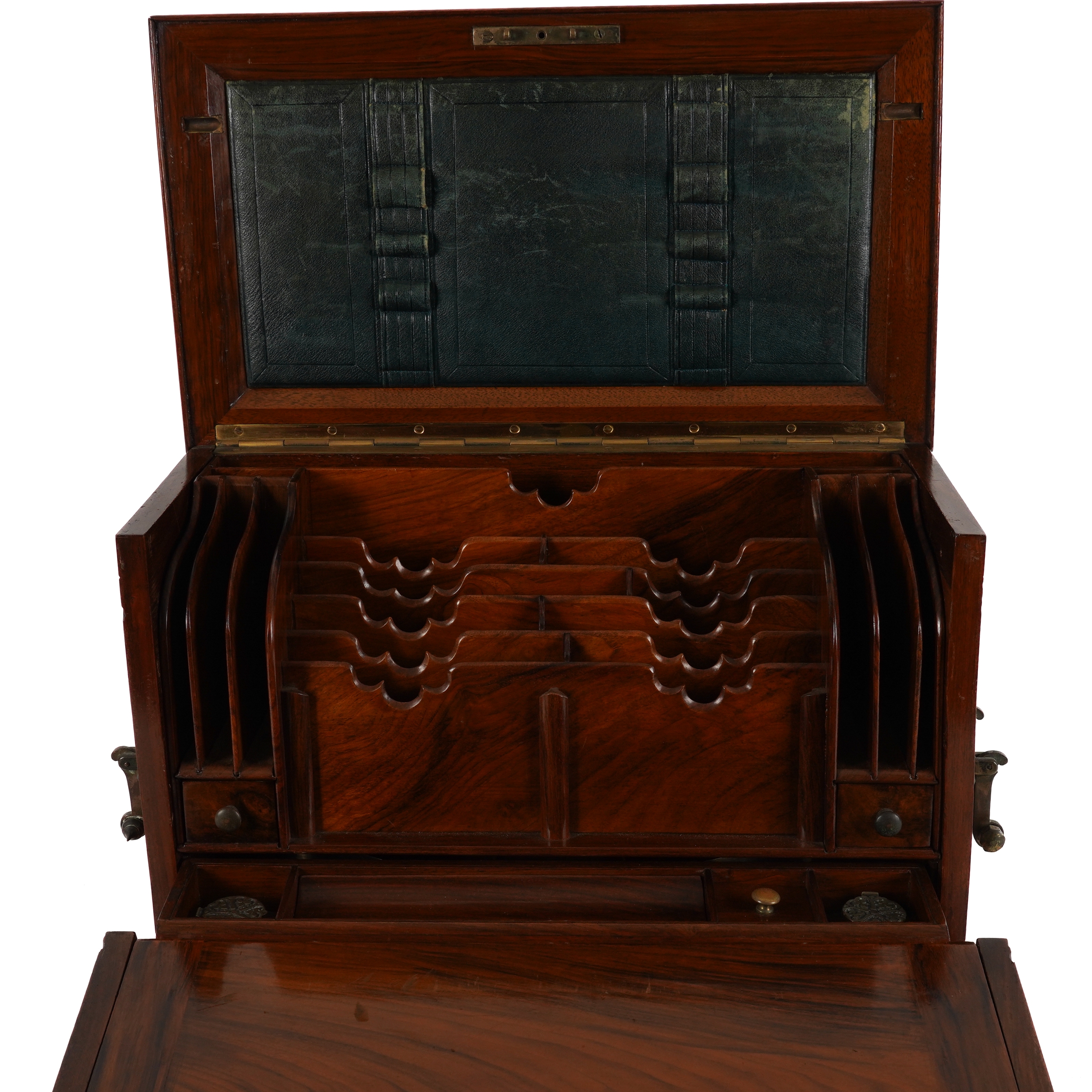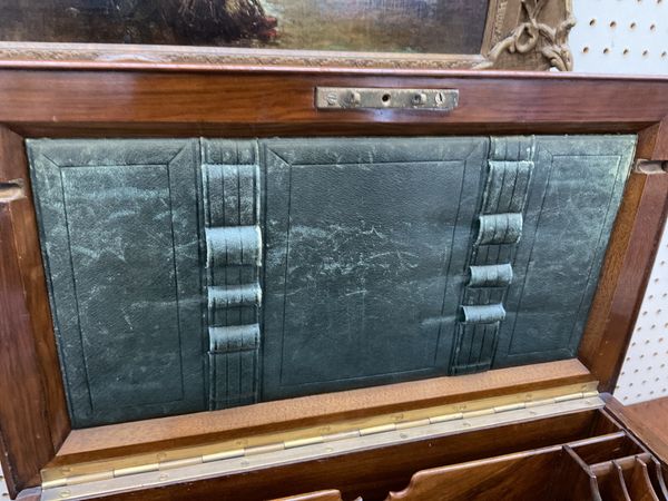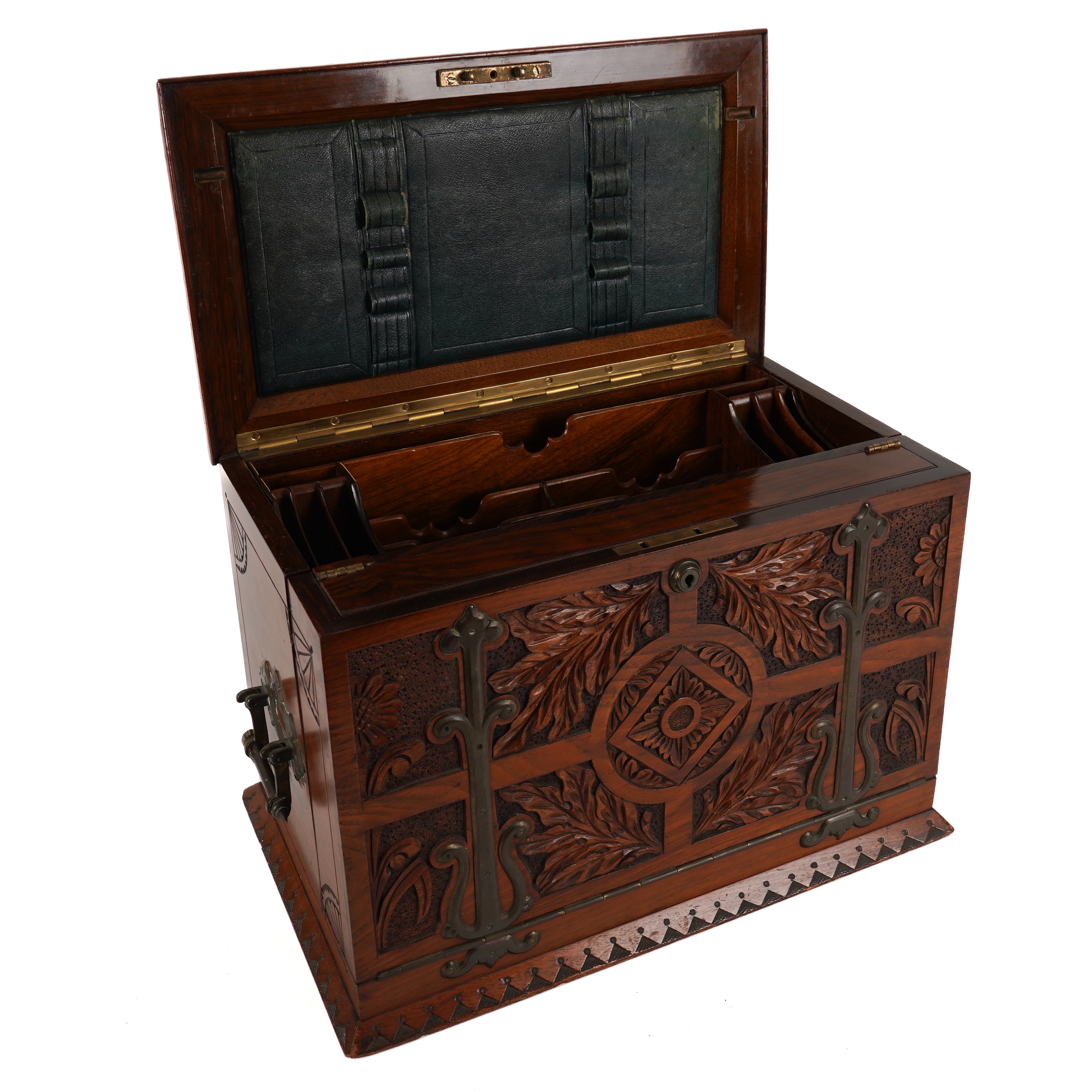 The hinged foliate carved top and fall front with carrying handles to the sides, opening to reveal a fitted interior with double leather writing slope, 43cm wide; 24cm deep; 28cm high