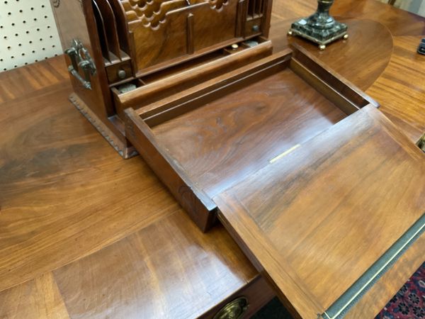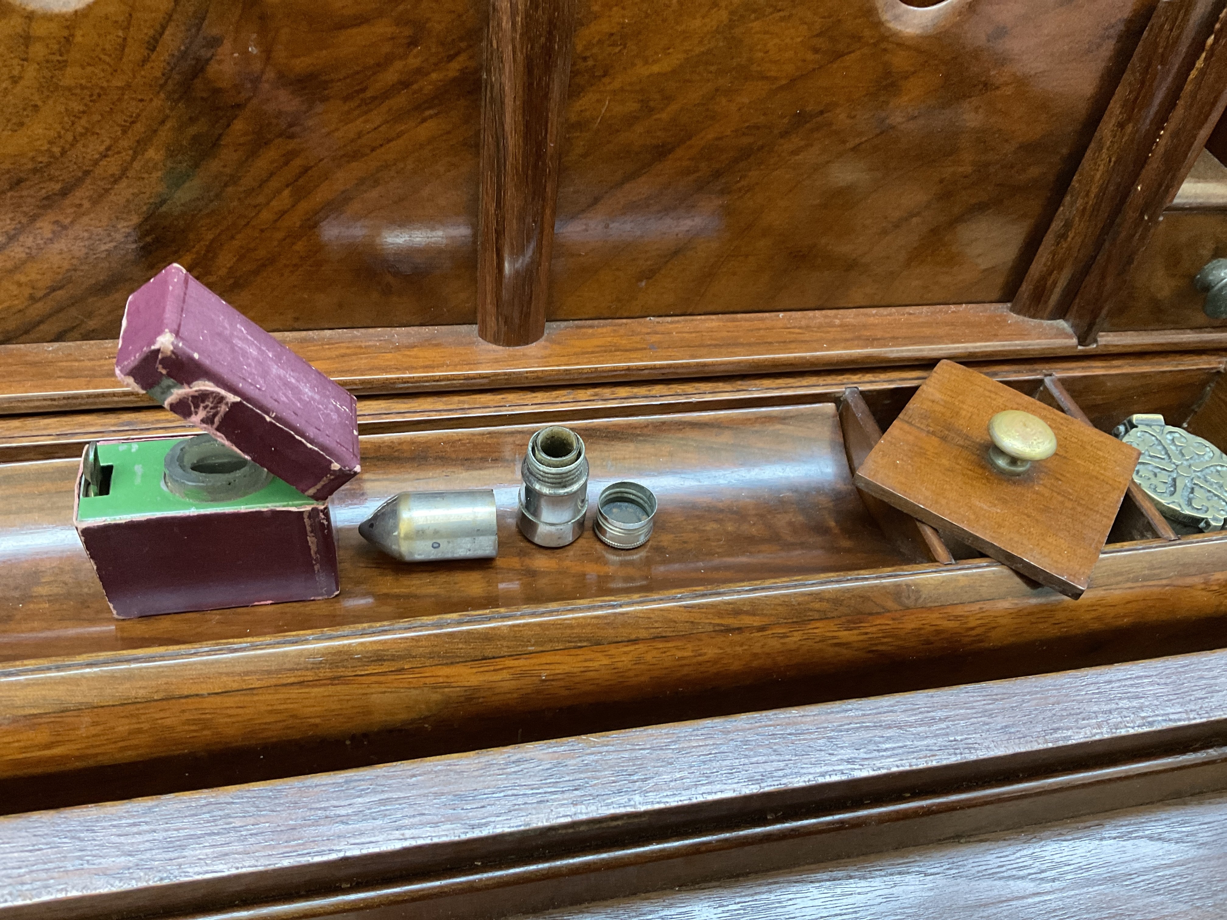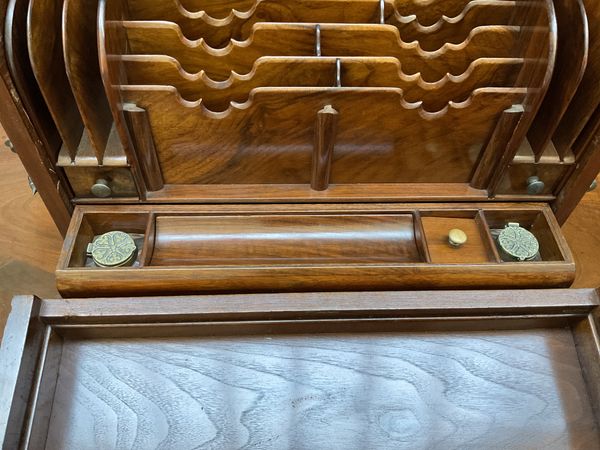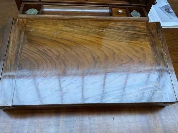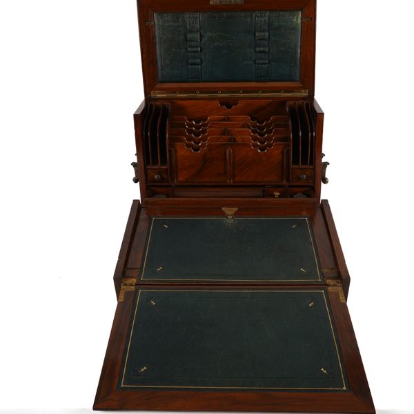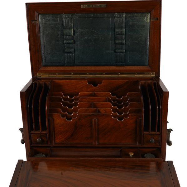 Generally in good order, with small marks and evidence of wear throughout, notably to the leather on the cover. The central sectional filing component is loose and can be removed from the box. Lacking key for the Bramah lock. See images for further details.