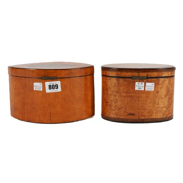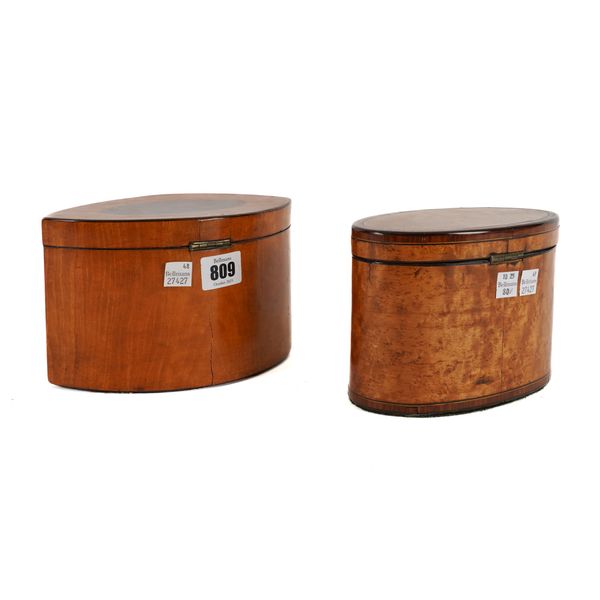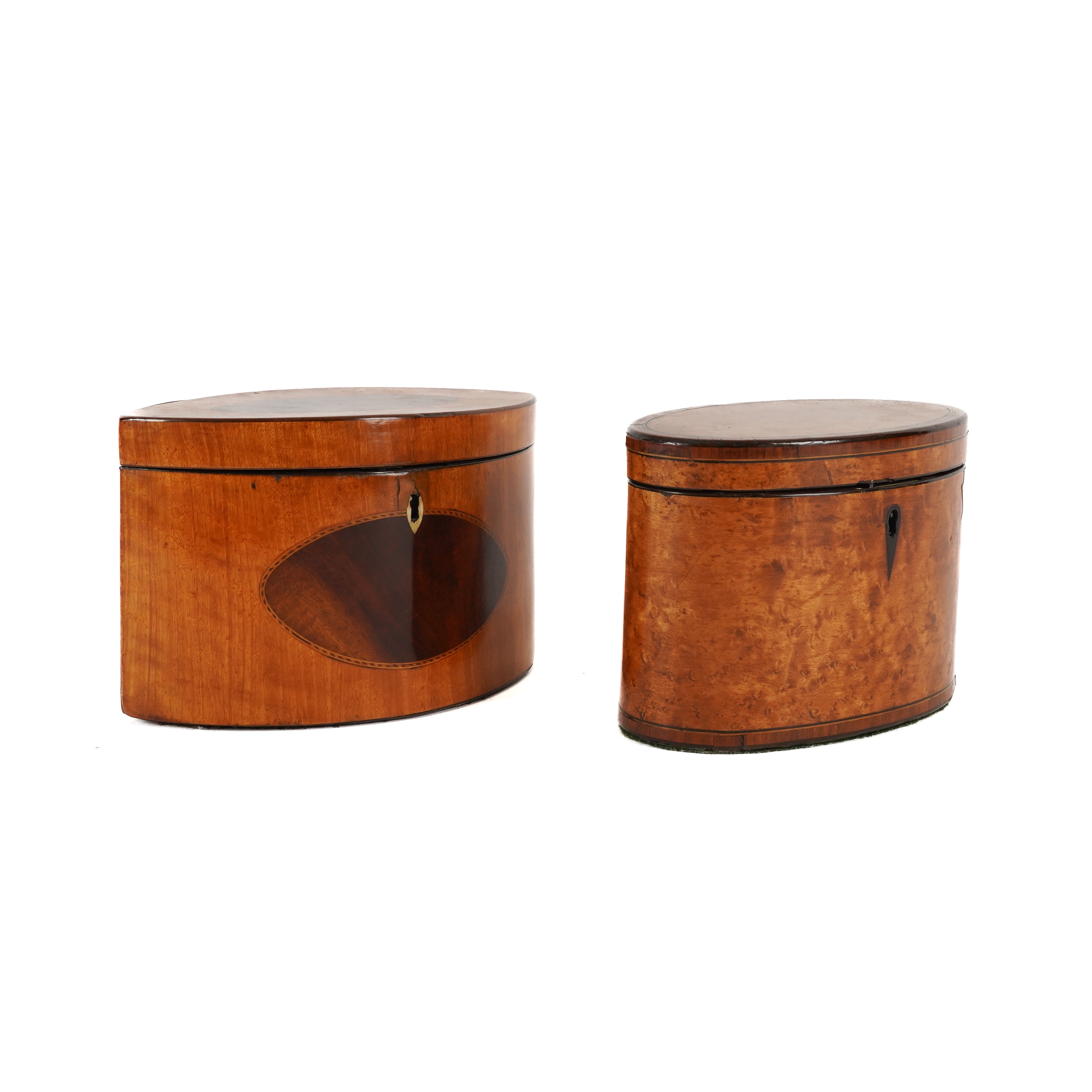 With figured mahogany oval panels to the top and front, bone escutcheon and finials to the mahogany subsidiary covers fitted to the divided interior with remains of foil lining, key, 19cm wide; 12cm high; Together with a George III burr sycamore or maple tulip crossbanded oval tea caddy, remains of interior silver foil lining, key 16cm wide; 12cm high