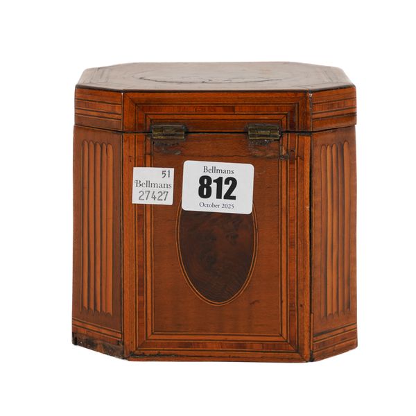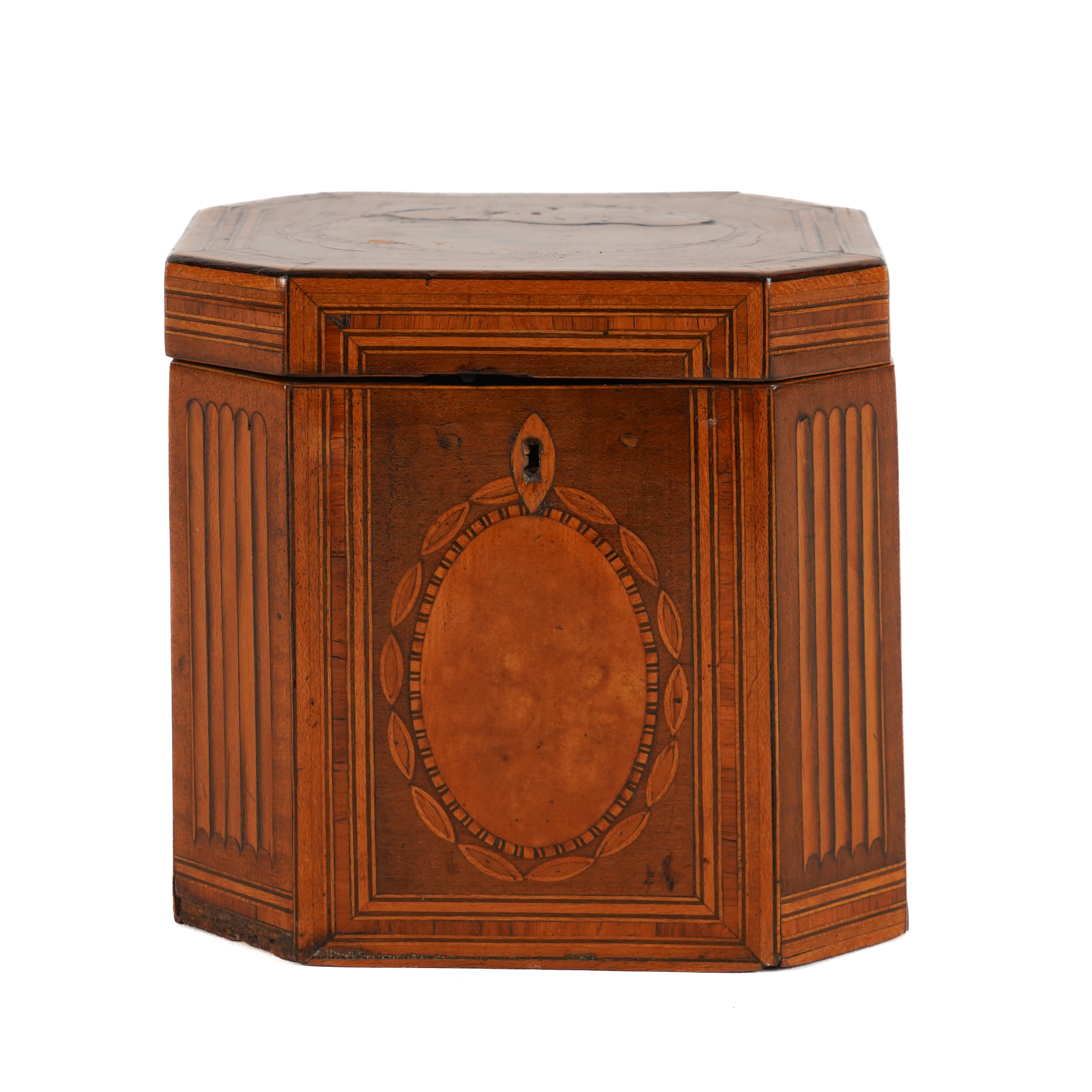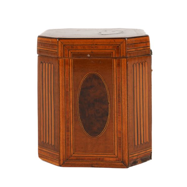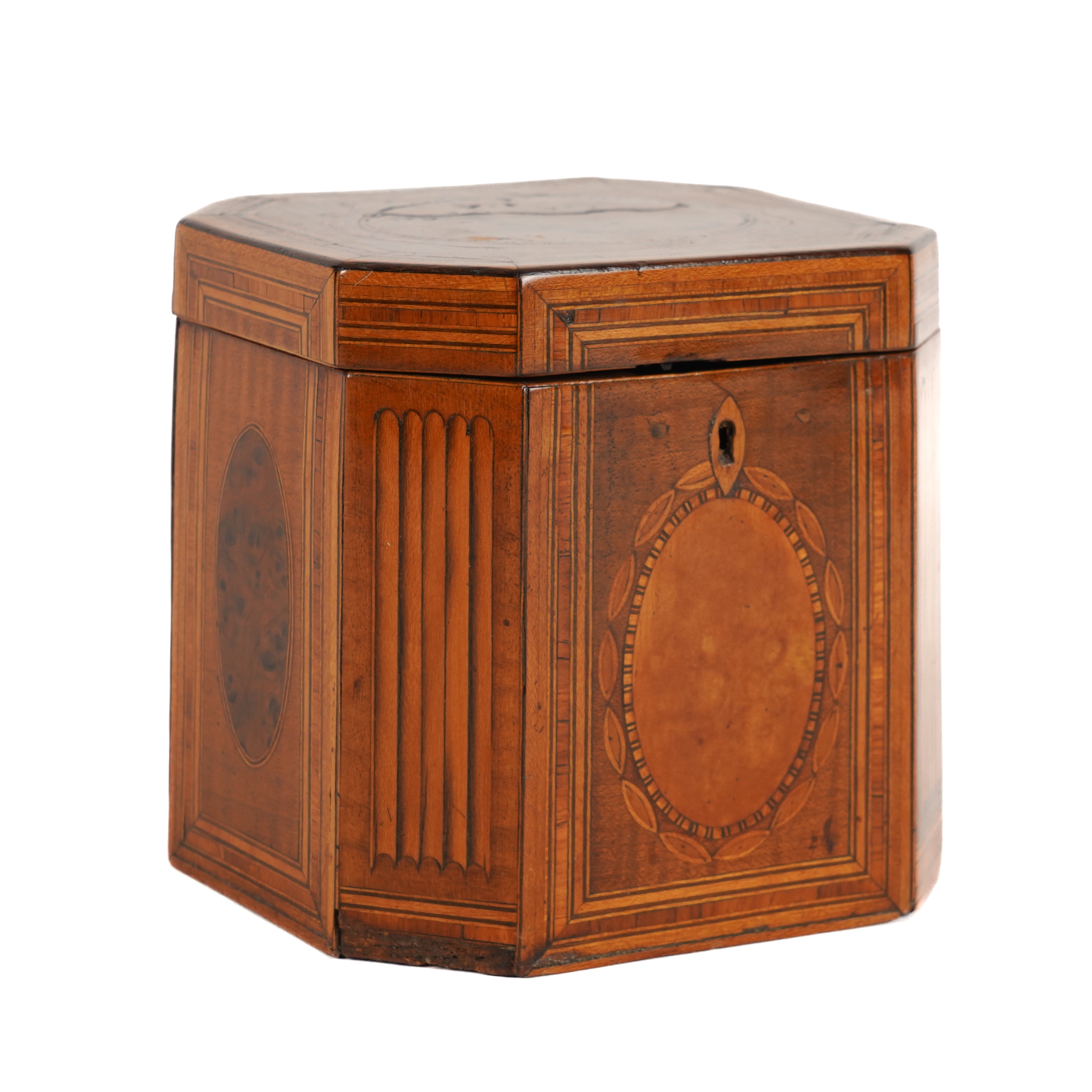 A GEORGE III HAREWOOD, BOXWOOD AND YEW WOOD INLAID TEA CADDY