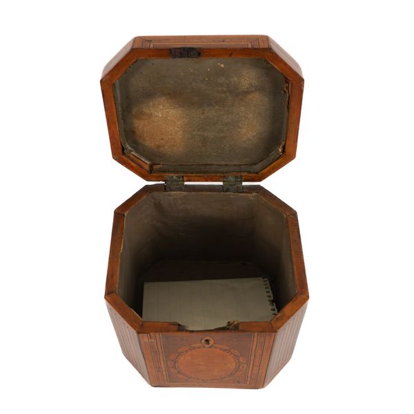 Tulipwood crossbanding with pilaster inlaid canted angles flanking medallion inlaid sides, papered interior, 13cm wide; 11cm deep; 12cm high
