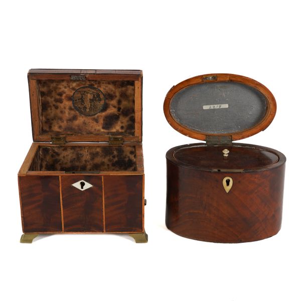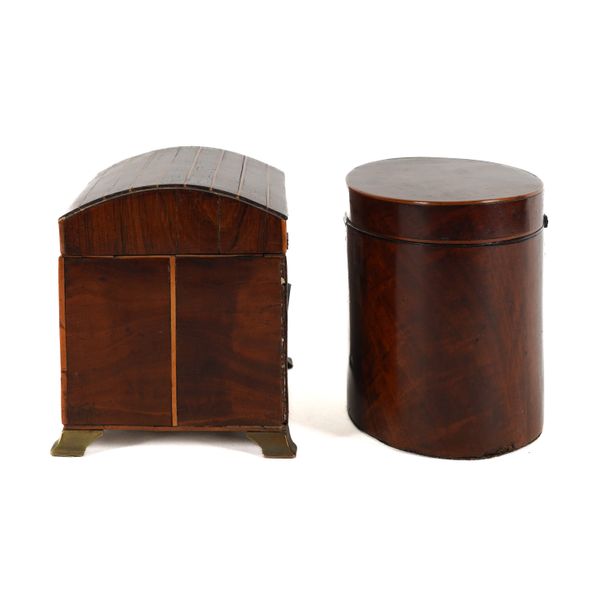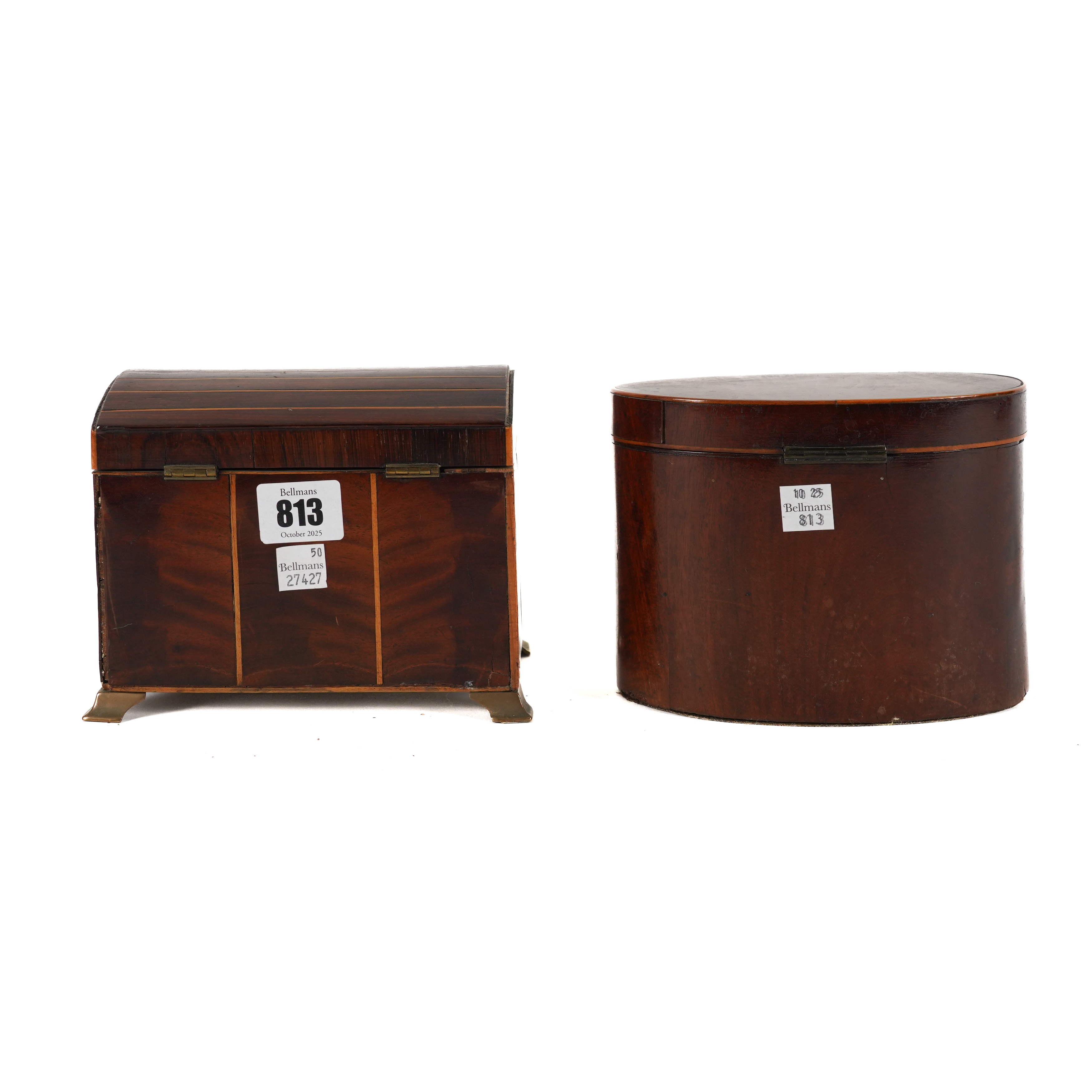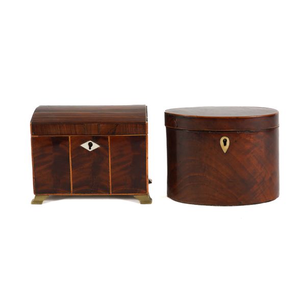 With line-inlaid dome hinged top, bone escutcheon, on brass bracket feet, paper lined interior, with key, 15.5cm wide; 13cm high; Together with a George III mahogany line inlaid oval tea-caddy, with escutheon and finials to the to subsidiary cover and silver foil interior, with key, 15.5cm wide; 11cm high