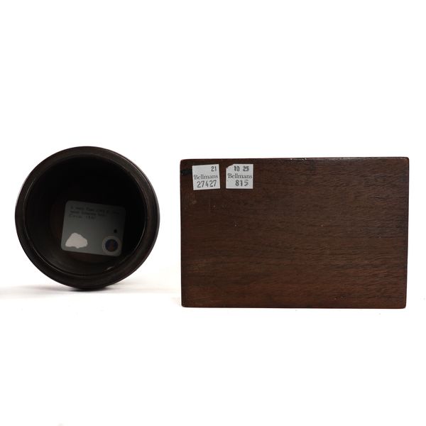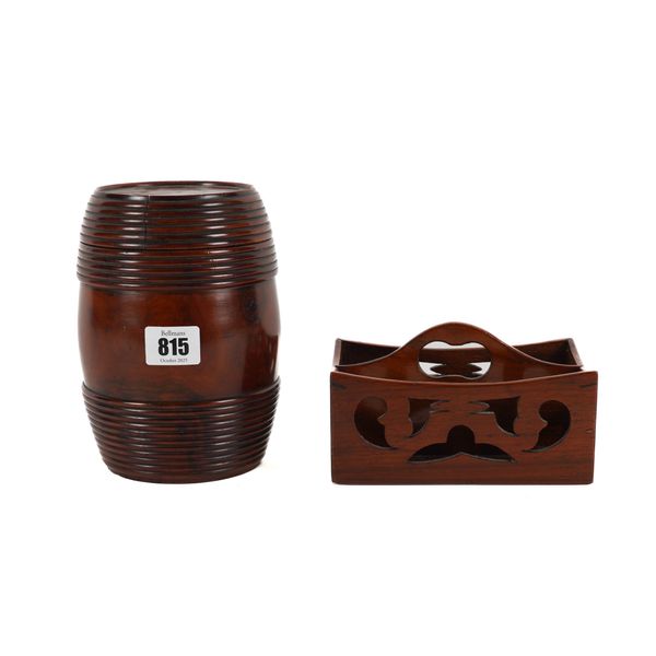 The barrel shaped box, with reeded banding to the top and bottom, 17cm high; Together with a sectional tray with cutwork decoration, 15.5cm wide
