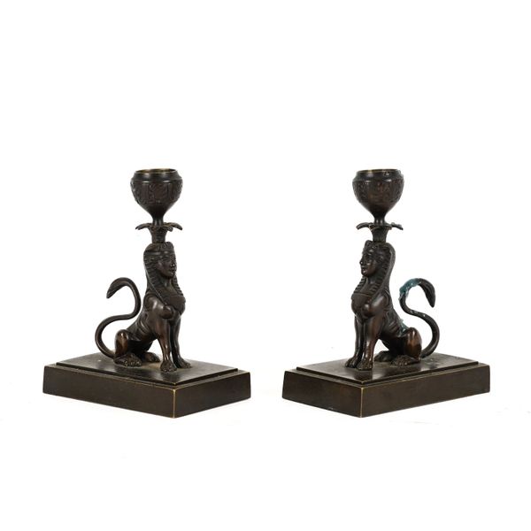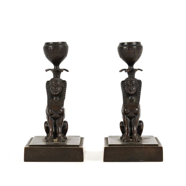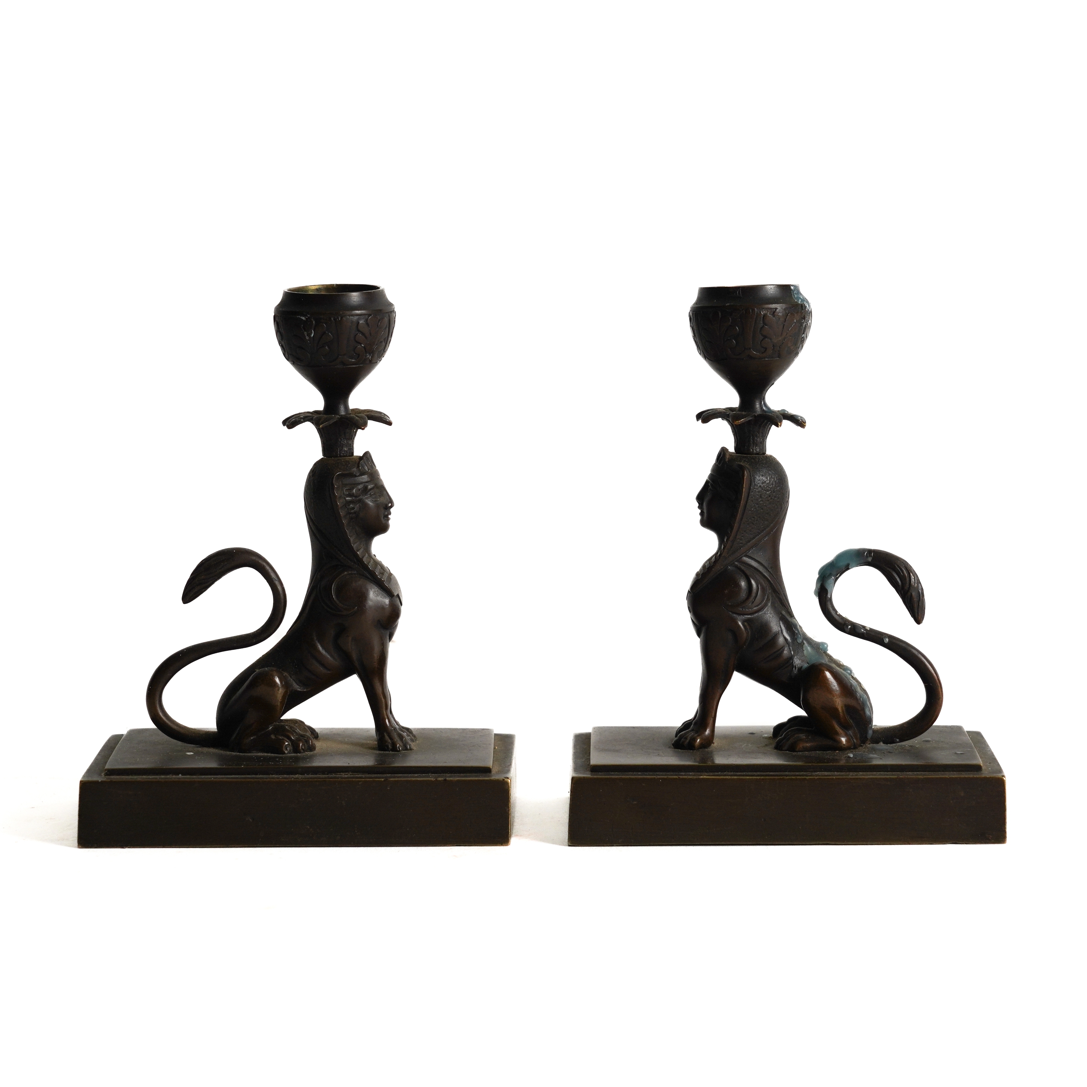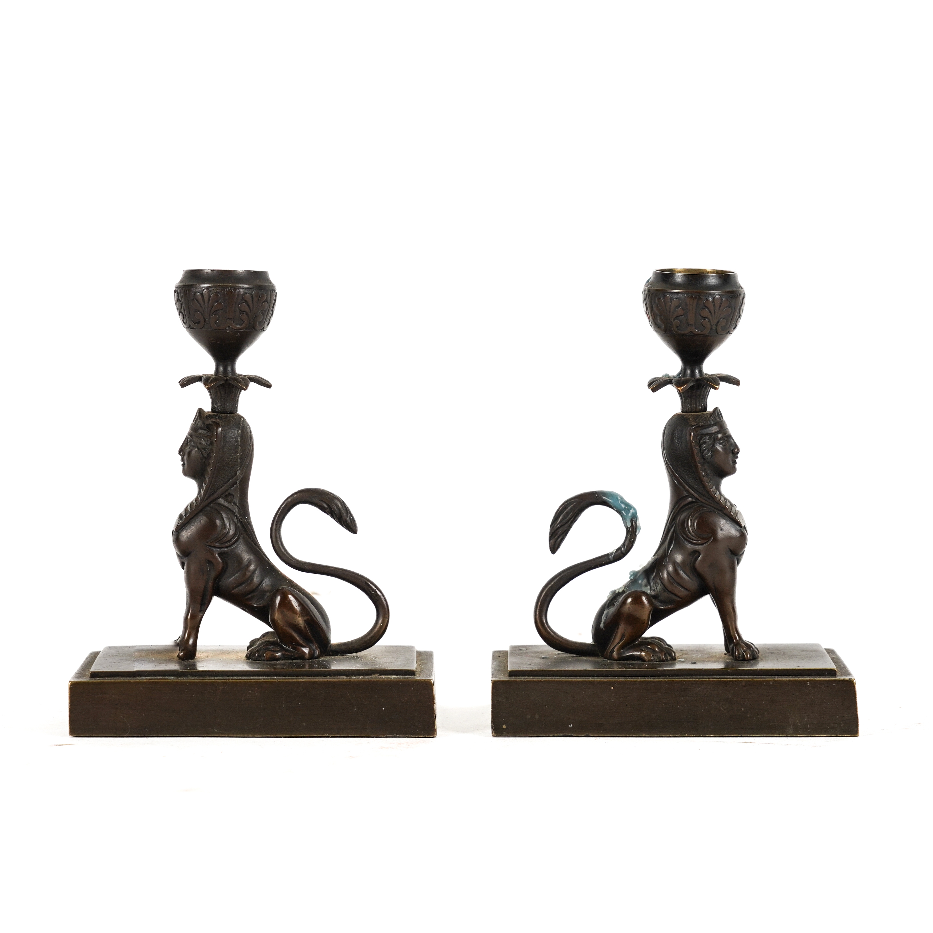OF GRAND TOUR INTEREST: A PAIR OF EGYPTIAN REVIVAL PATINATED BRONZE SPHINX CANDLESTICKS AND A PAIR OF RELIEF CAST PORTRAIT MEDALLIONS OF ATHENA AND MARS (4)