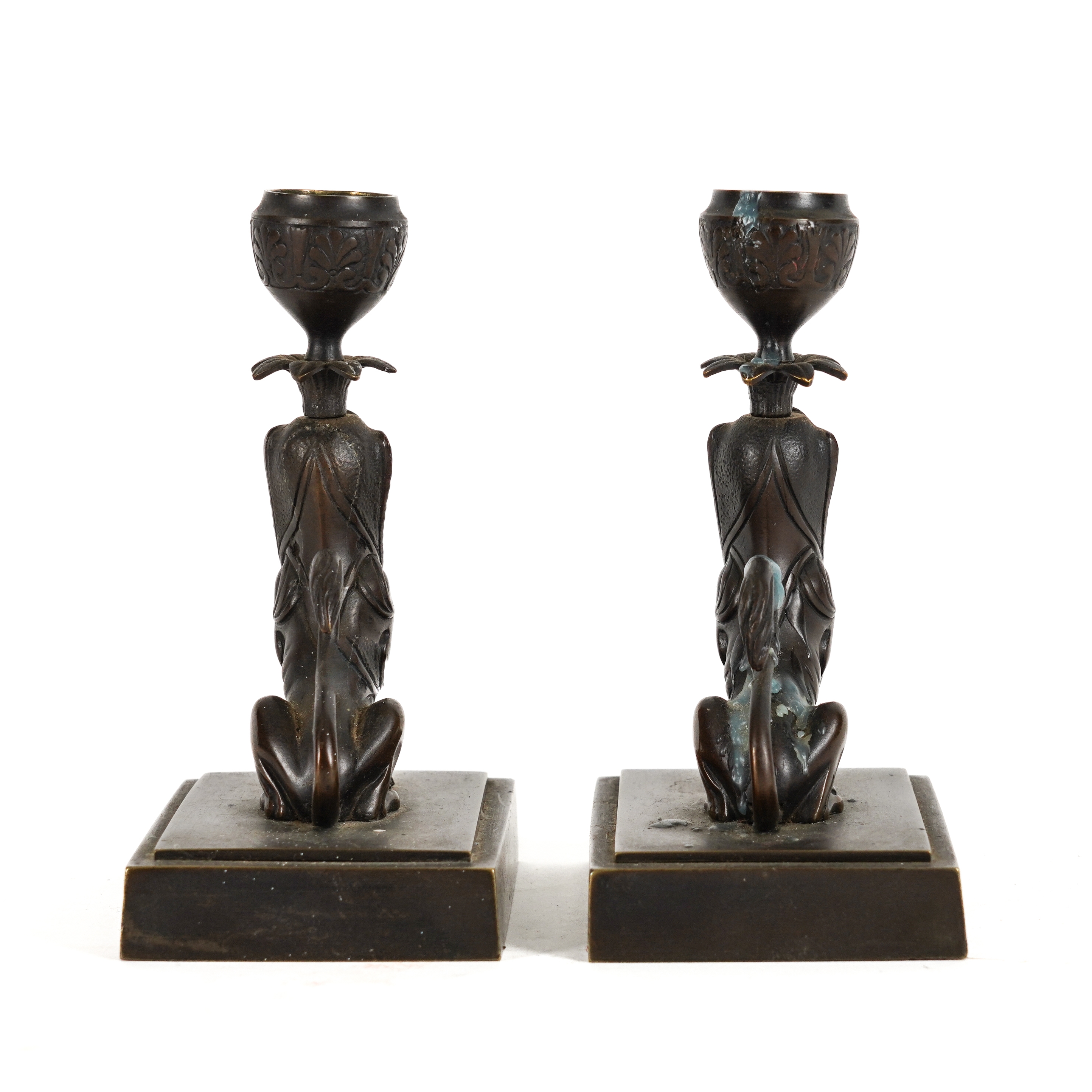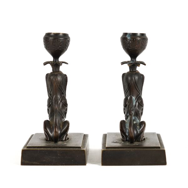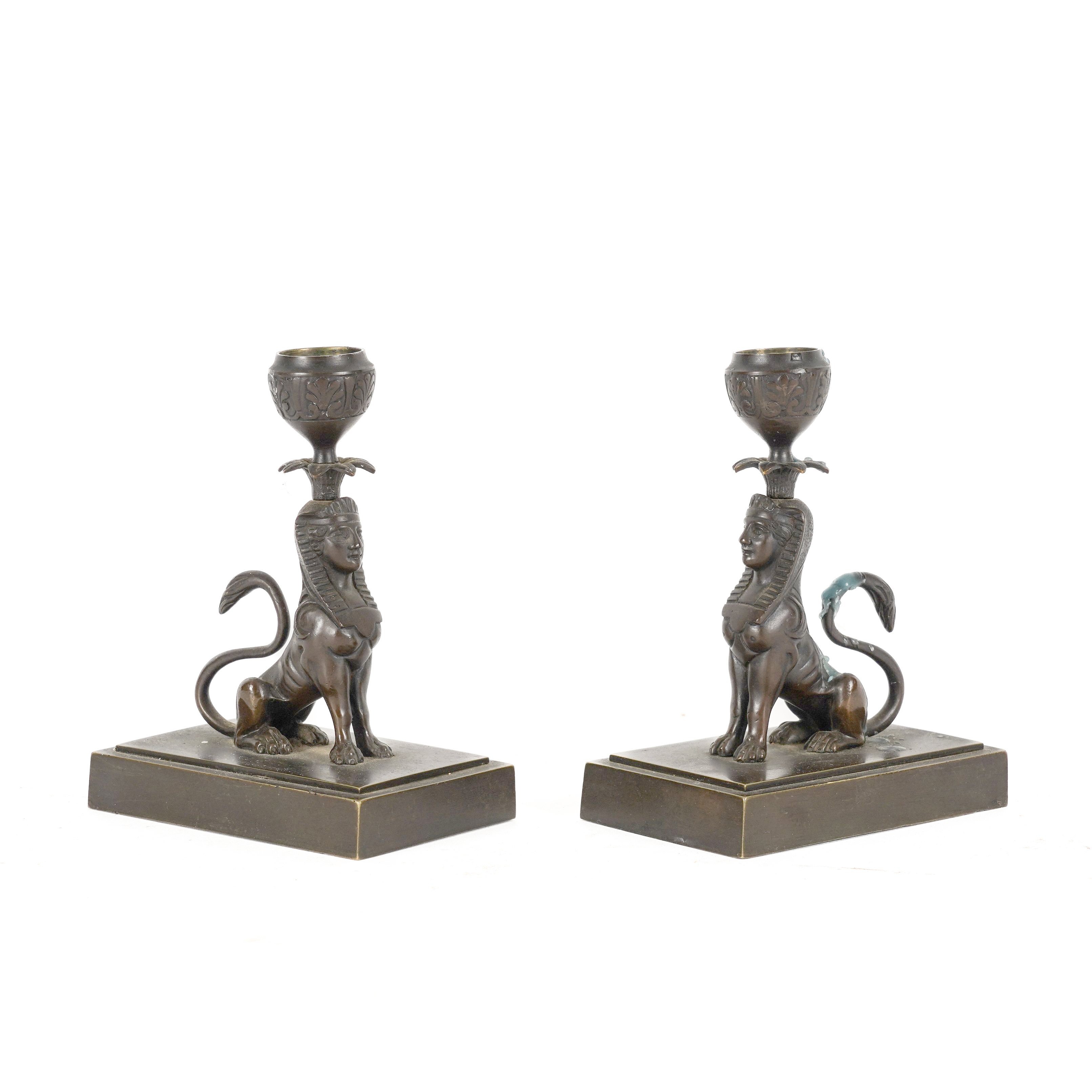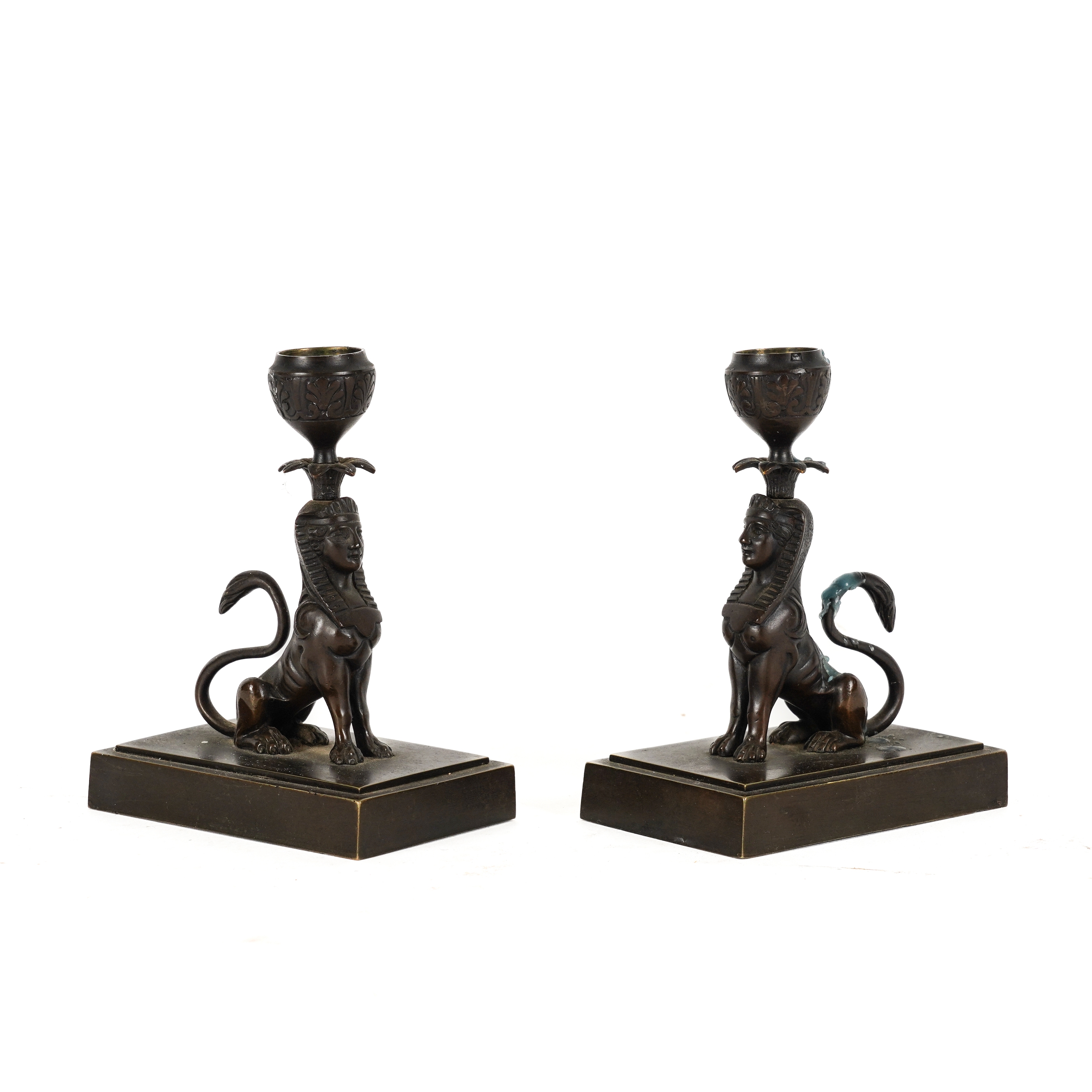 OF GRAND TOUR INTEREST: A PAIR OF EGYPTIAN REVIVAL PATINATED BRONZE SPHINX CANDLESTICKS AND A PAIR OF RELIEF CAST PORTRAIT MEDALLIONS OF ATHENA AND MARS (4)