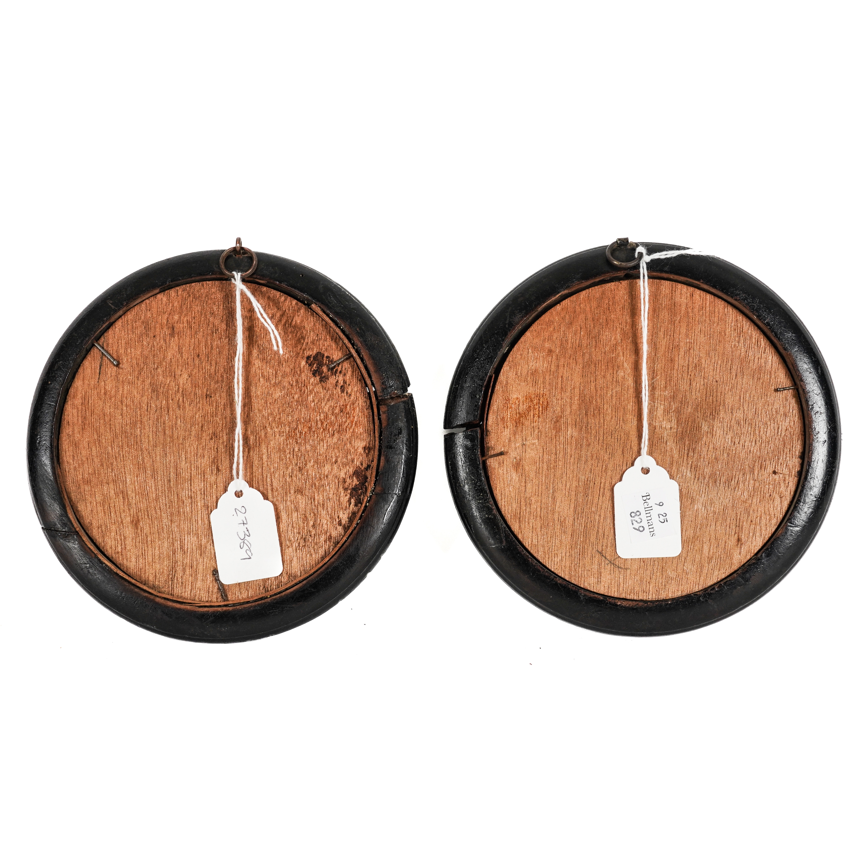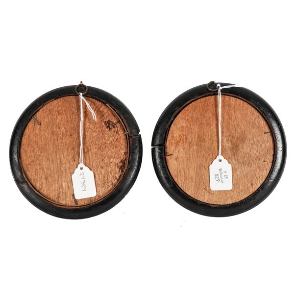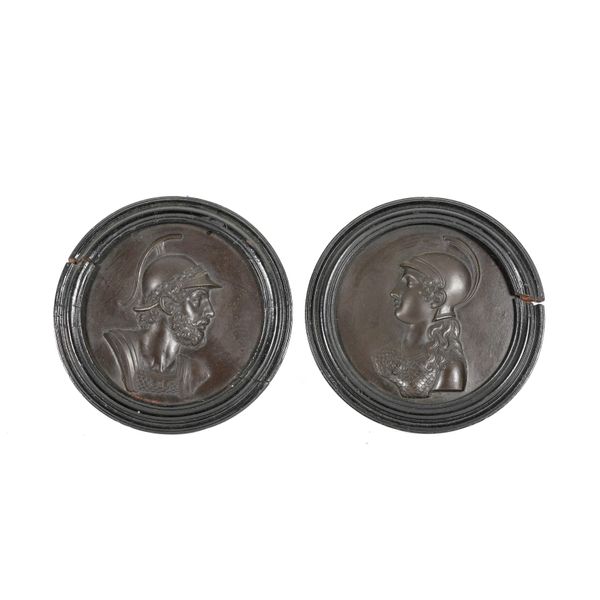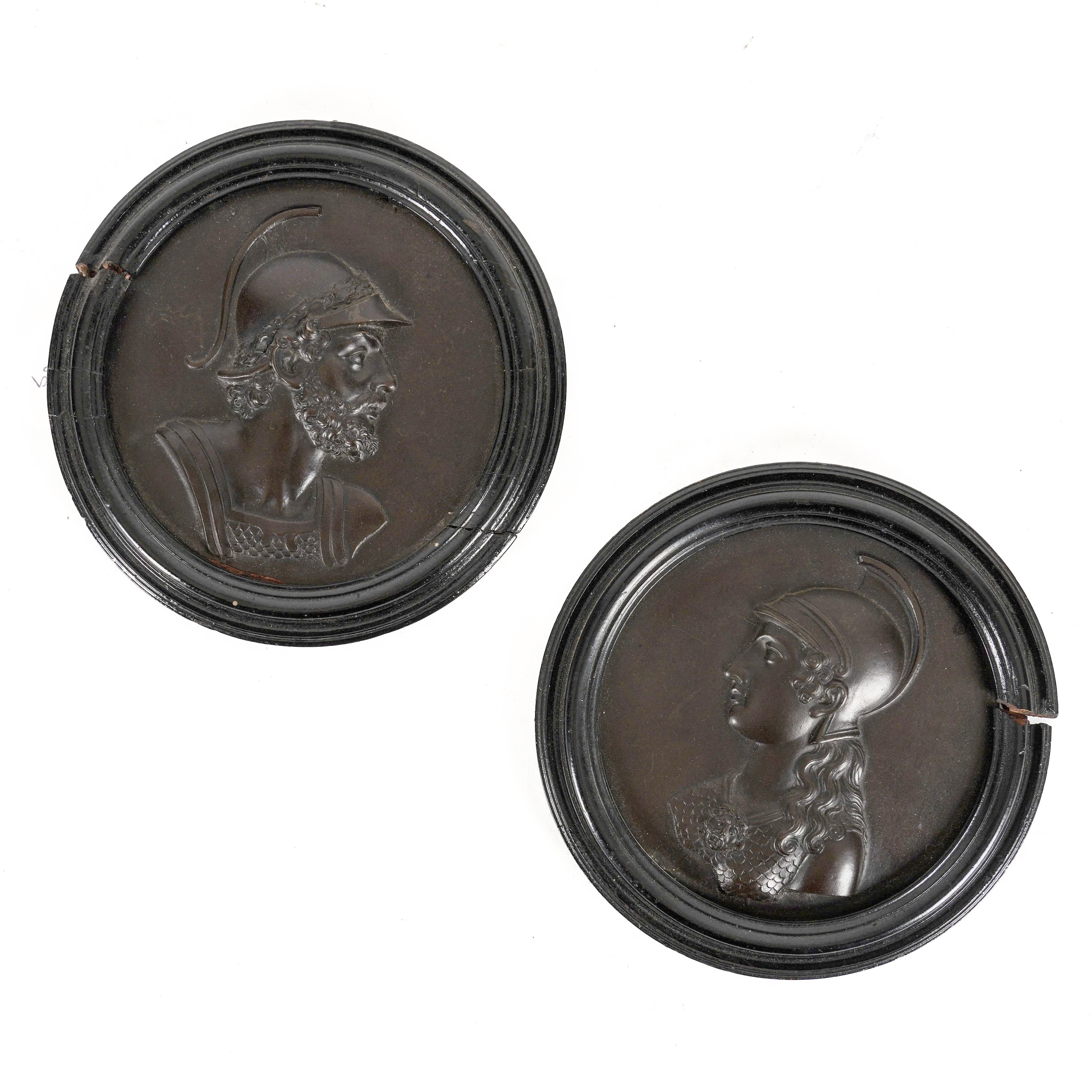 Modelled on integral plinths, 13.5cm high; the portrait plaques of Athena and Mars, mounted in ebonised frames, 15cm diam. including frames