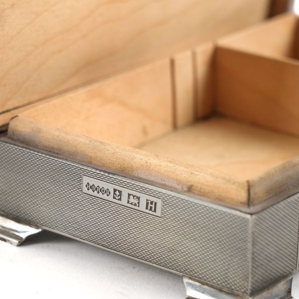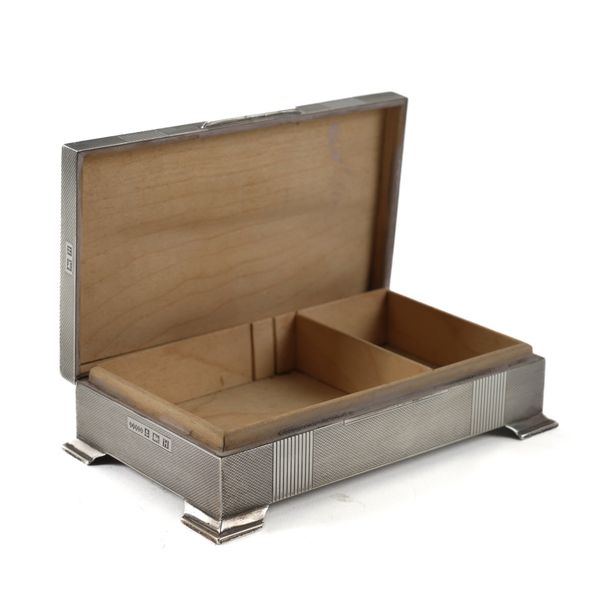 The christening mug of oval form, with engraved decoration and with a scrolling handle, Birmingham 1903, weight 59 grams, with the original case, the rectangular cigarette box decorated with reeded bands, otherwise engine turned, raised on four feet, wooden lined within, Birmingham 1957, size 15cm x 8.7cm excluding the feet