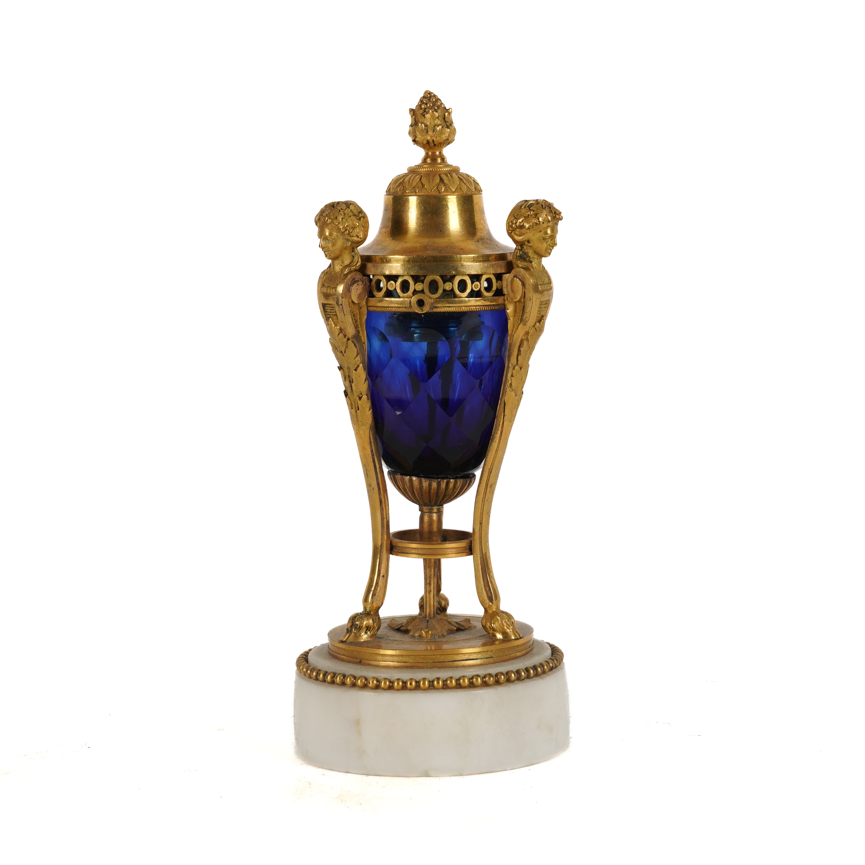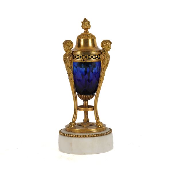 A NEO-CLASSICAL GILT-BRONZE MOUNTED BLUE GLASS CASSOLETTE VASE