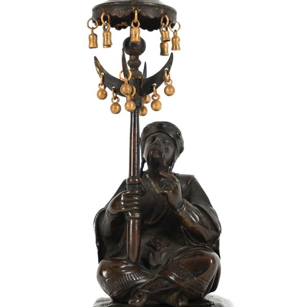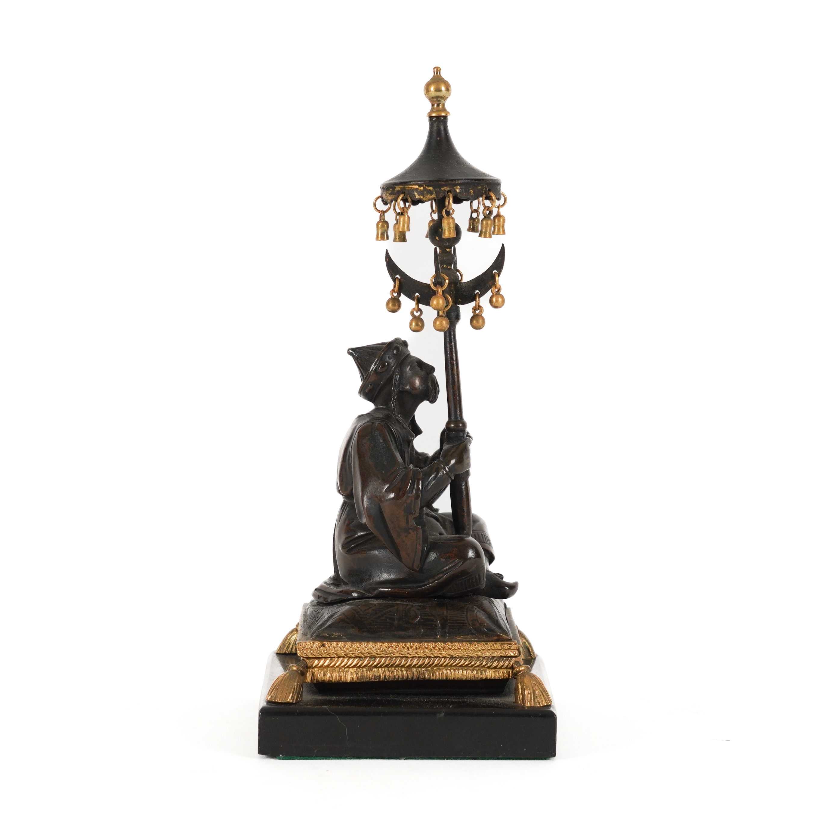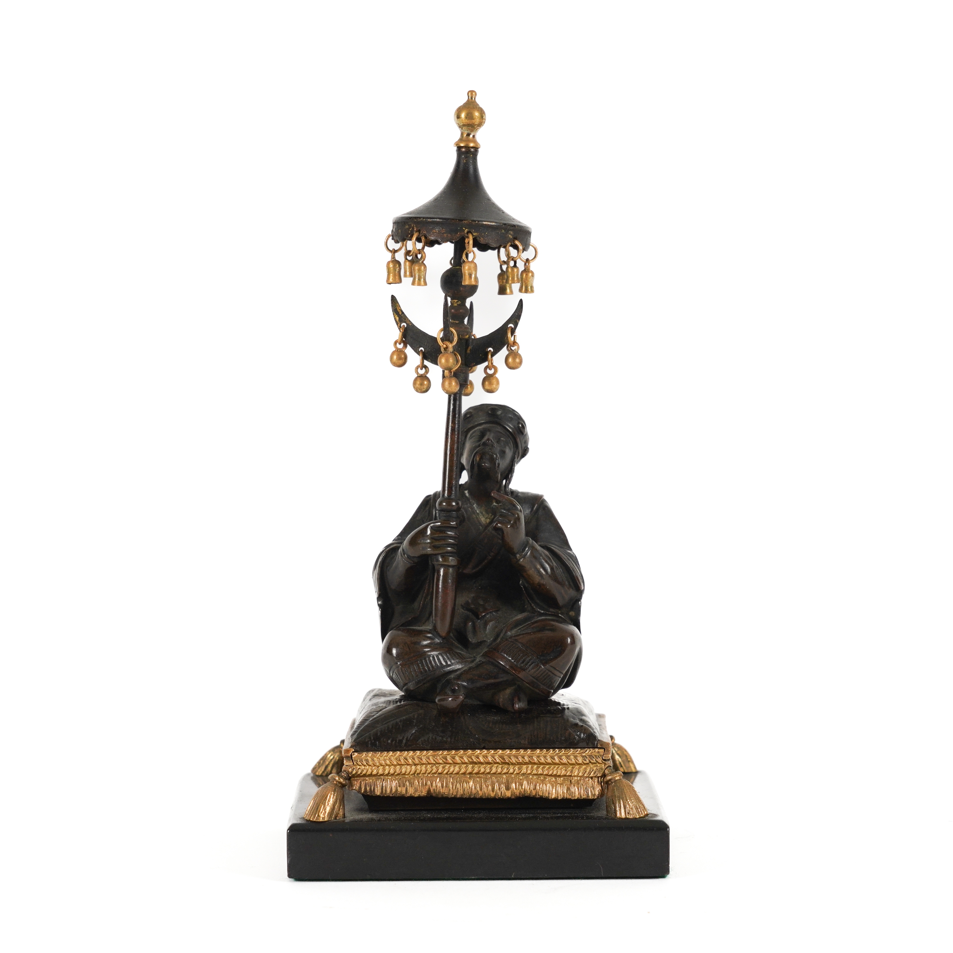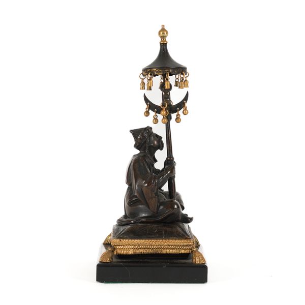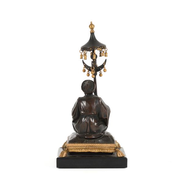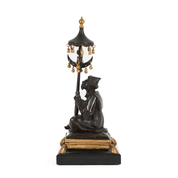 A FRENCH PARCEL-GILT AND PATINATED BRONZE MODEL OF A SEATED CHINESE OPIUM SELLER