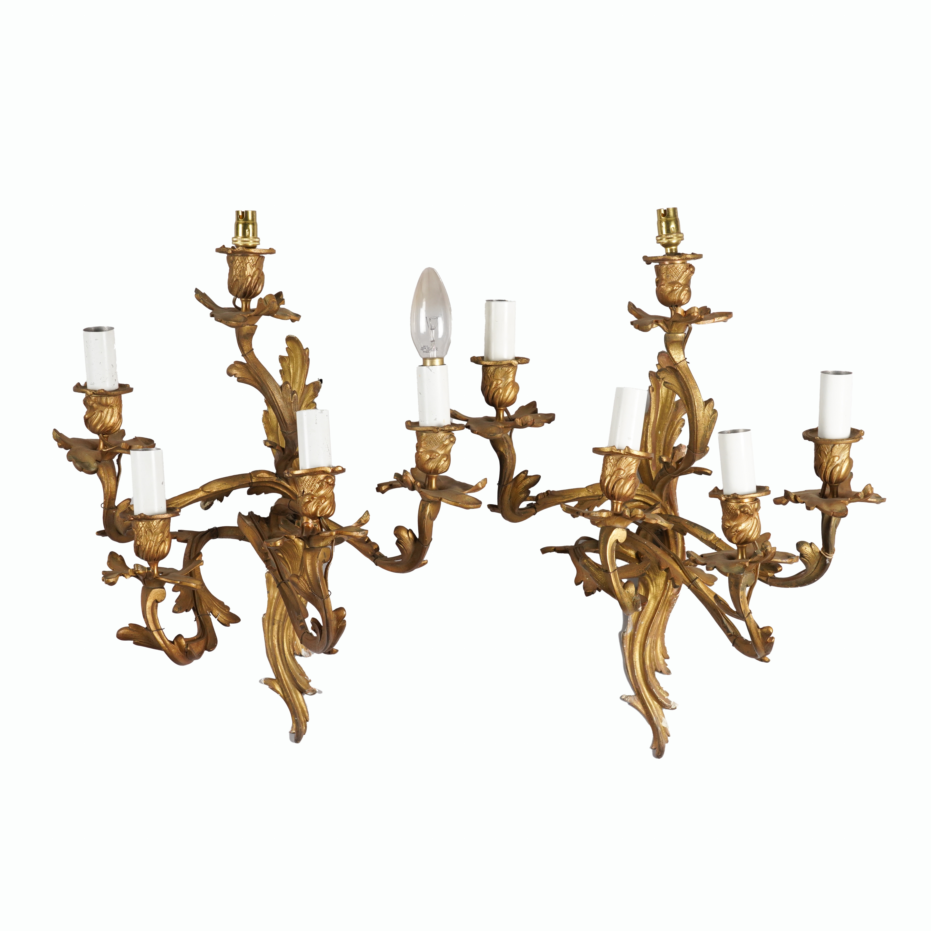 A PAIR OF LOUIS XV ROCOCO REVIVAL GILT-METAL FIVE LIGHT WALL APPLIQUES (2)