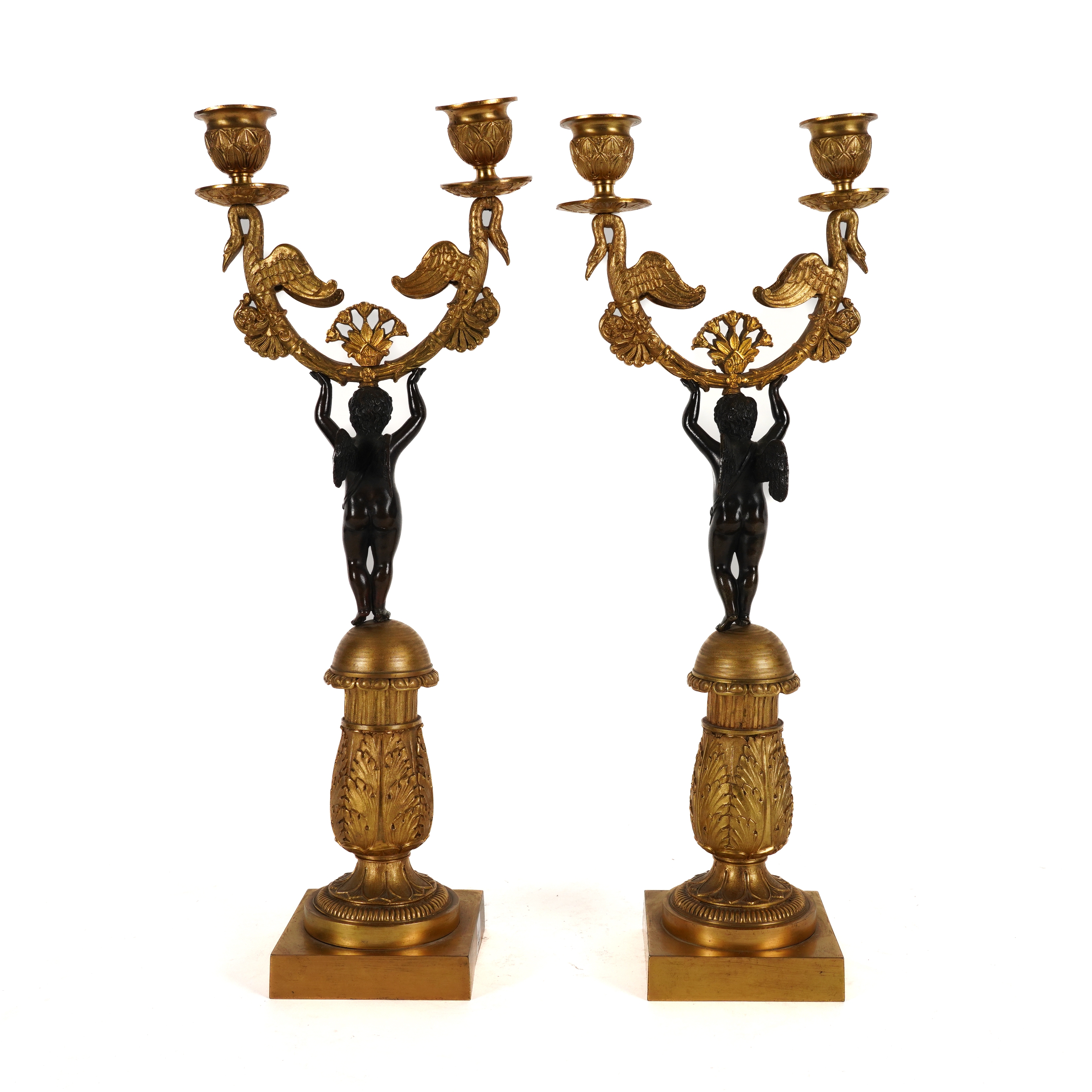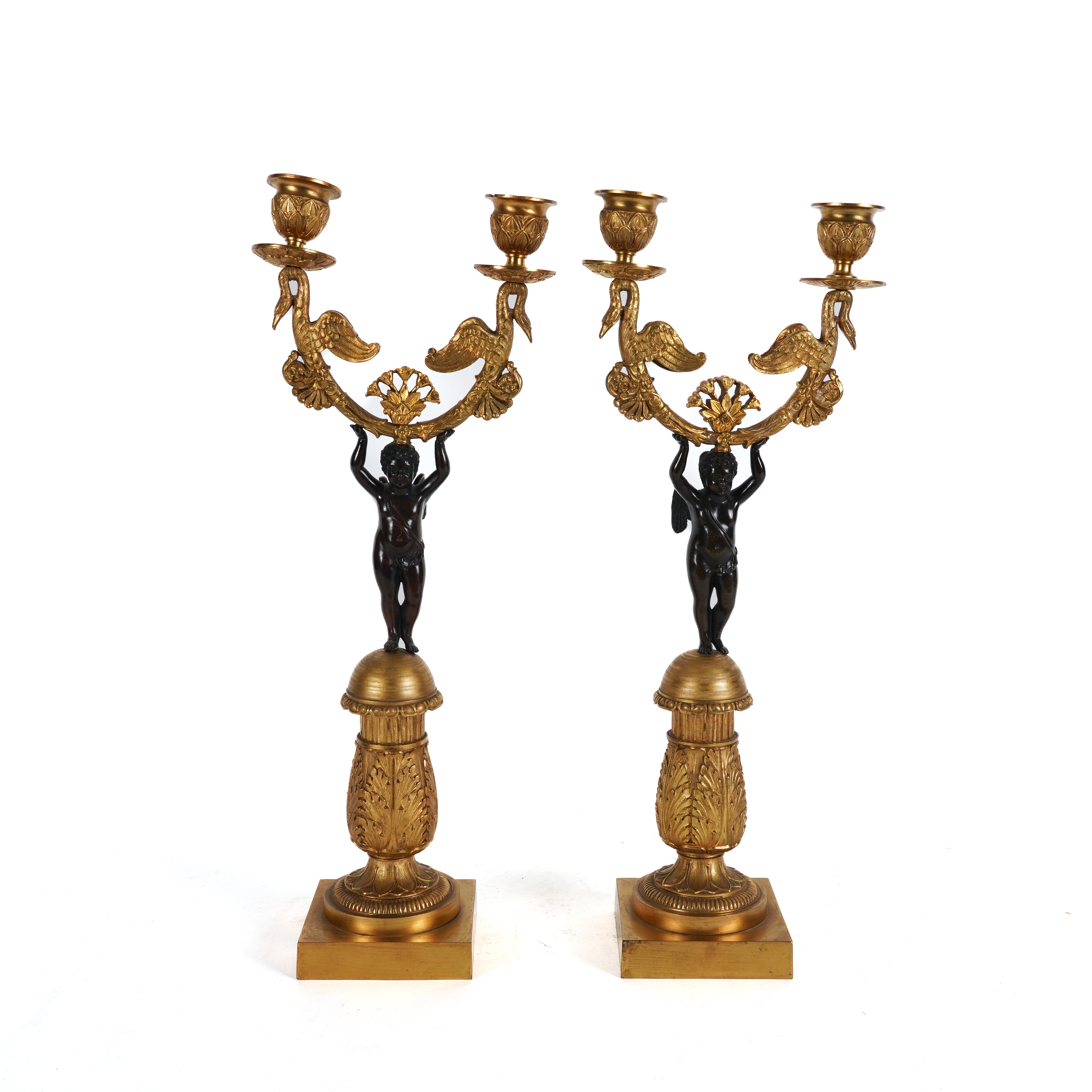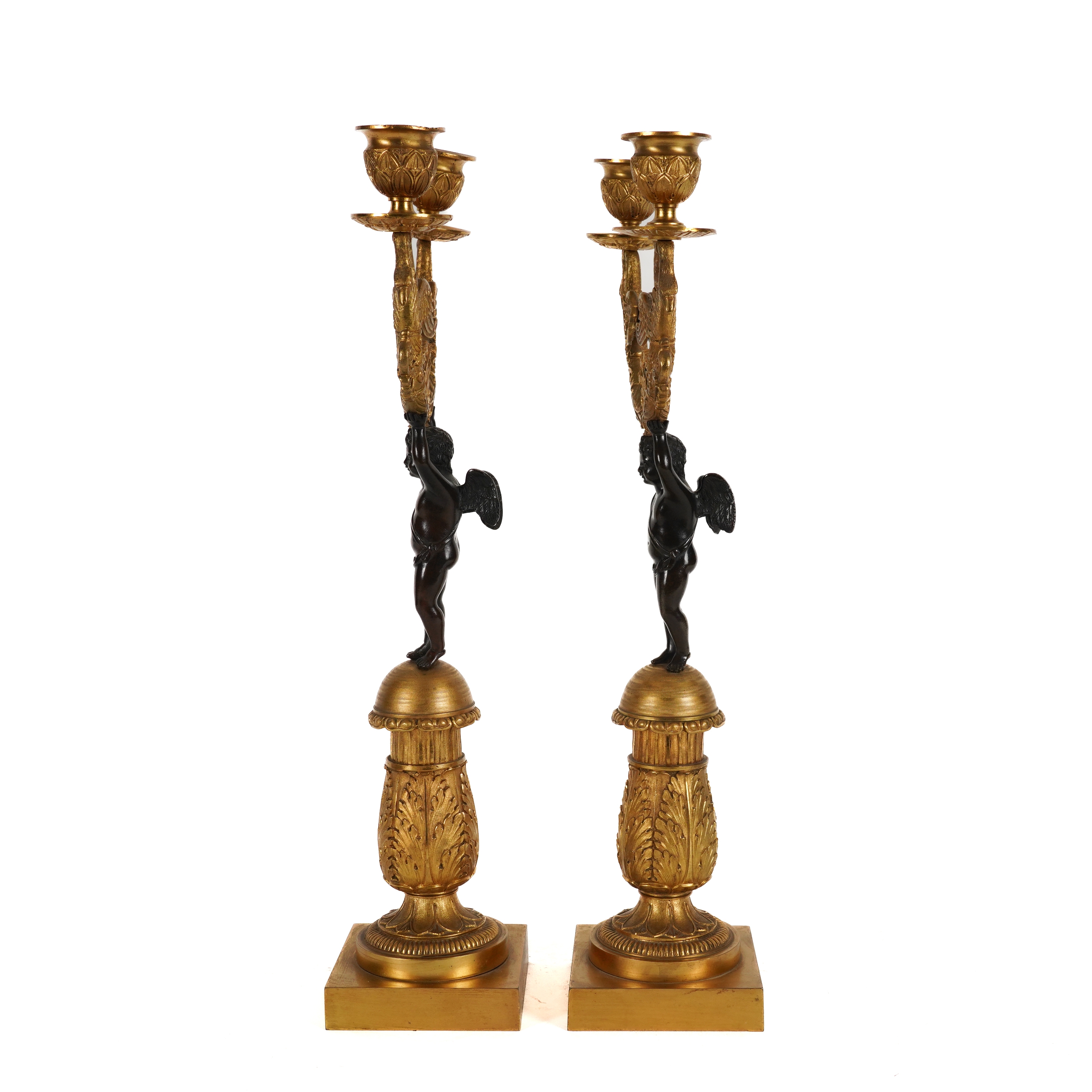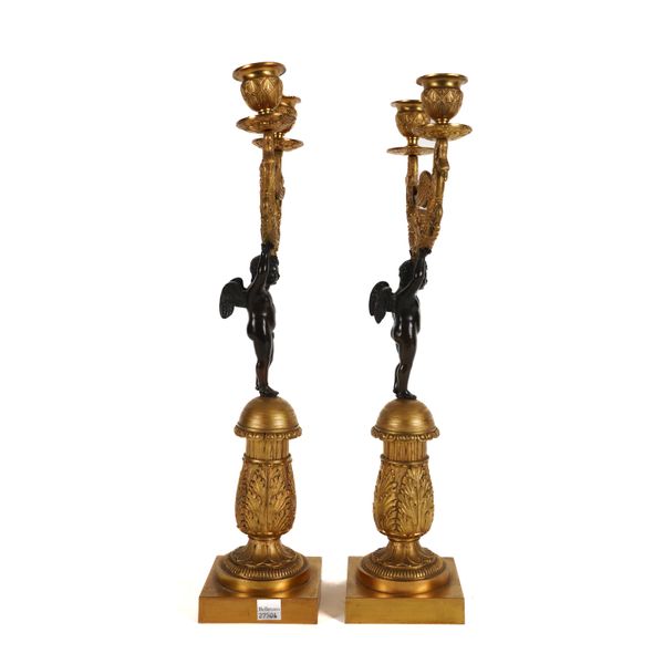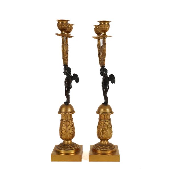 A PAIR OF FRENCH RESTAURATION GILT AND PATINATED METAL TWIN LIGHT CANDELABRA (2)