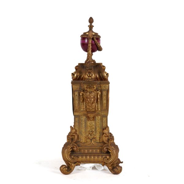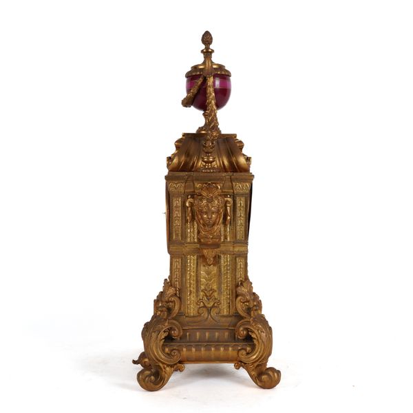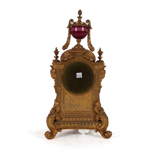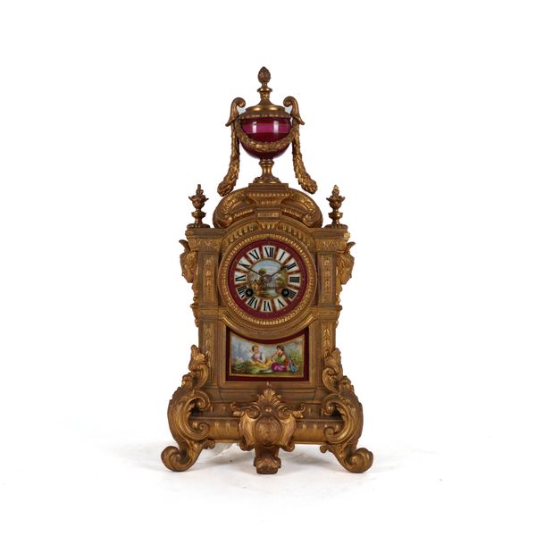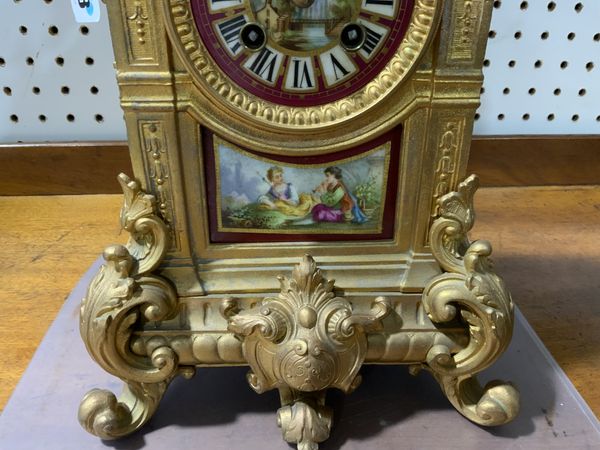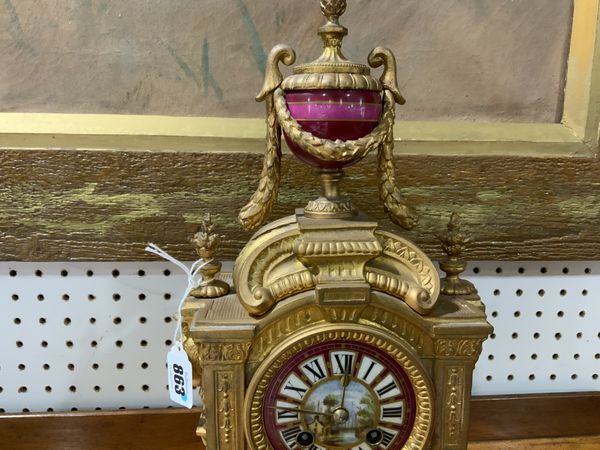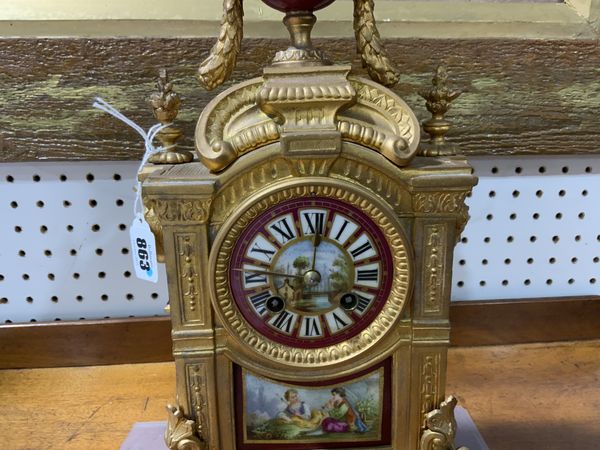 A FRENCH GILT SPELTER AND PARIS SEVERES STYLE PORCELAIN MOUNTED MANTEL CLOCK