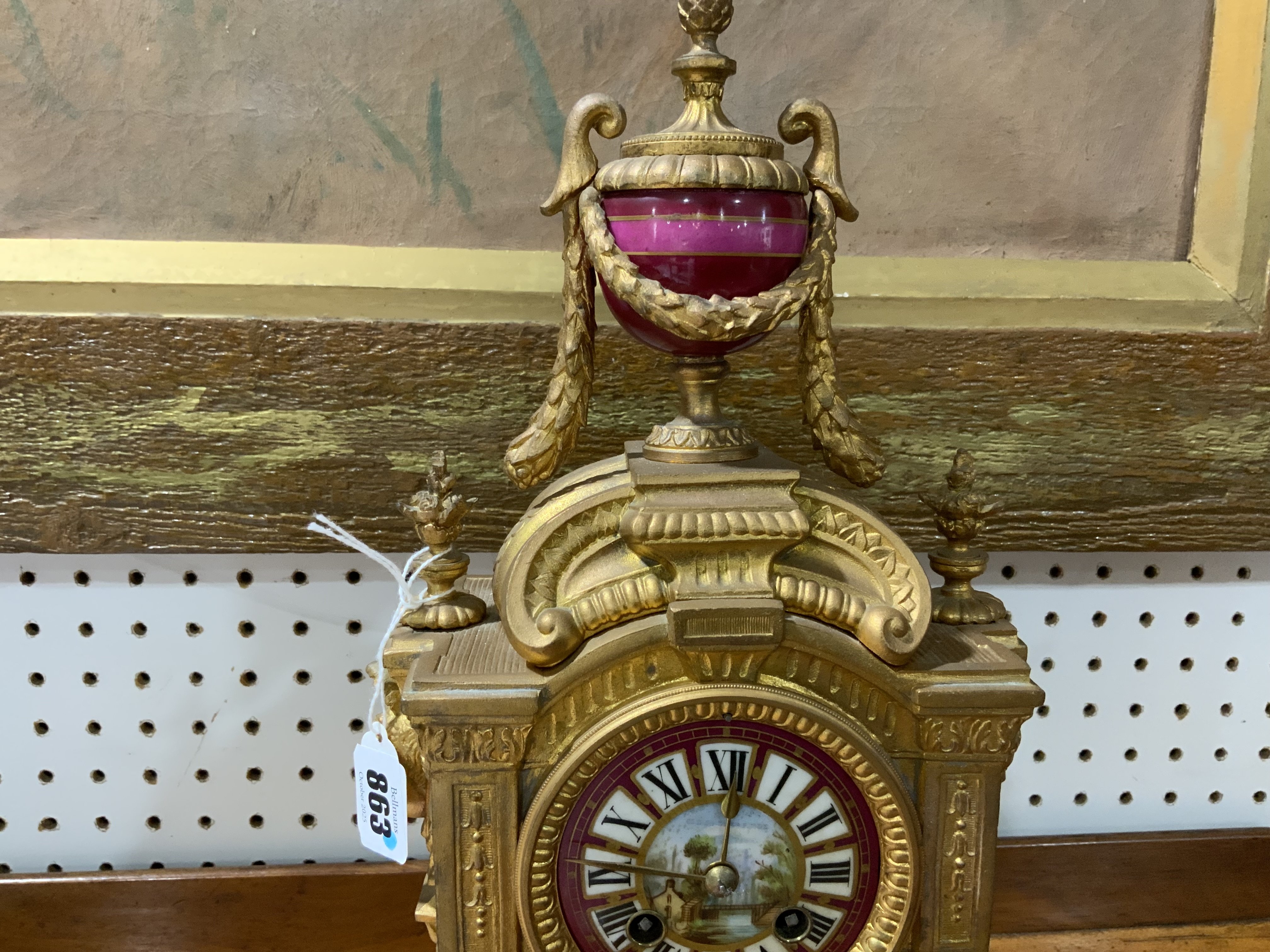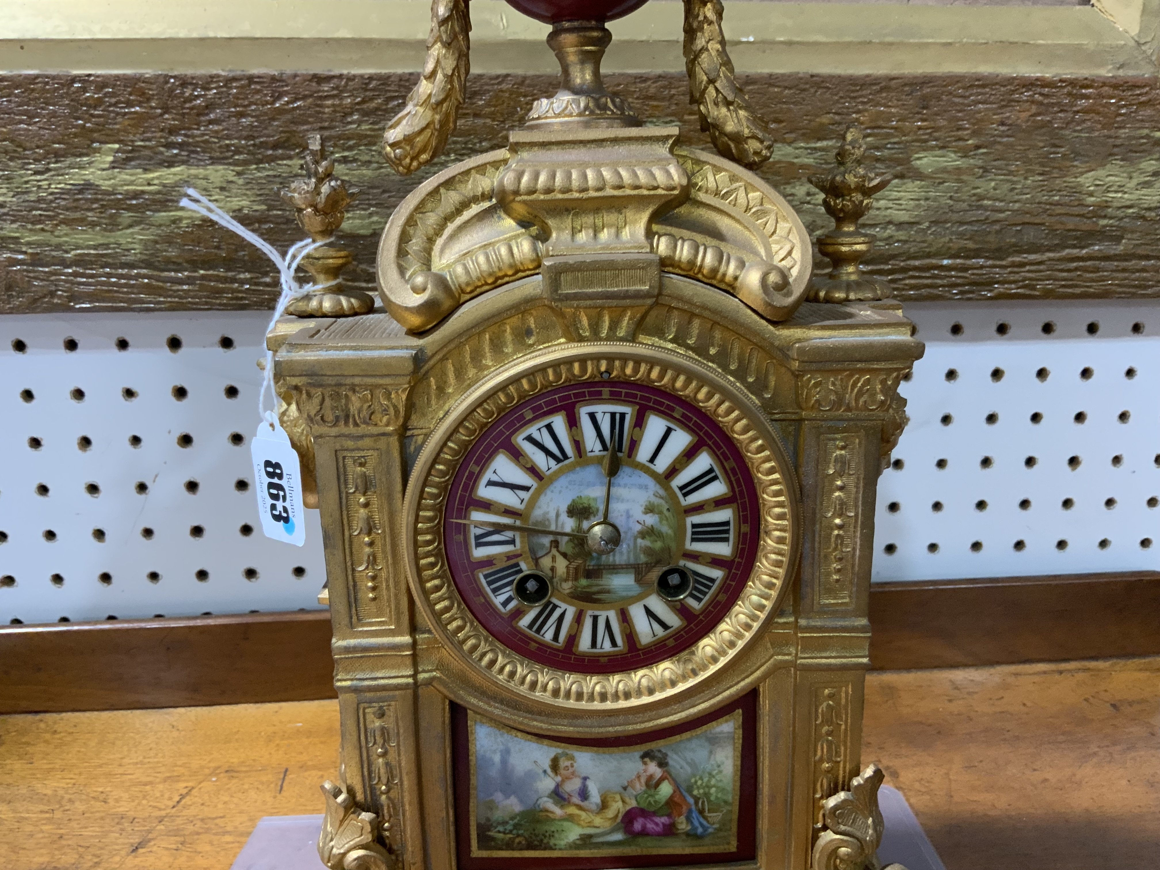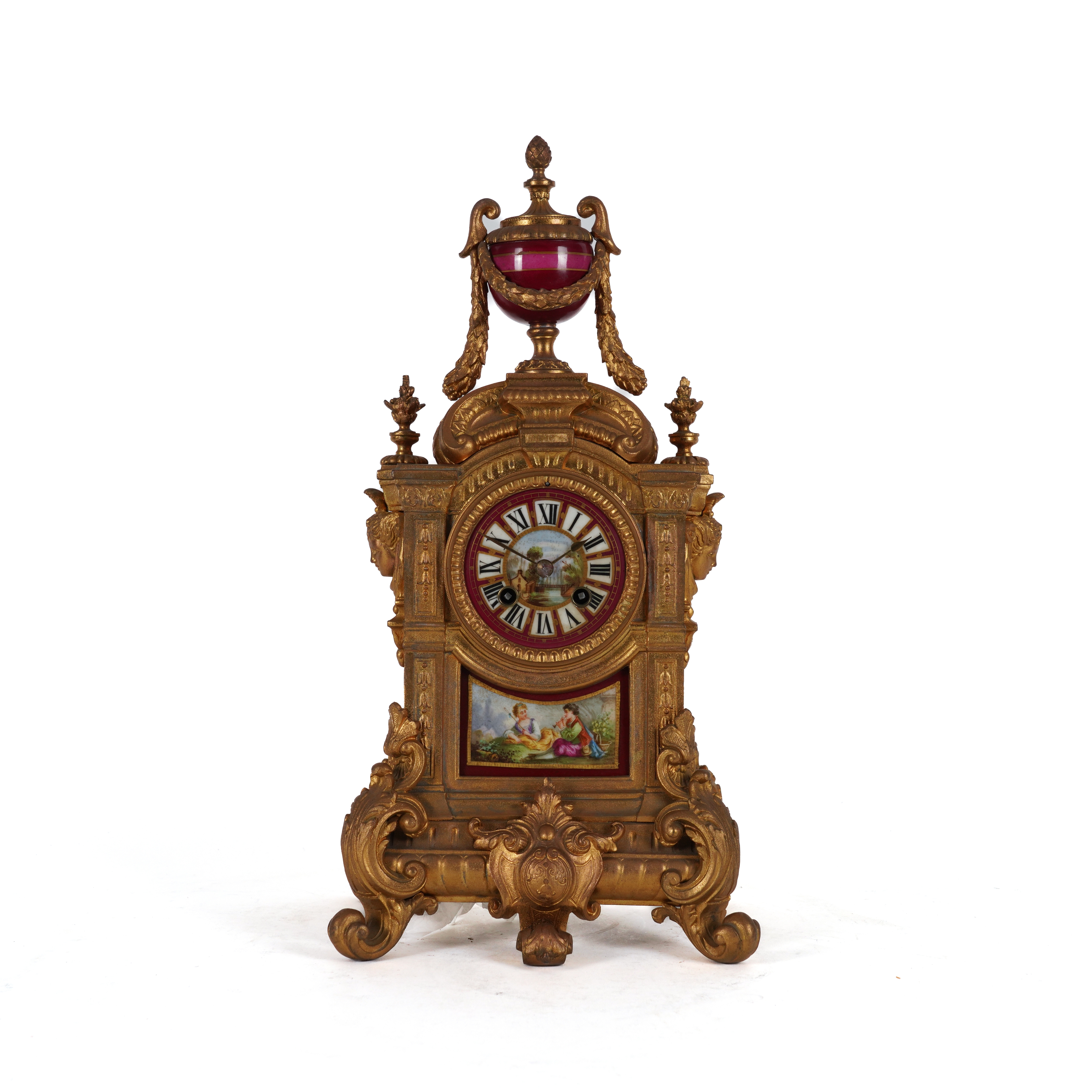 With laurel swagged urn surmounting a mask mounted case with scroll feet, the dial and panel beneath decorated with a landscape and figures, the twin train movement with count wheel strike on bell, with Japy Freres seal and numbered, pendulum and key, 43cm high