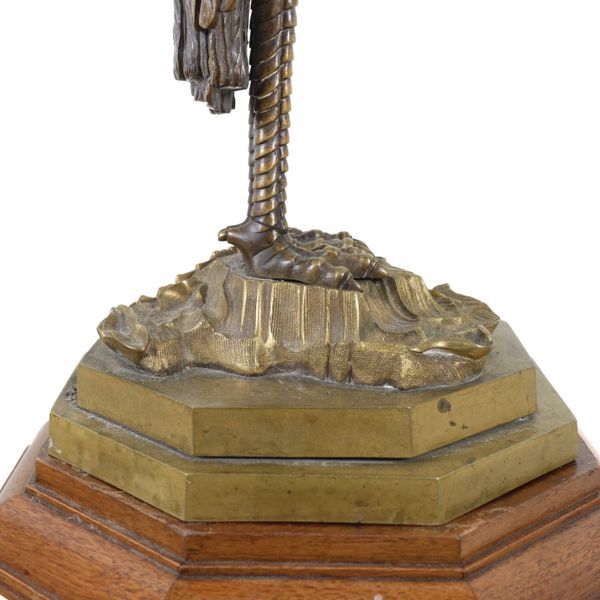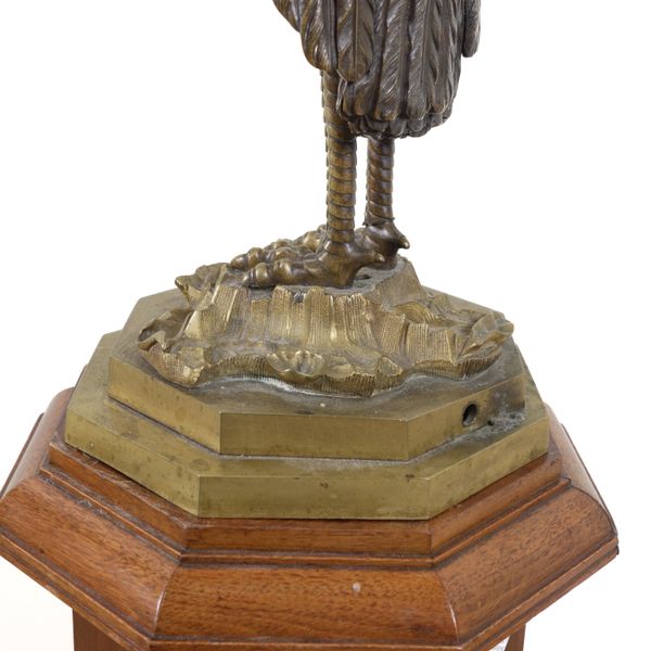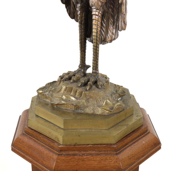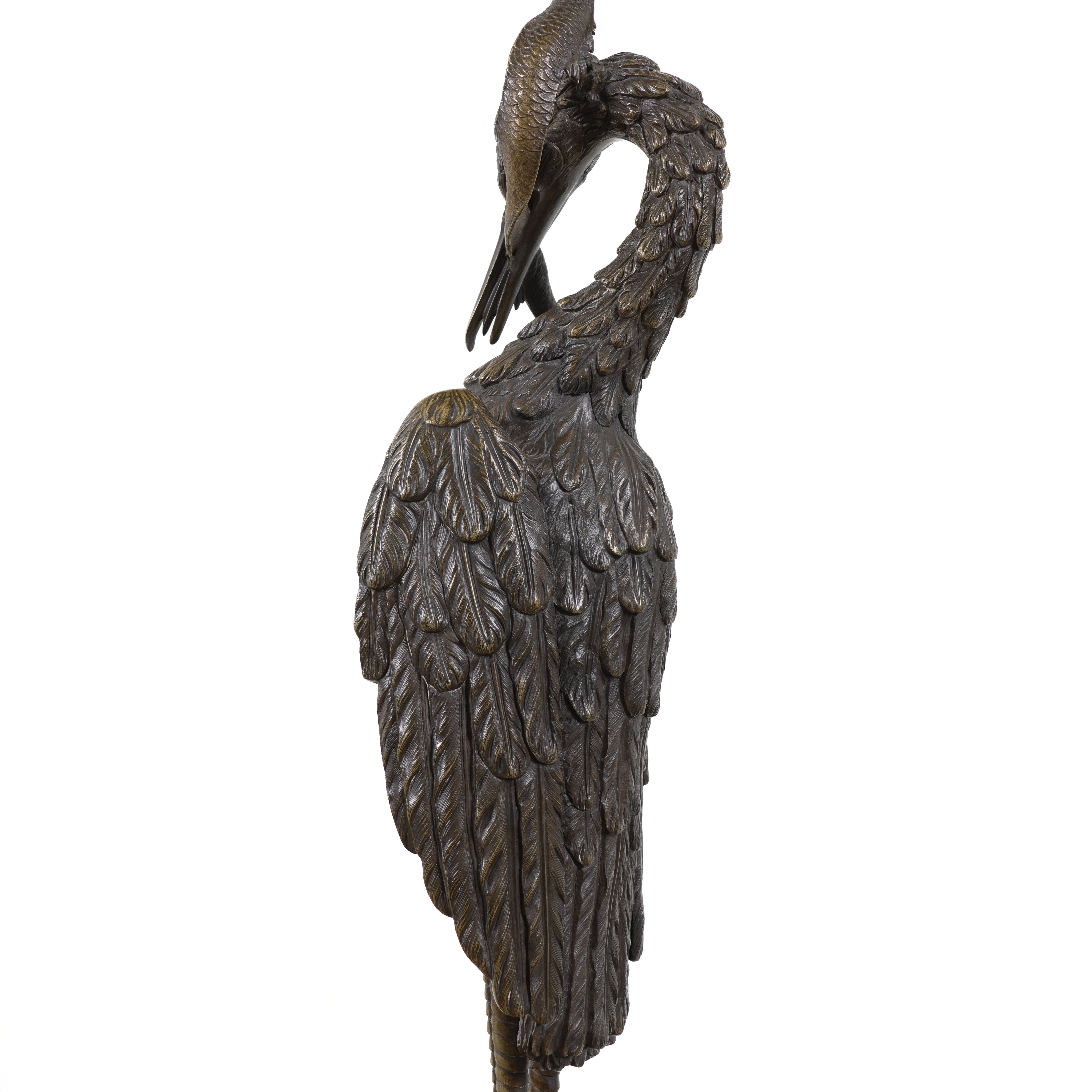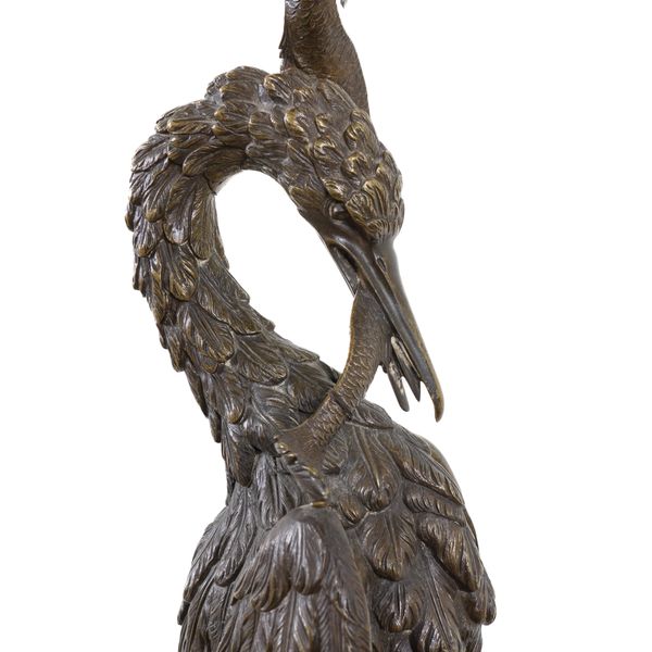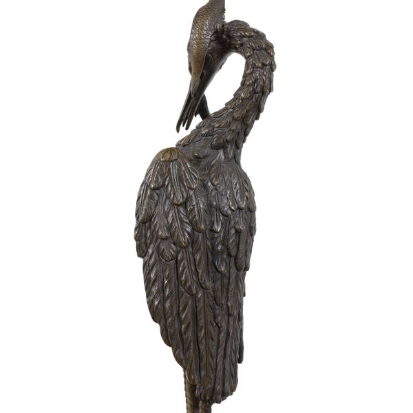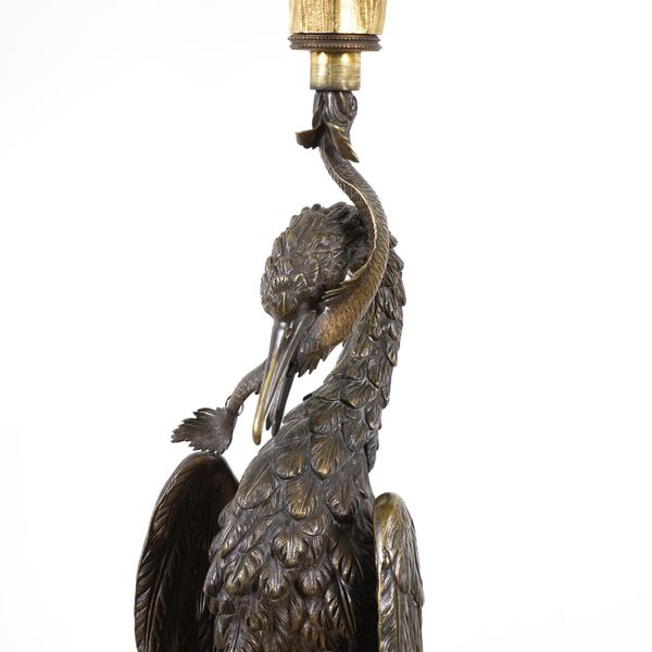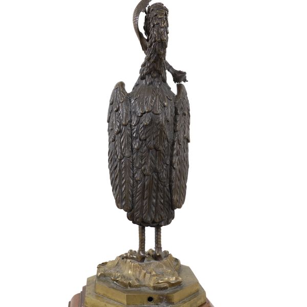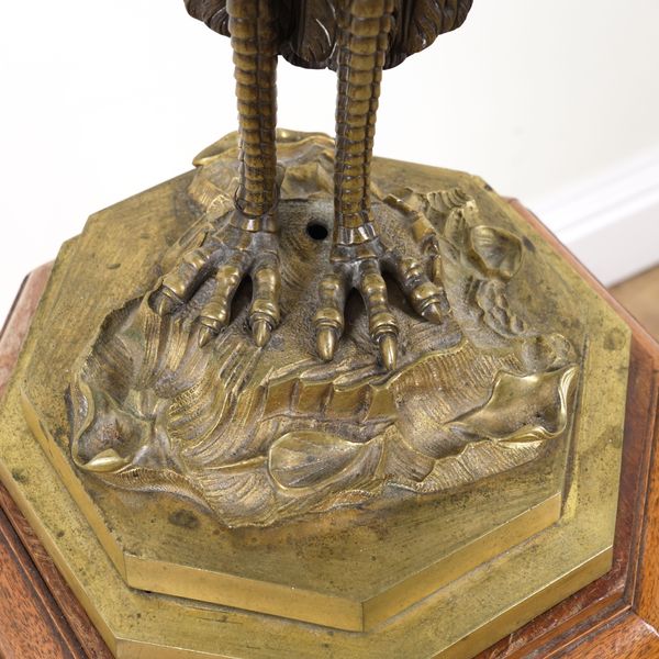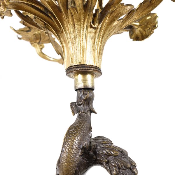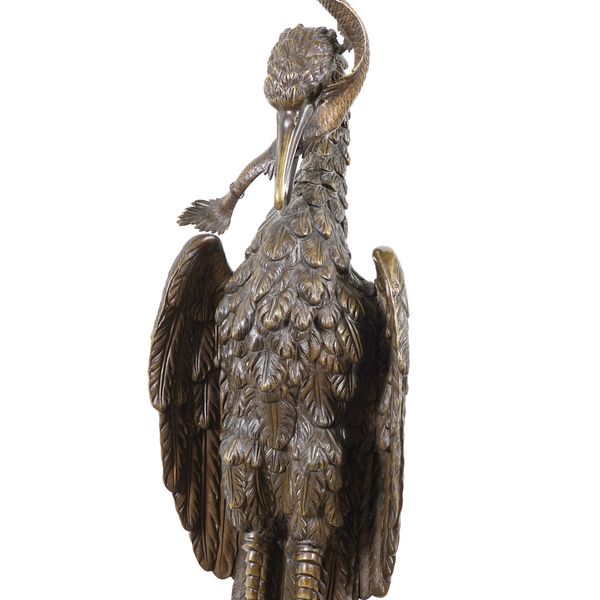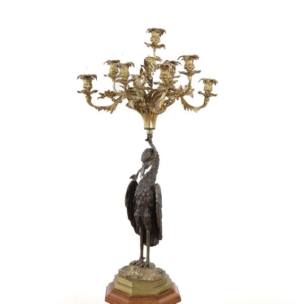 Modelled as a stork clasping a fish, supporting an acanthus socle issuing acanthus scrolling branches, on an octagonal oak plinth, 172 cm high in total