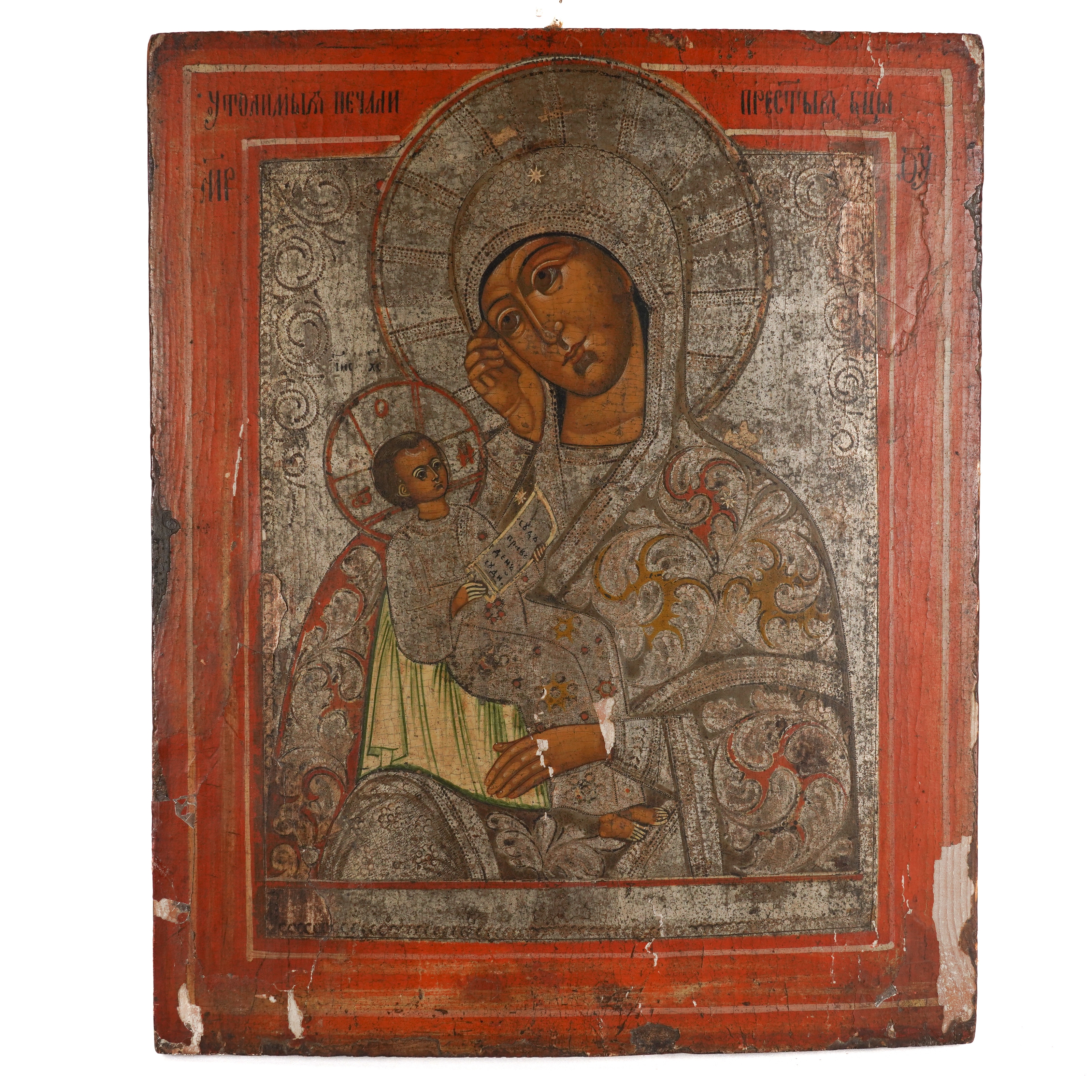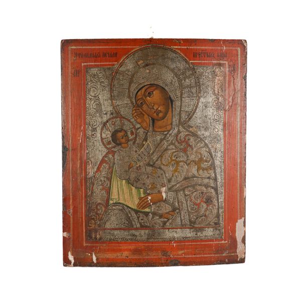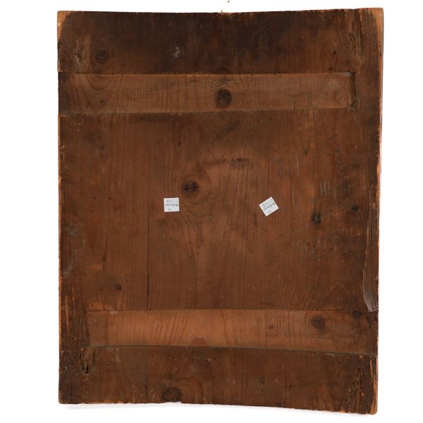 19th Century Painted on wood panel with red ground and silvered, script to the top left and right, 39cm wide; 47.5cm high