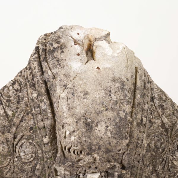 The bust, lacking head, later decorated in formal robes decorated with scrolls and flower motifs, pleated details and possibly a ruff collar, on rectangular metal base, 85cm high