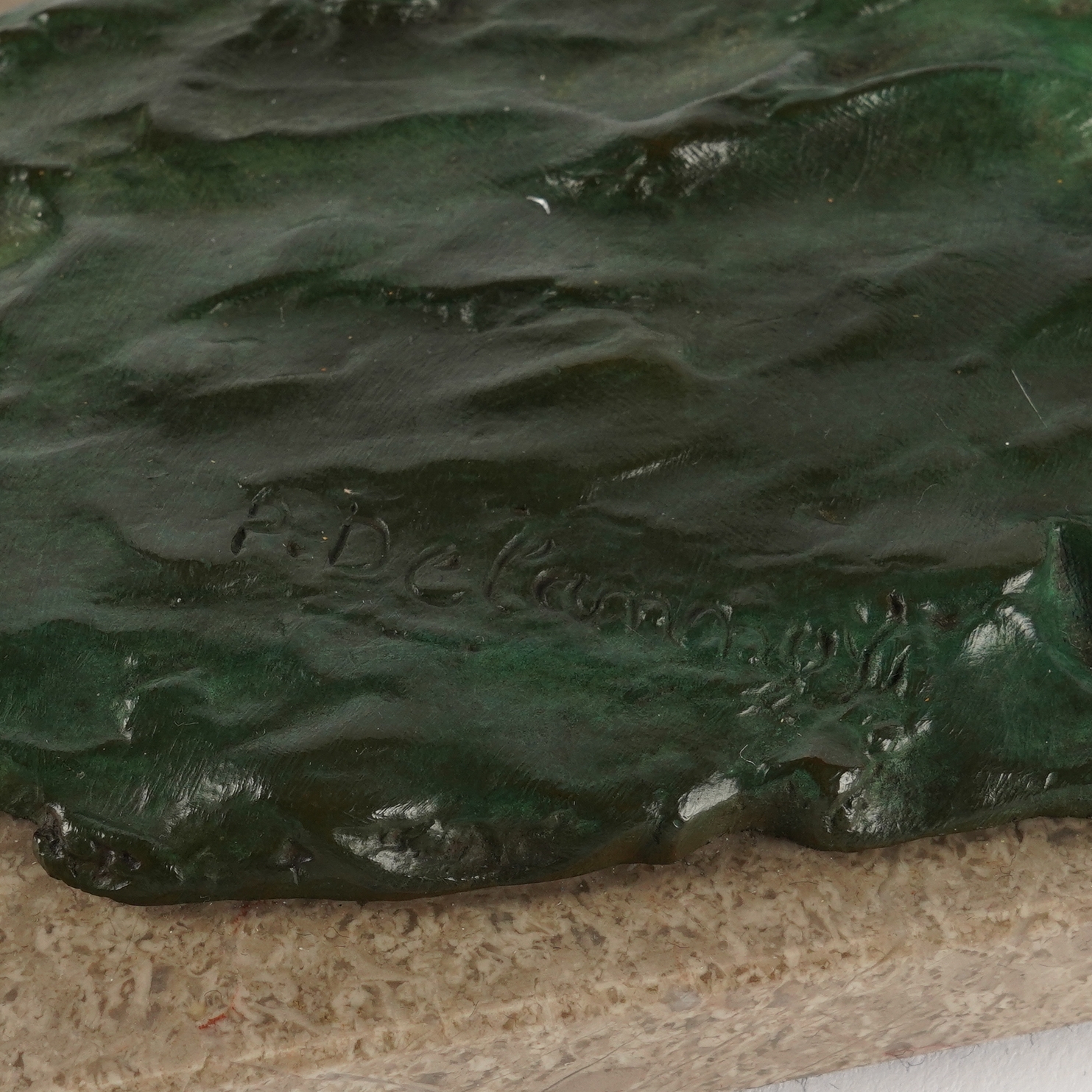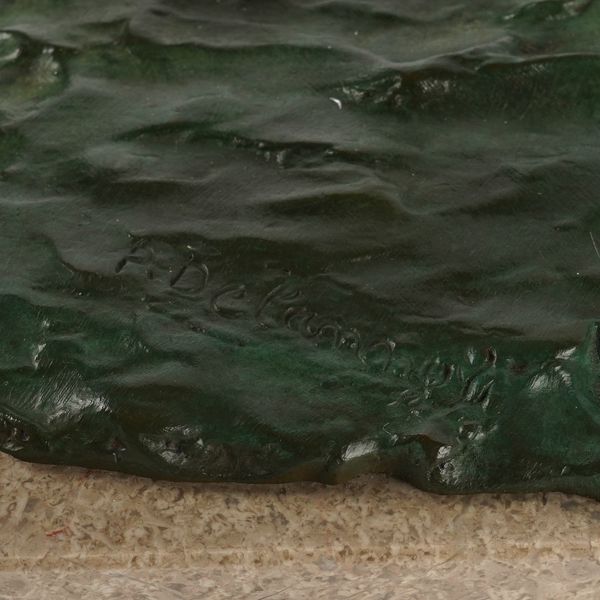 Modelled mid-stroke half submerged beneath the water, signed 'R. De L'a****' indistinctly, upon a marble base, 38cm wide