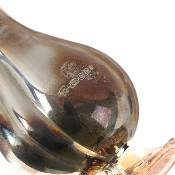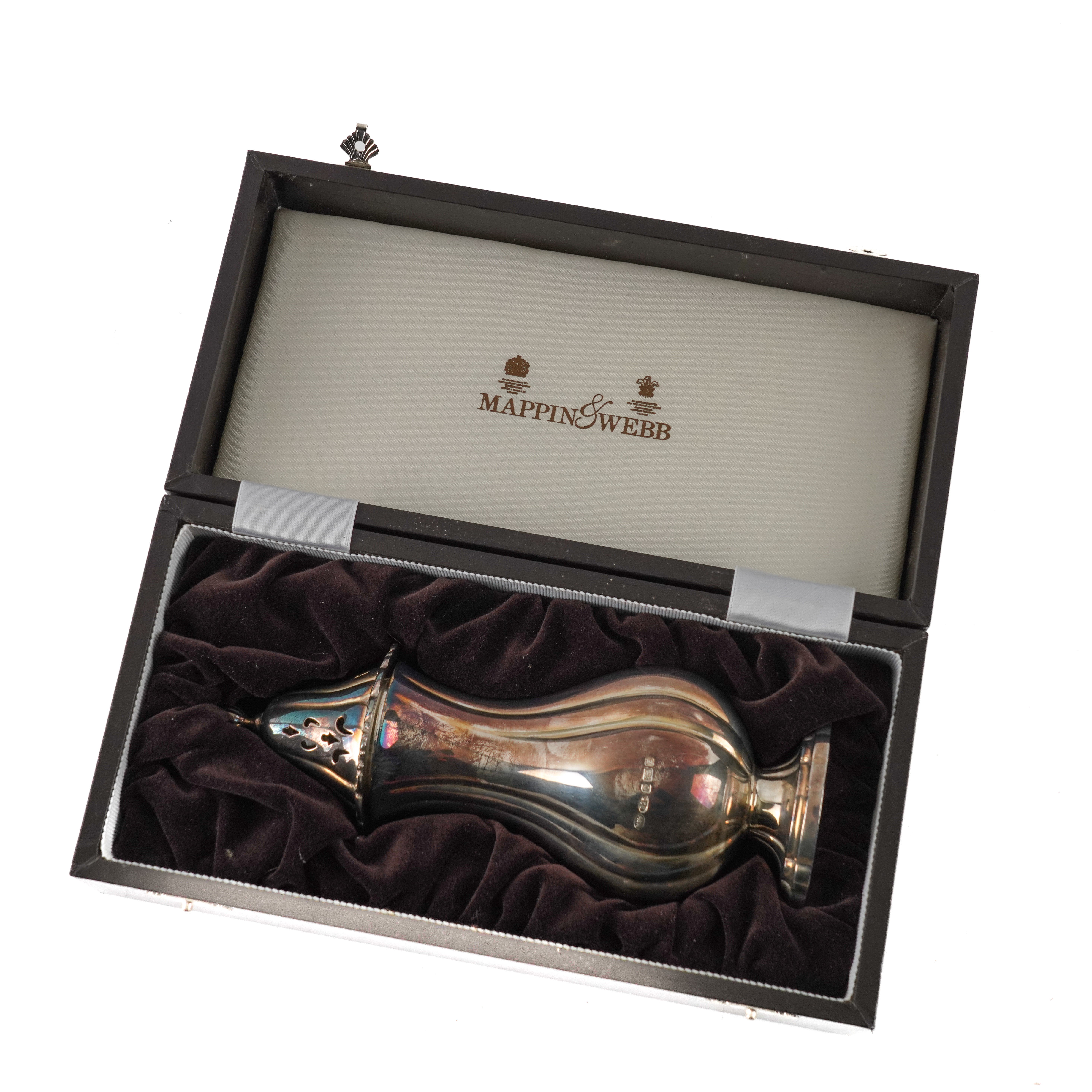 Of baluster form with fluted decoration, raised on an oval foot and with a bud finial to the detachable top, height 18cm, Sheffield 1999, by Mappin and Webb, with a case, weight 169 grams