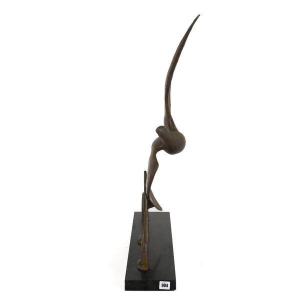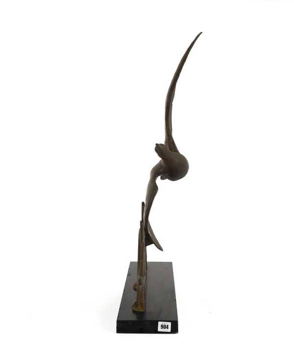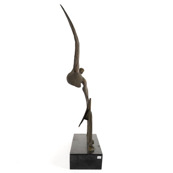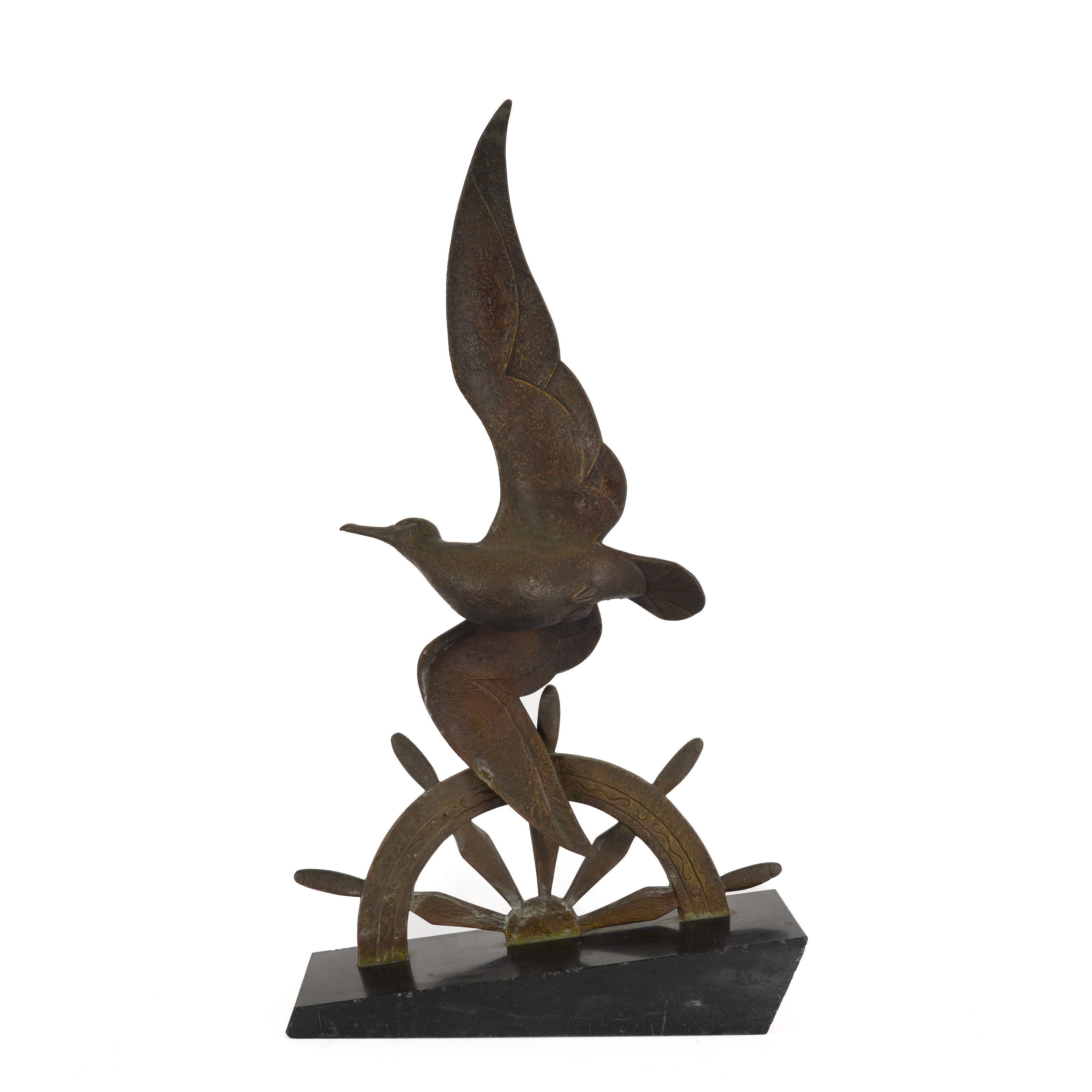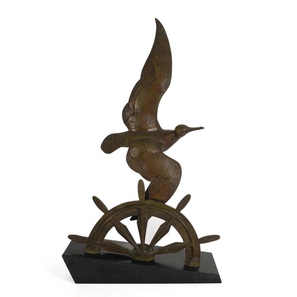 LAPEROU (?): AN ART DECO BRONZE FIGURE OF A SEAGULL FLYING ABOVE A SHIP’S WHEEL