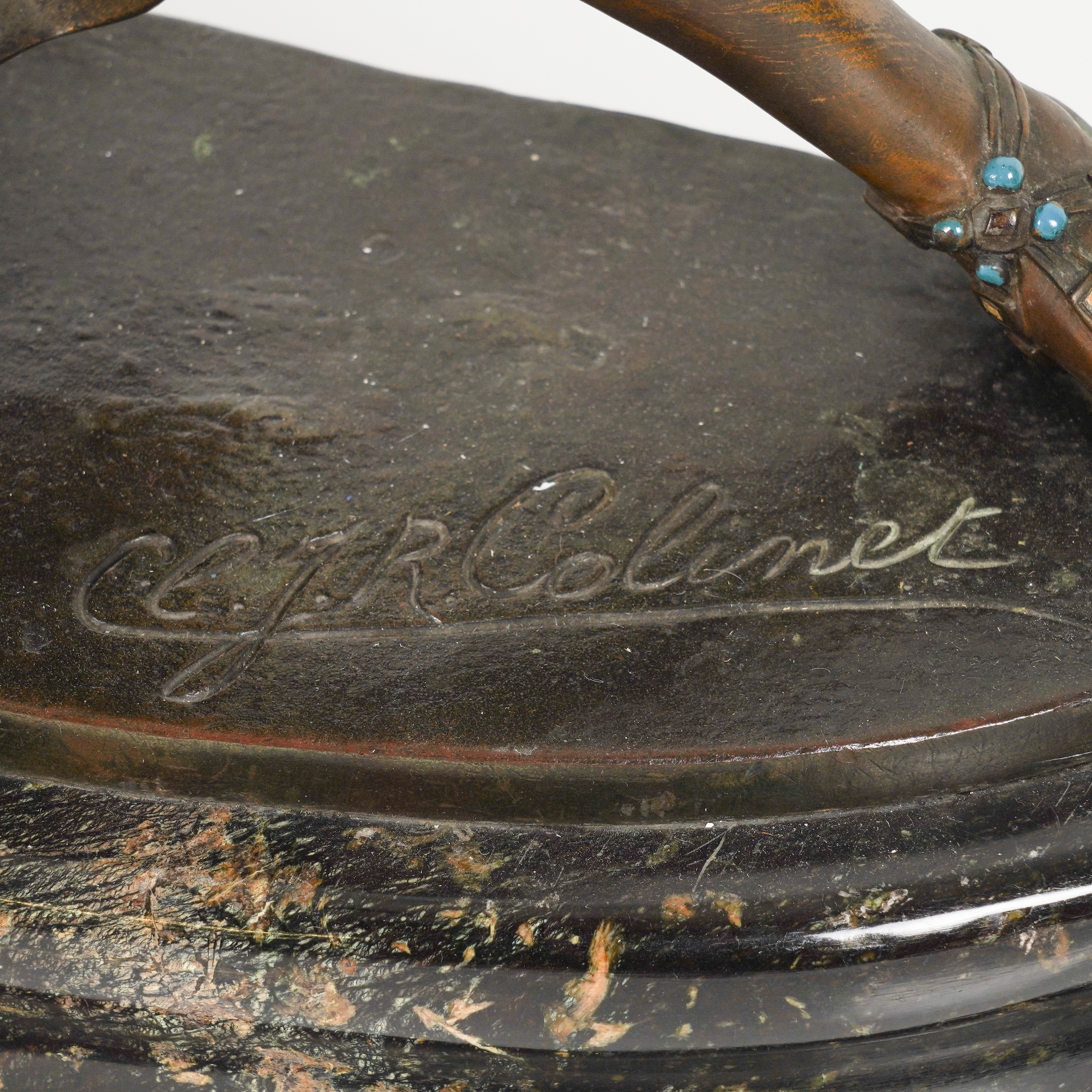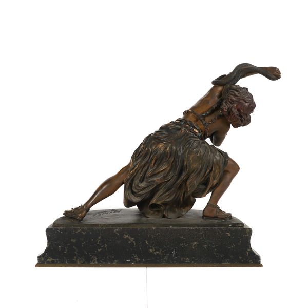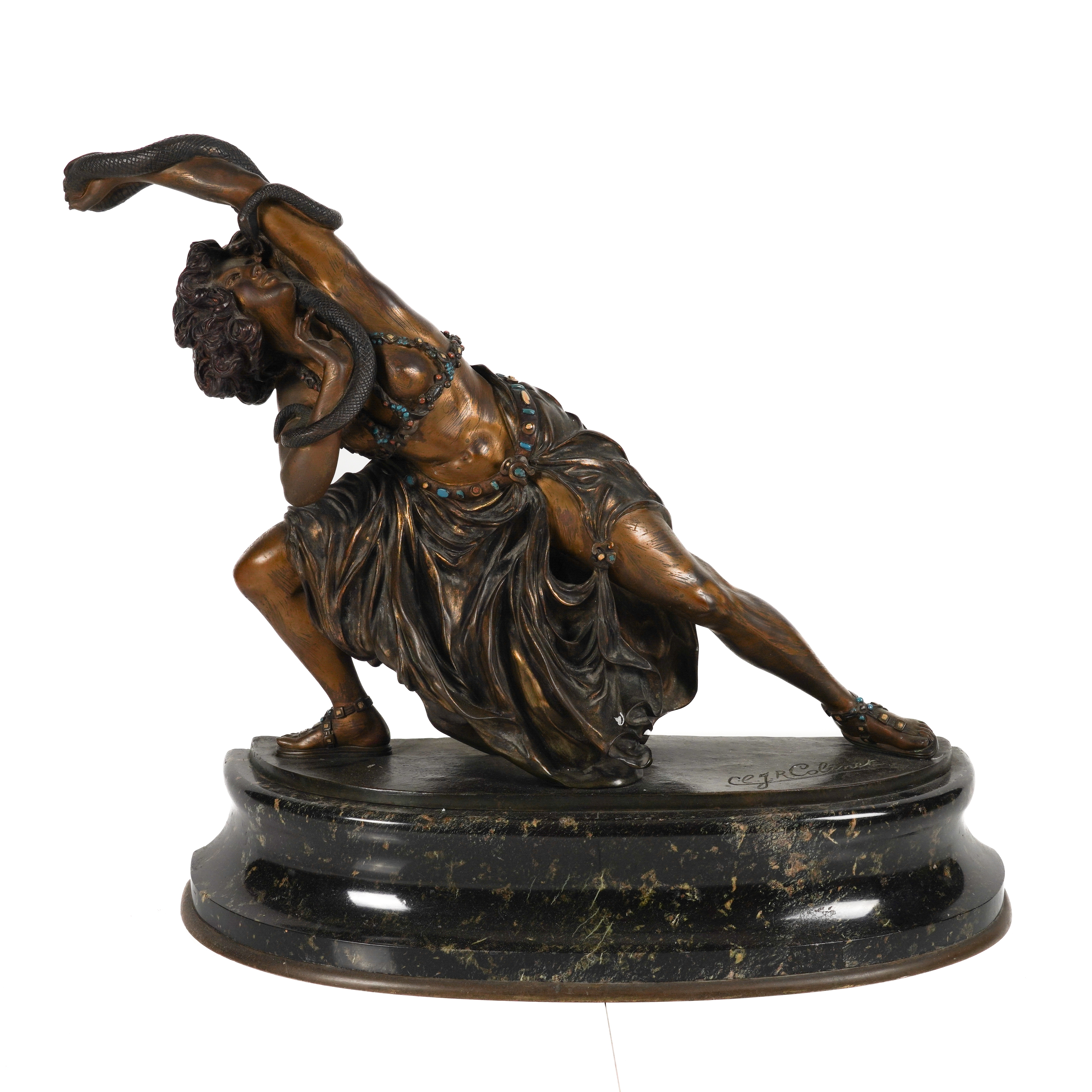 Modelled with a serpent, cast with signature C J R Colinet, mounted on a black fossil marble plinth, 61cm wide and 55cm high
