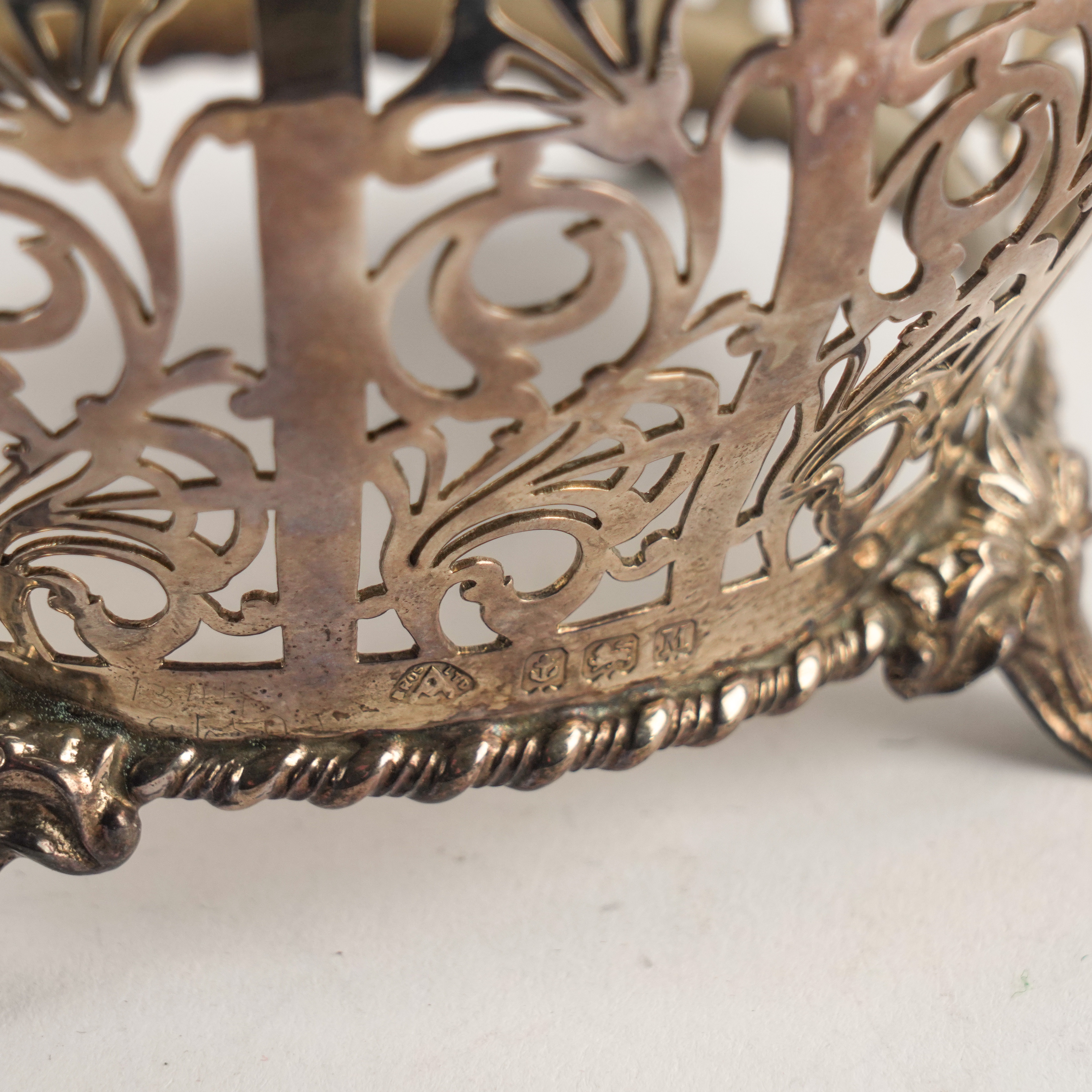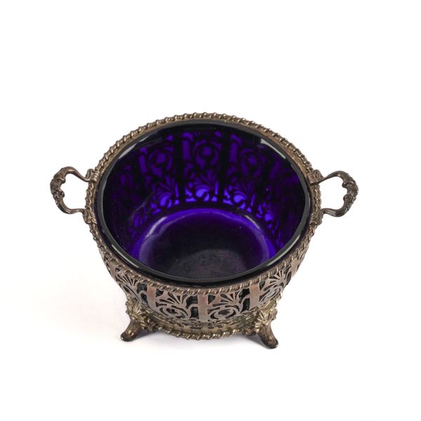 Of compressed circular form with scroll pierced decoration within gadrooned rims, raised on four swept feet, diameter including handles 15cm, Birmingham 1936, weight 170 grams, with a blue glass liner