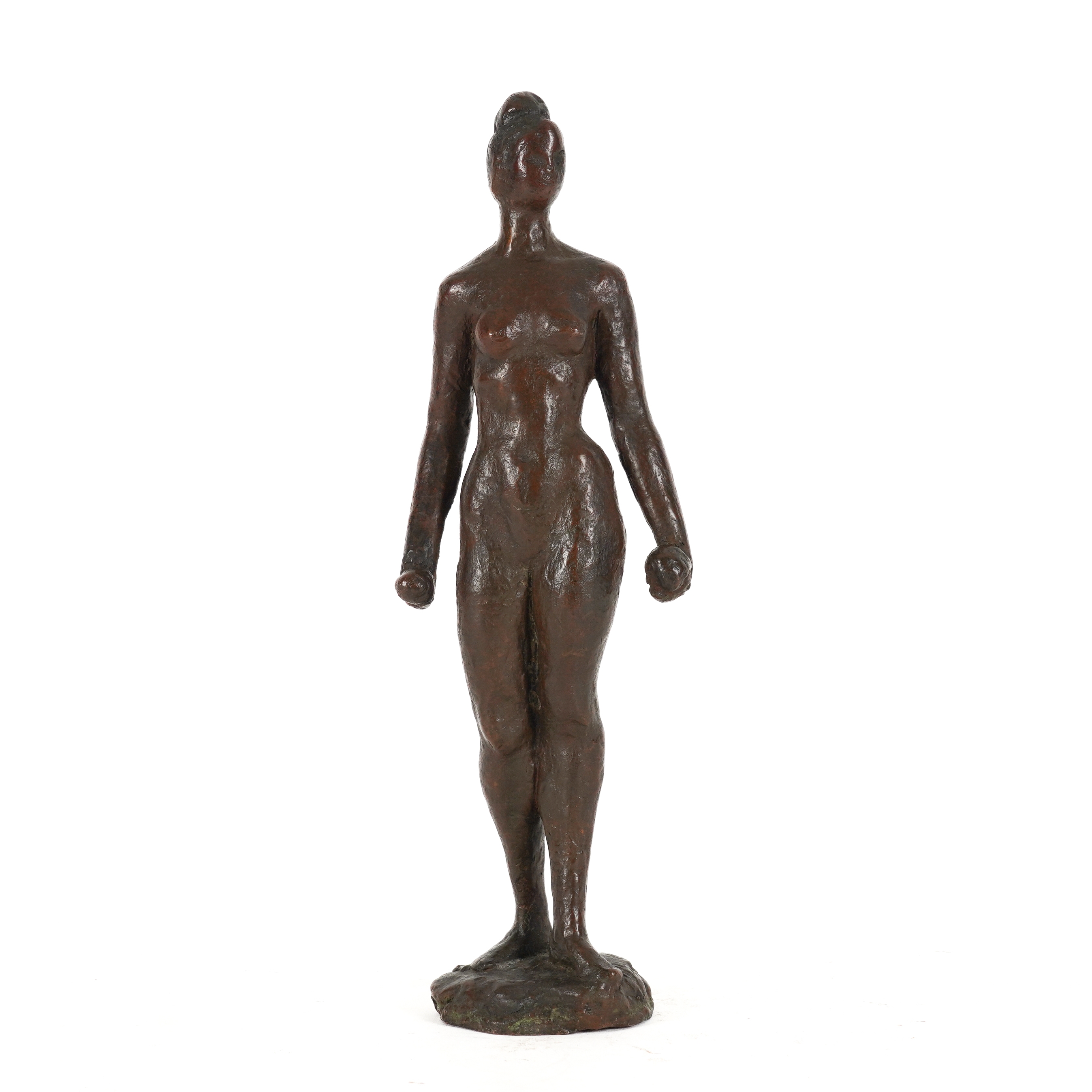 The figure standing with one leg forward, with brown patination, on textured base inscribed with the monogram PC, 25.5cm high