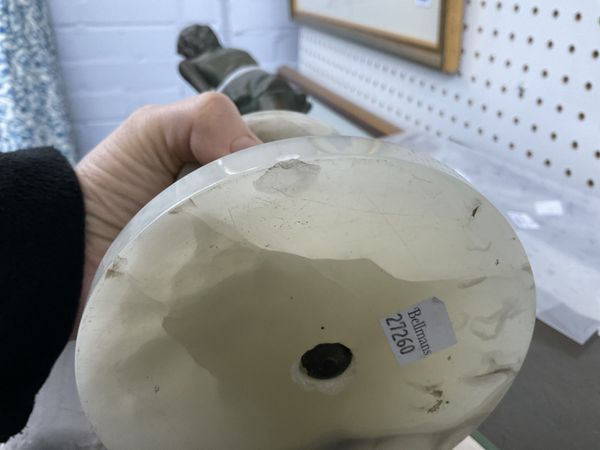 Modelled with eyes closed, signed to the bronze base, on a pale green onyx socle base, 36.5cm high